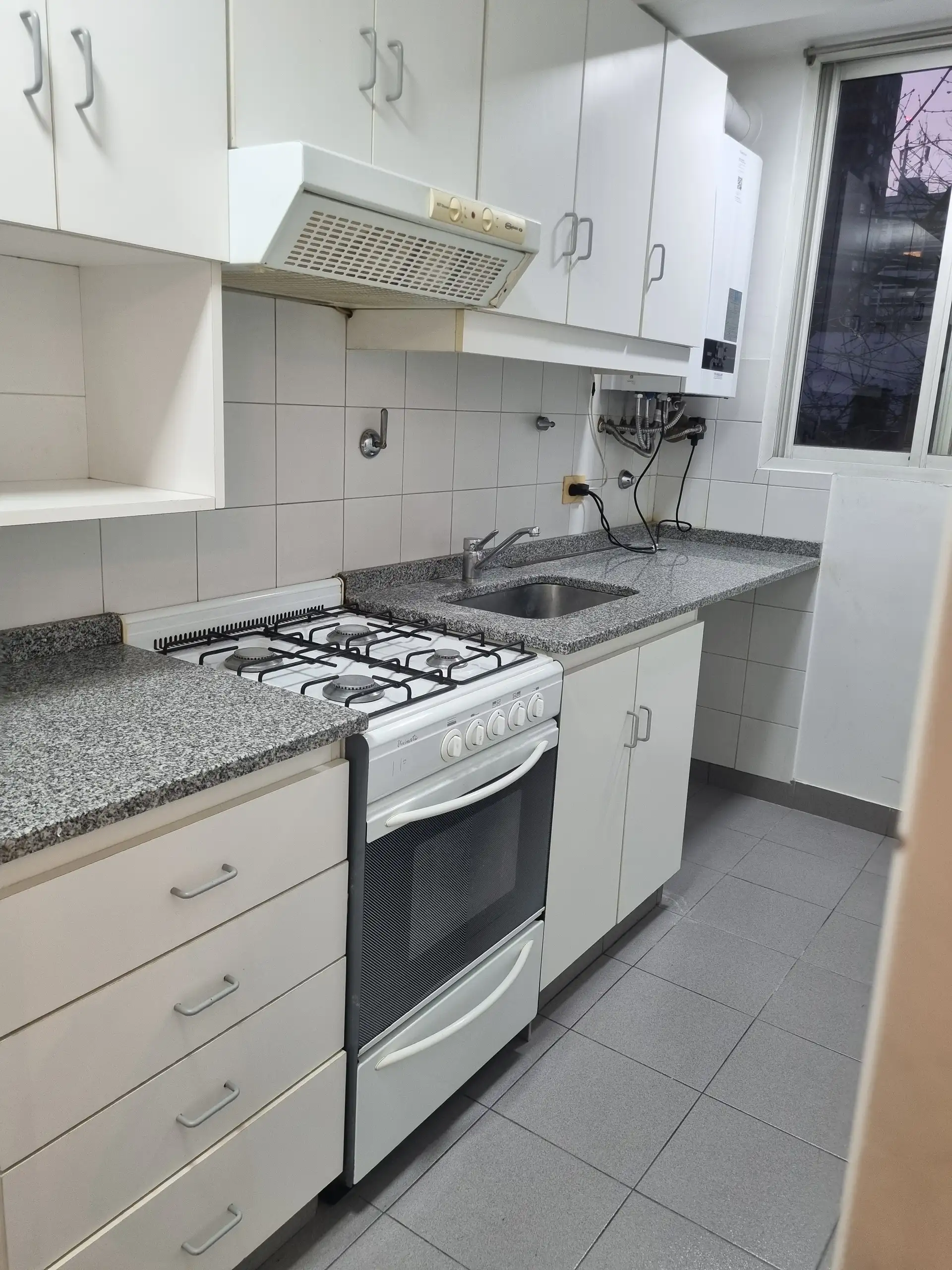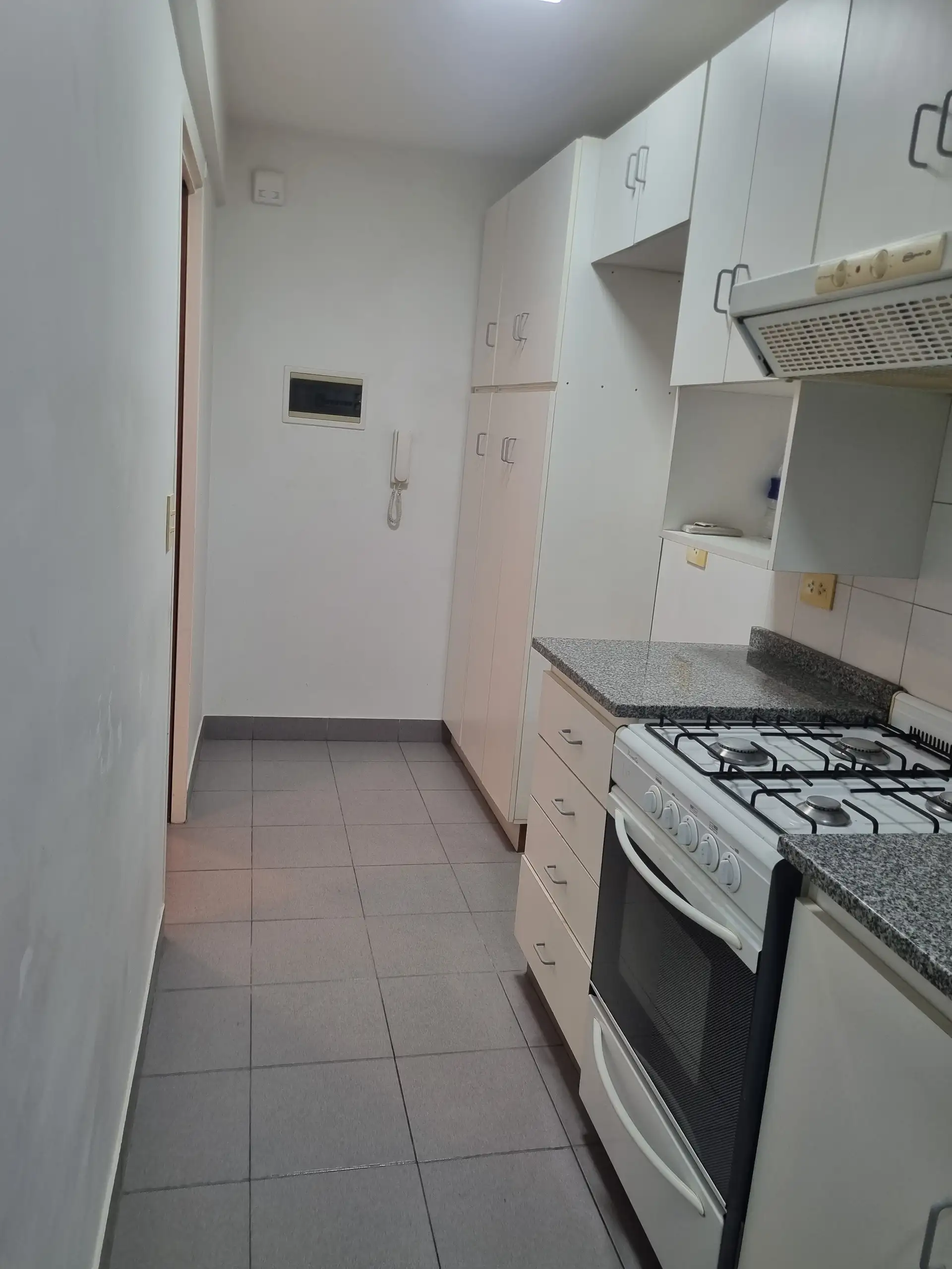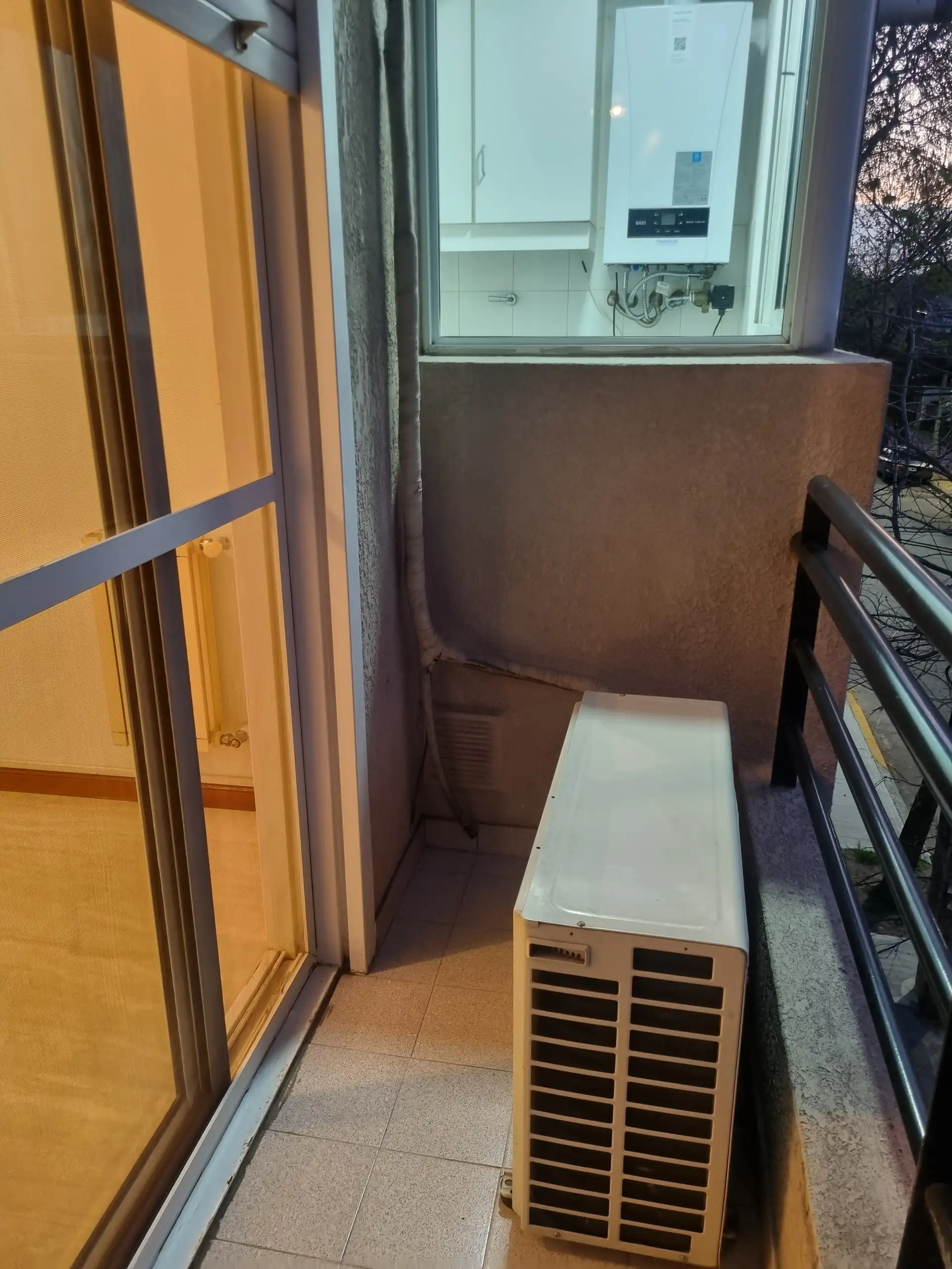 Apartamento semipiso de 2 ambientes em Martínez, com varanda de frente e de fundos. Possui living com piso cerâmico e ar-condicionado, cozinha equipada com móveis sob e sobre a bancada e área de serviço integrada, além de dormitório com piso cerâmico, armário e saída para a varanda. O banheiro é completo e todos os ambientes têm aquecimento individual por radiadores. Inclui vaga de garagem coberta (fixa). Não aceita animais.