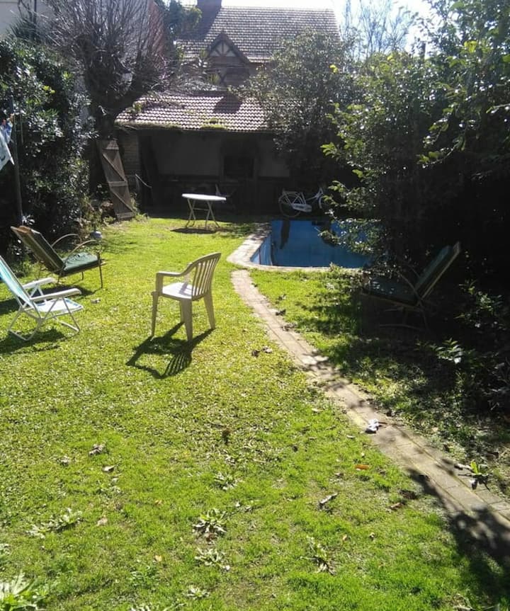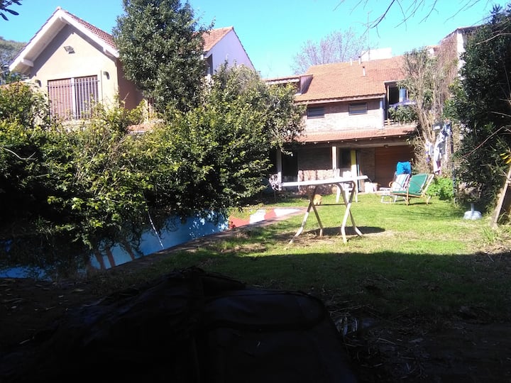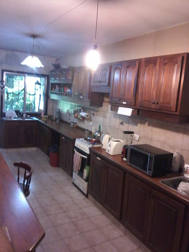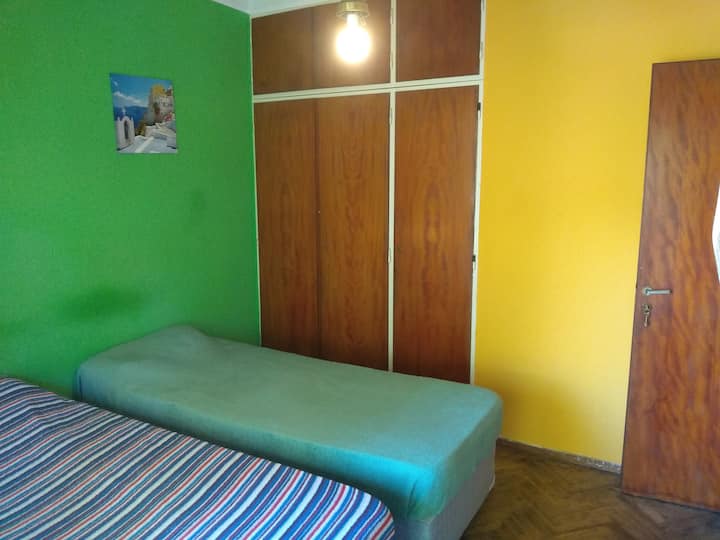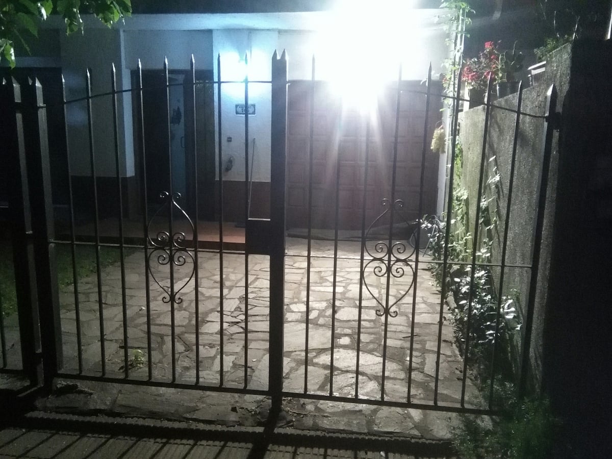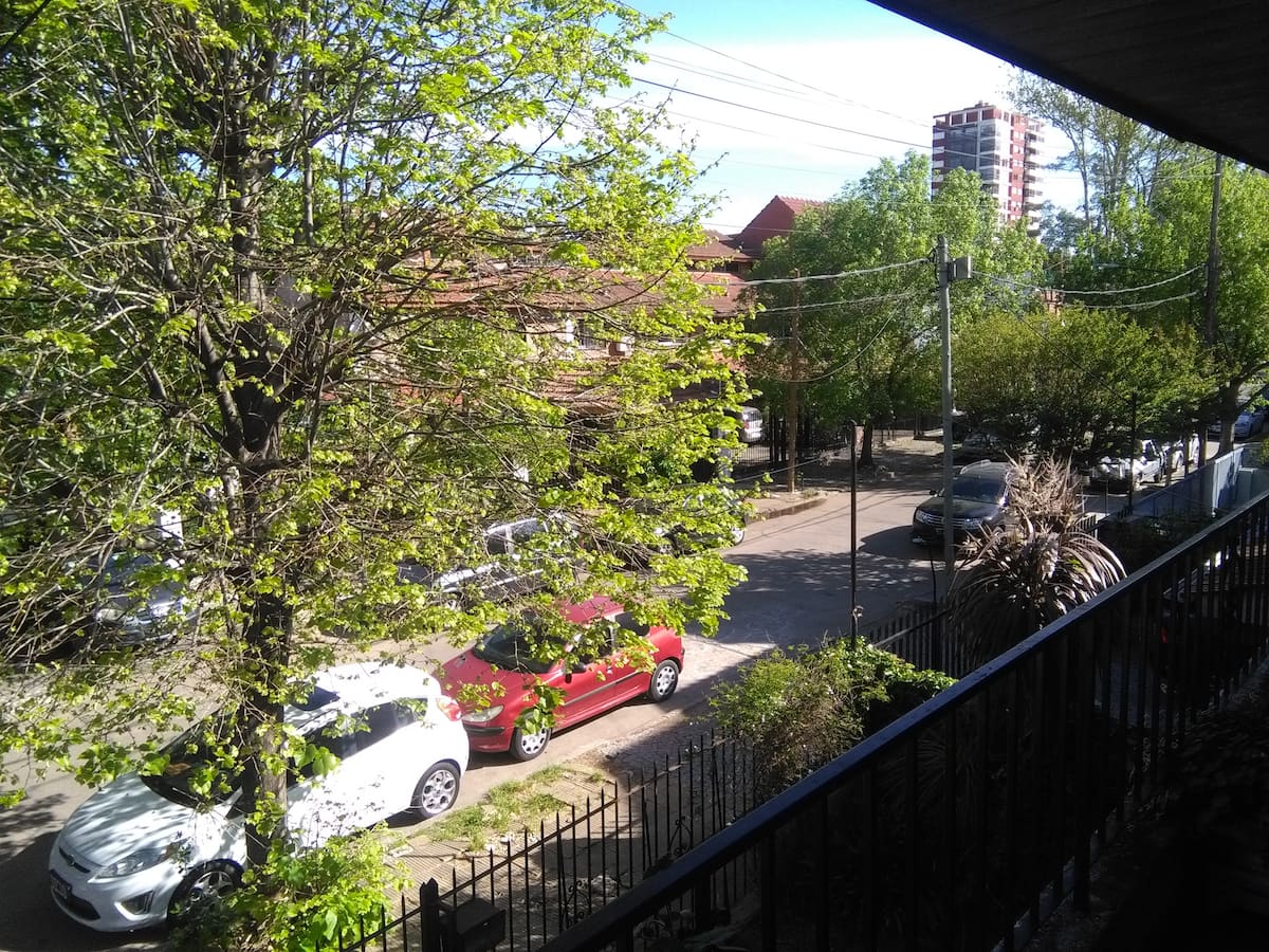 Quarto com boa iluminação, janela grande com varanda voltada para a rua, em bairro residencial. Cozinha grande com geladeira, freezer, forno e micro-ondas, além de torradeira elétrica. Há área de lavanderia com máquina de lavar automática e varal, e jardim com área de churrasco e churrasqueira. Banheiro com lavabo e banheiro completo. Estão disponíveis cozinha, sala, lavanderia e jardim compartilhados; a propriedade fica a 5 quadras da estação do trem FC Mitre e a 3 da Av. Santa Fe, com linhas d
