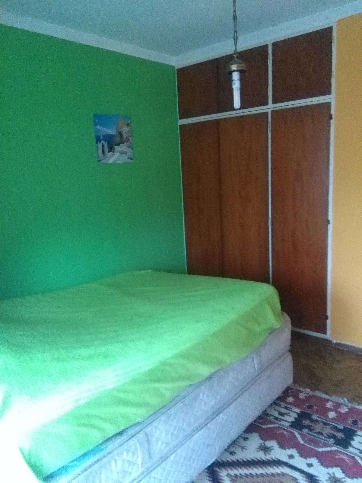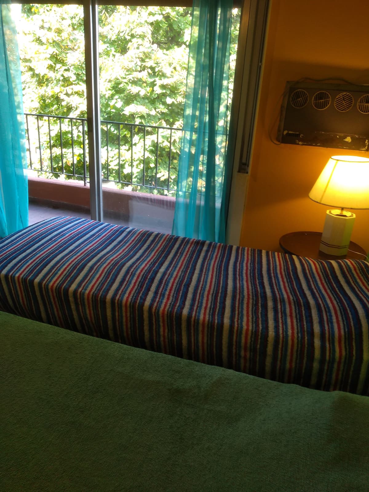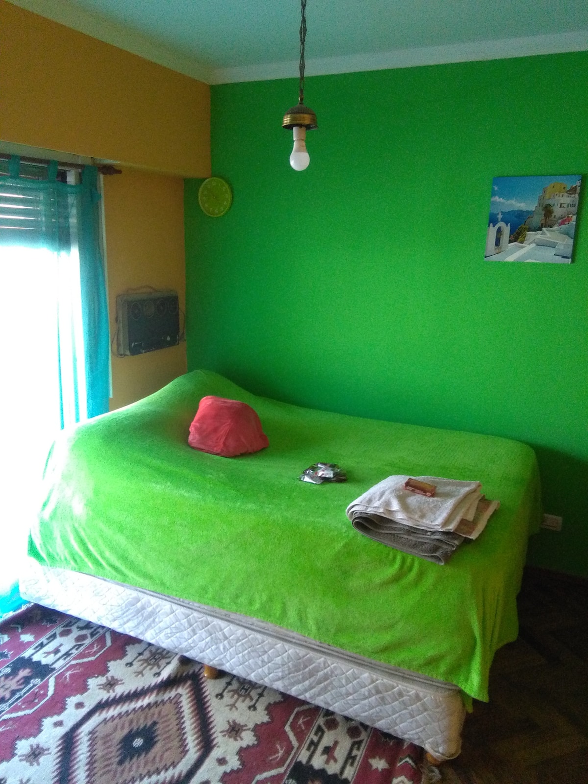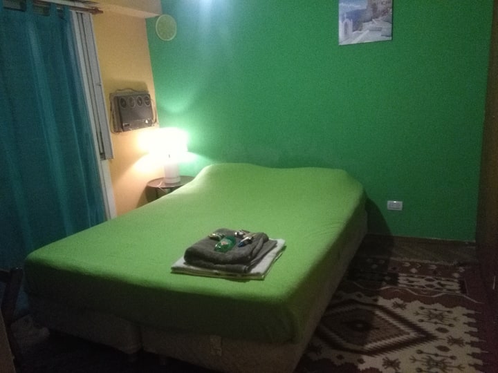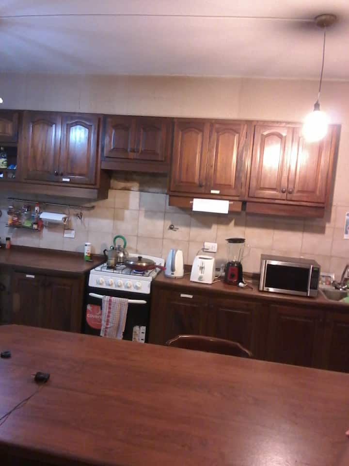 Quarto com boa iluminação, janela grande com varanda voltada para a rua, em bairro residencial. Cozinha grande com geladeira, freezer, forno e micro-ondas, além de torradeira elétrica. Há área de lavanderia com máquina de lavar automática e varal, e jardim com área de churrasco e churrasqueira. Banheiro com lavabo e banheiro completo. Estão disponíveis cozinha, sala, lavanderia e jardim compartilhados; a propriedade fica a 5 quadras da estação do trem FC Mitre e a 3 da Av. Santa Fe, com linhas d