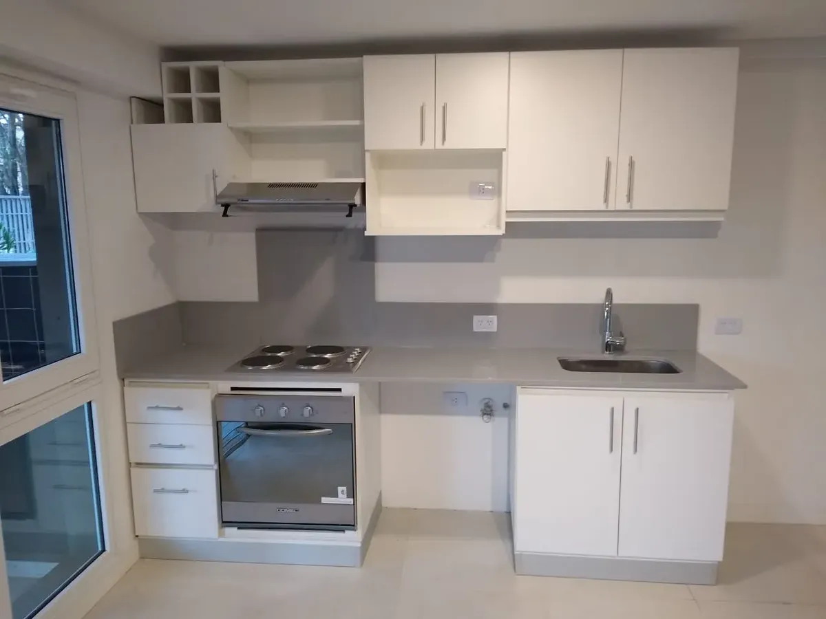 Apartamento em Martínez (La Pasionaria), de 2 ambientes, no térreo, com jardim privativo. Sala de jantar com cozinha integrada, área de serviço (lavadero) e lavabo. Dormitório em suíte com closet e banheiro completo. Janelas do tipo grande vão de conexão com a galeria e ar-condicionado.