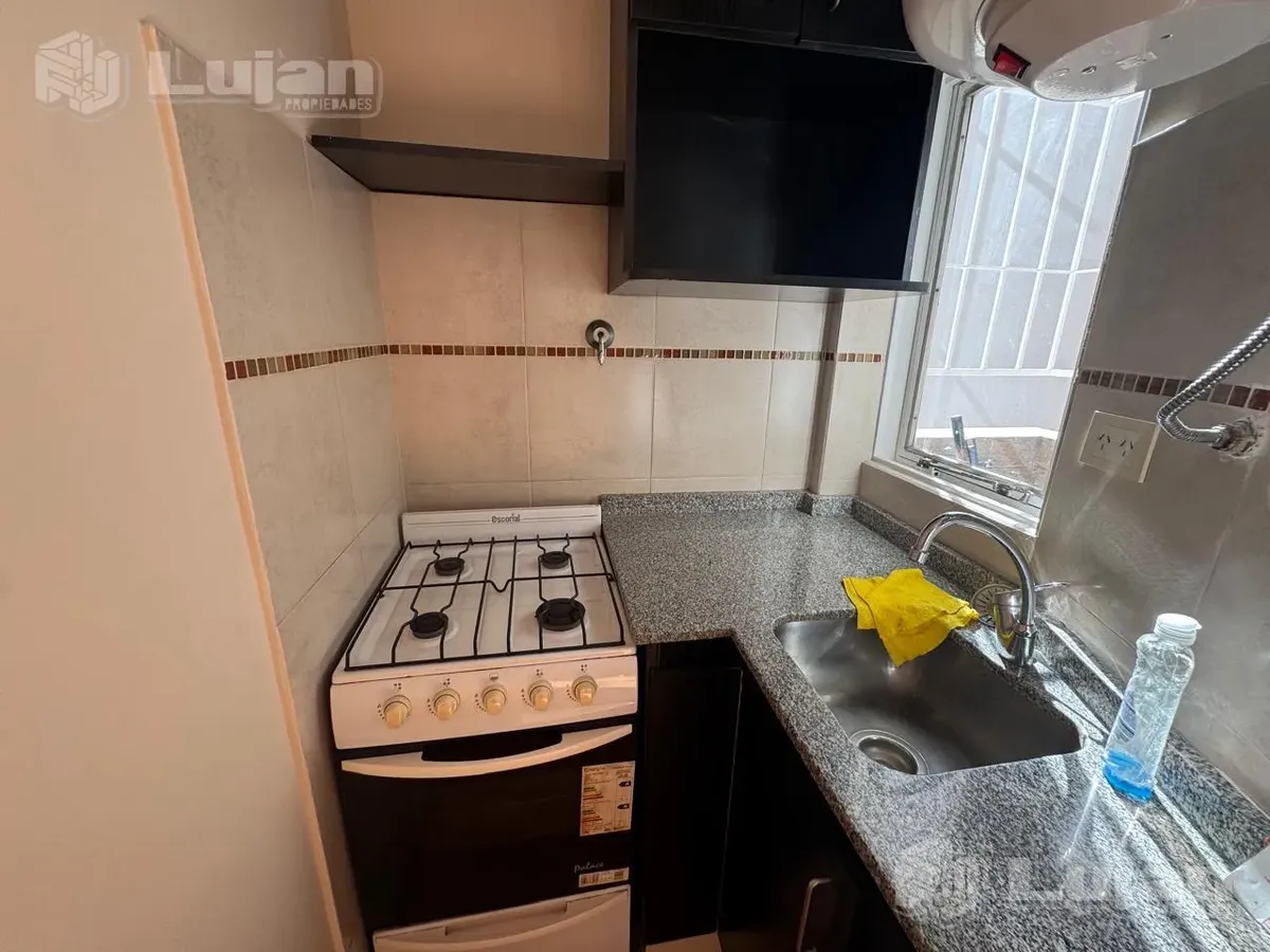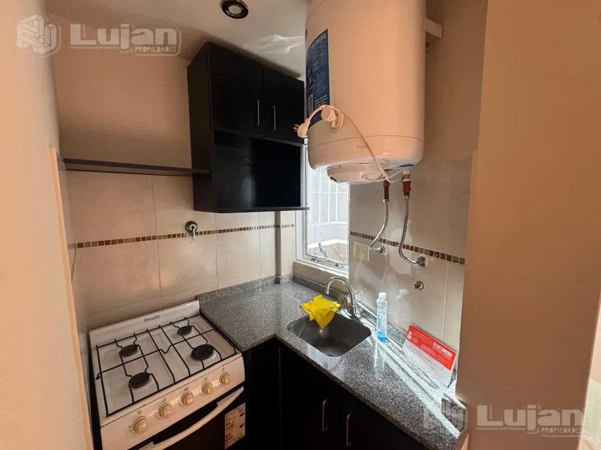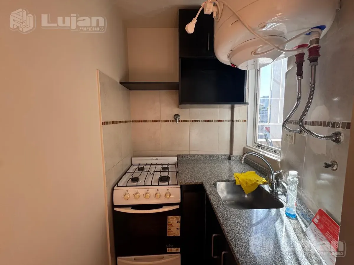 Apartamento de dois ambientes em Mataderos, com 1 quarto, varanda e cozinha com área semi-incorporada. O living-comedor tem aproximadamente 4 x 3,50 m, piso flutuante claro e saída direta para a varanda por porta de vidro com persiana plástica. A cozinha mede aproximadamente 1,40 x 1,30 m e tem móveis sob a bancada, armário aéreo, torneira monocomando e fogão a gás Escorial; há ainda aquecedor elétrico (termoacumulador) Eco Termo. A varanda mede 4,30 x 1 m, tem grades de proteção e pia para área