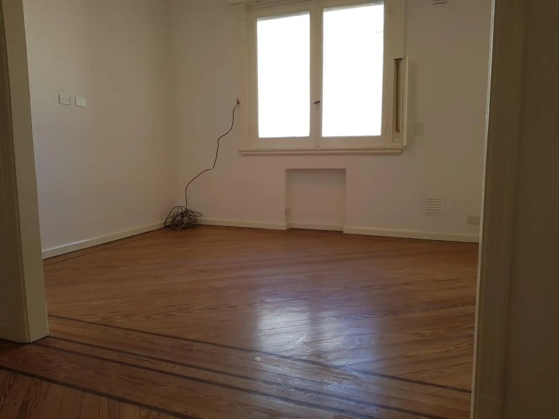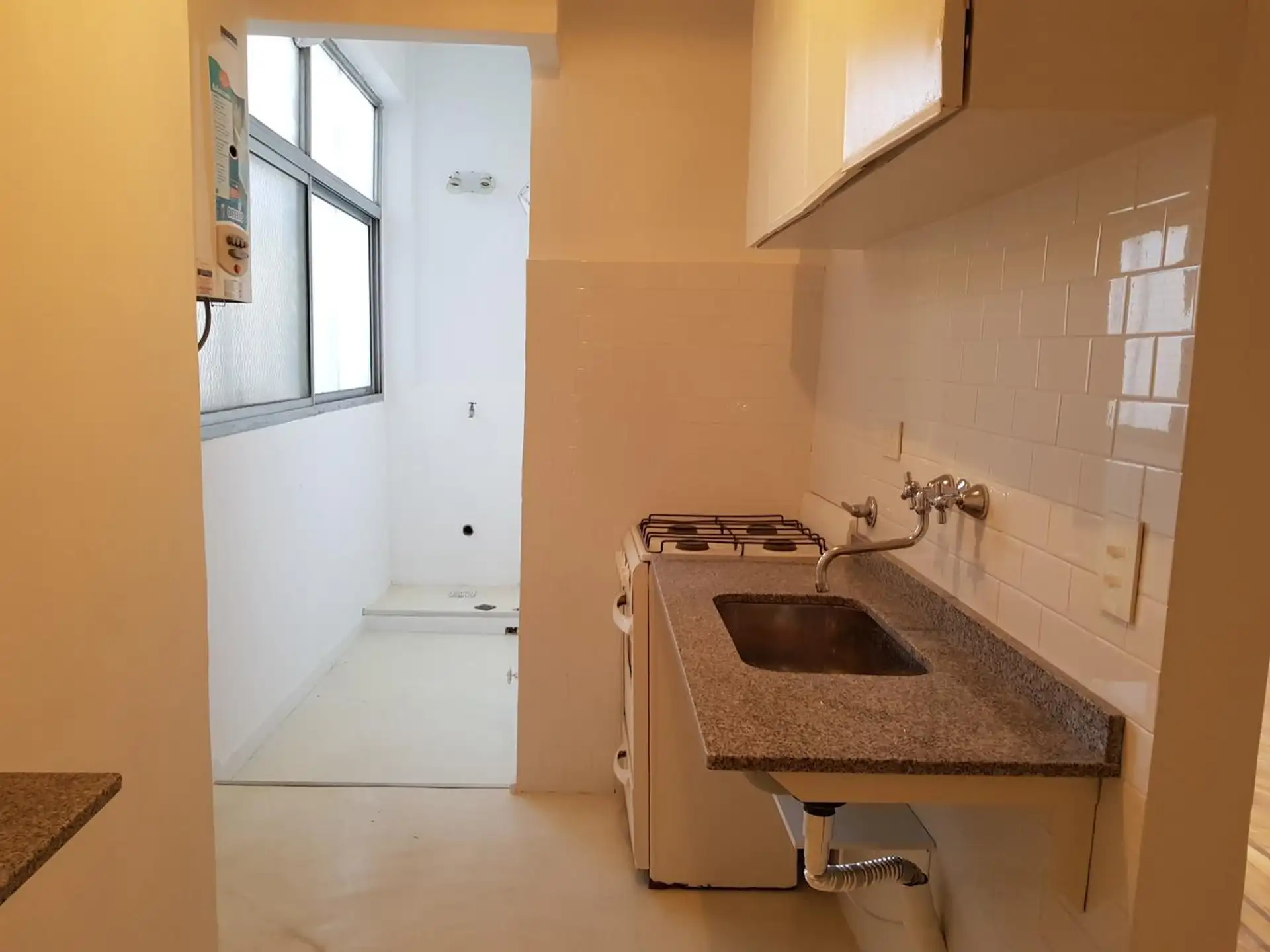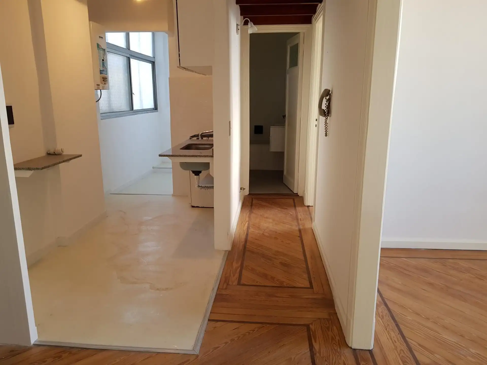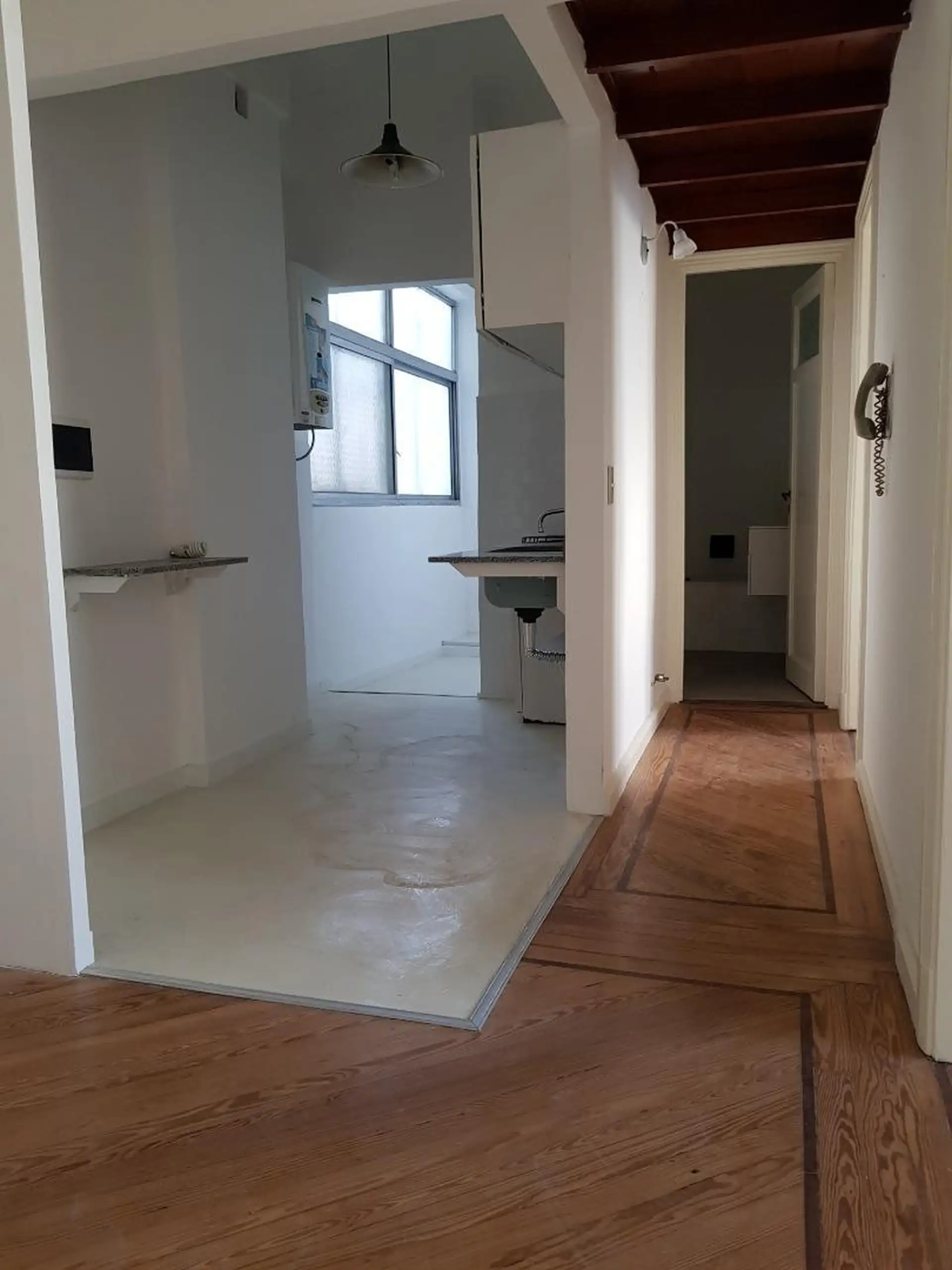 Apartamento de 2 ambientes no 6º andar, de fundos, com orientação para SE, em Monserrat. A unidade tem hall de recepção, 2 ambientes de 4 m x 3,20 m cada, corredor para banheiro completo e cozinha com área de lavanderia. Pé-direito alto, despensa no forro do corredor com acesso fácil, unidade totalmente reformada e recentemente repintada, com luminárias novas e piso de parquet em bom estado. Serviços: rede de esgoto e gás. Depósito de 1 mês. Impostos e água a cargo do inquilino.