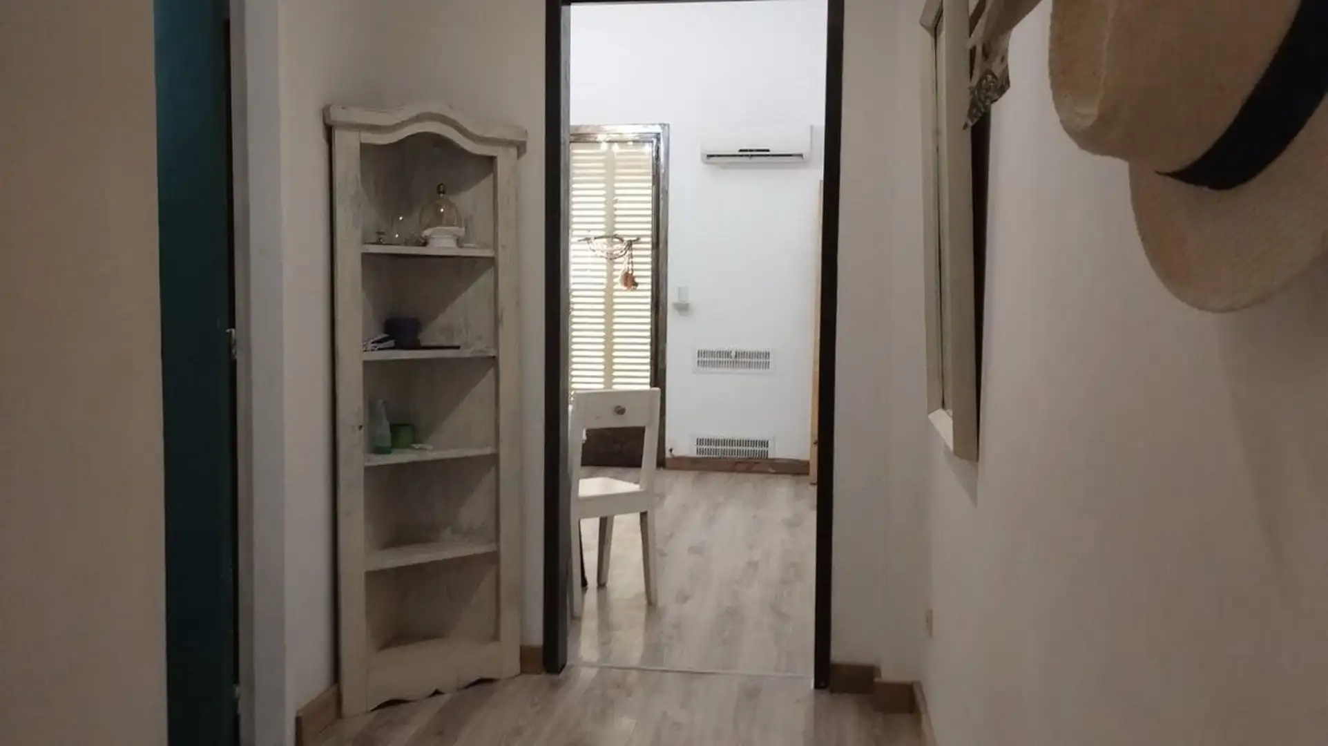 Apartamento de 2 ambientes para aluguel, com 1 quarto, mobiliado, no 2º andar de um edifício de época com elevador. Possui varanda interna, janela voltada para o miolo de quadra e ar-condicionado. Inclui cama de casal, WiFi, banheiro completo com box e piso flutuante.