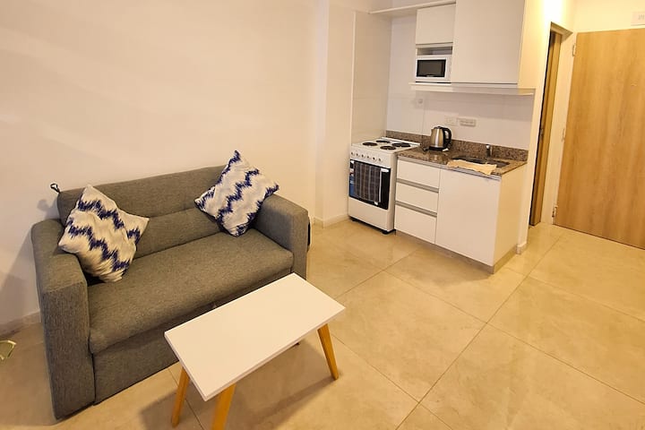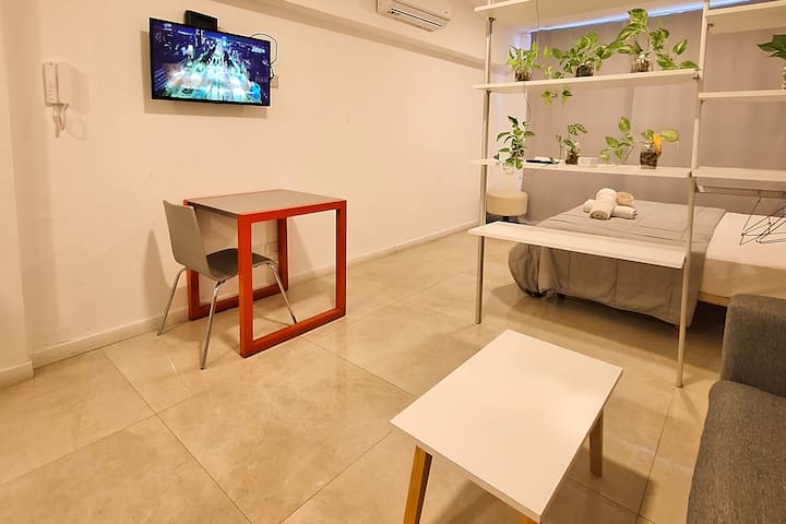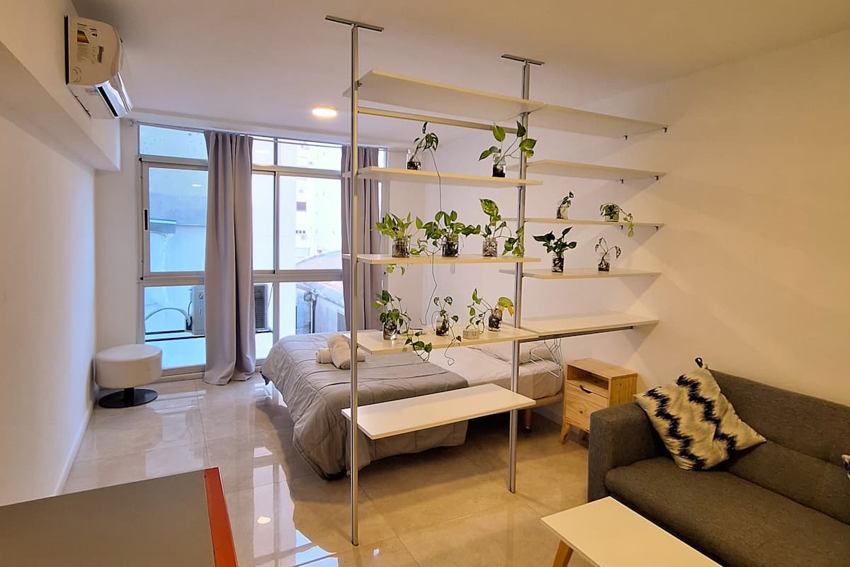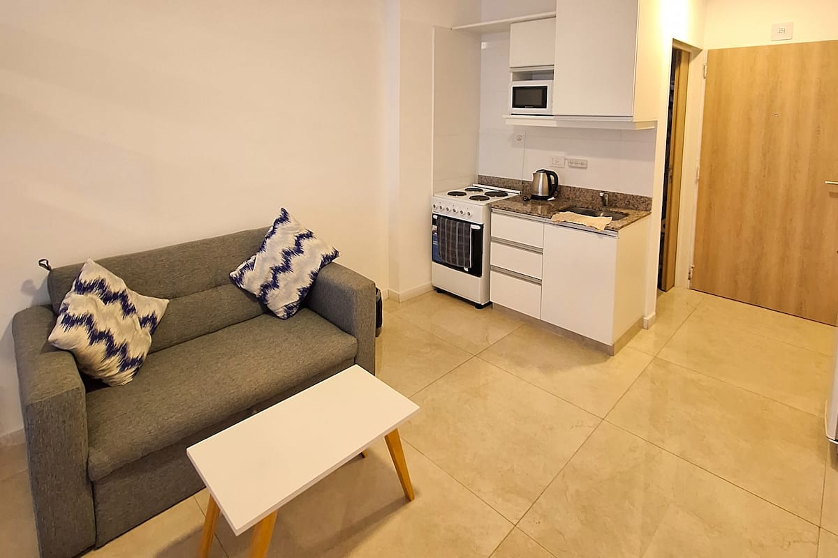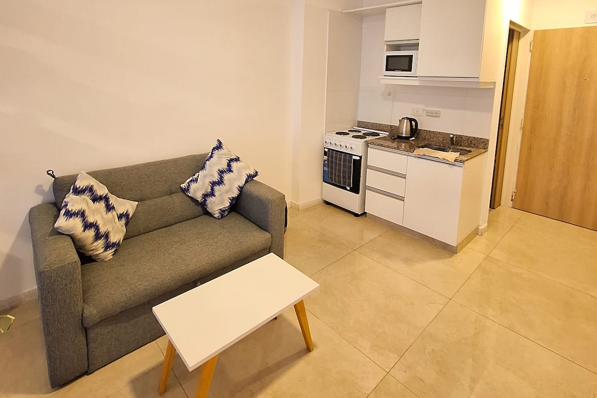 Apartamento com 1 quarto em Monserrat, com área multifuncional, sala de estar e sala de jantar. Cozinha integrada com micro-ondas, torradeira, chaleira elétrica e utensílios de cozinha. O espaço inclui estrutura de cama de solteiro/king e sofá-cama para até 3 pessoas, além de 1 banheiro completo.