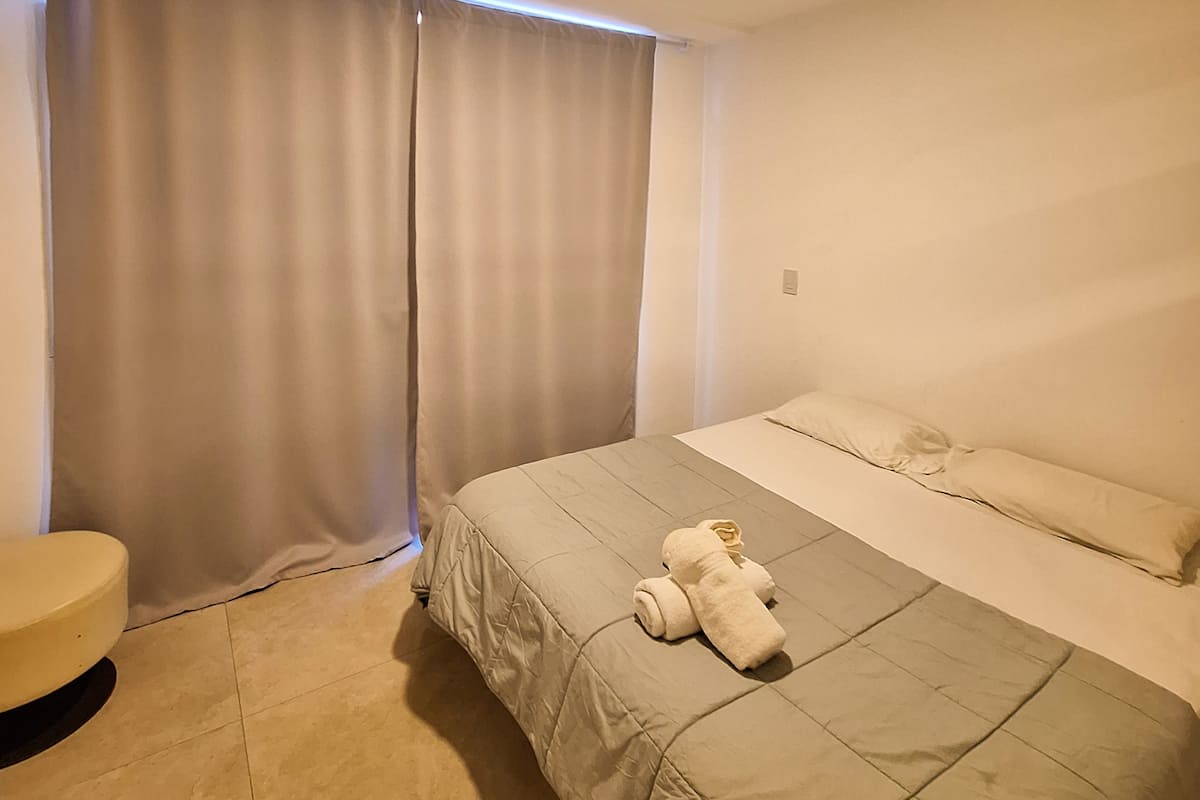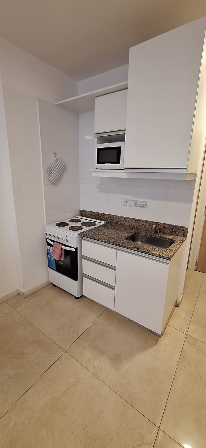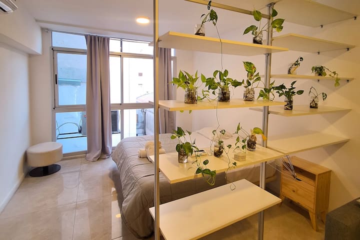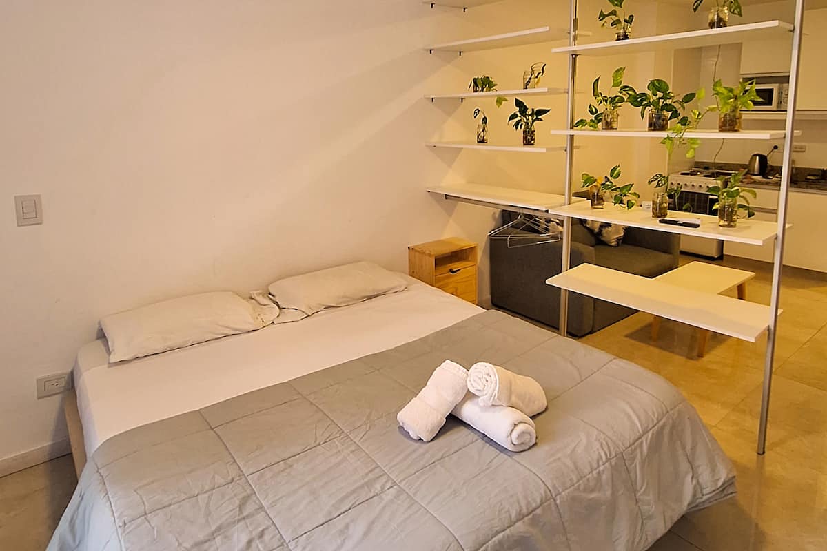 Apartamento com 1 quarto em Monserrat, com área multifuncional, sala de estar e sala de jantar. Cozinha integrada com micro-ondas, torradeira, chaleira elétrica e utensílios de cozinha. O espaço inclui estrutura de cama de solteiro/king e sofá-cama para até 3 pessoas, além de 1 banheiro completo.