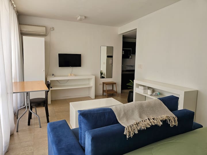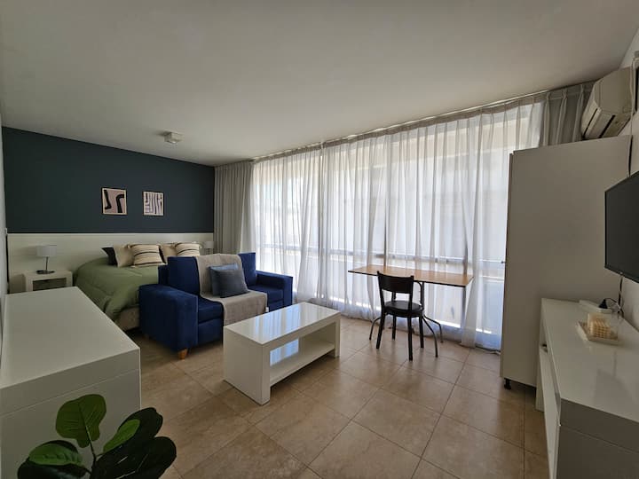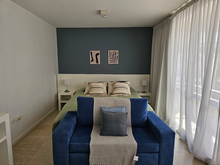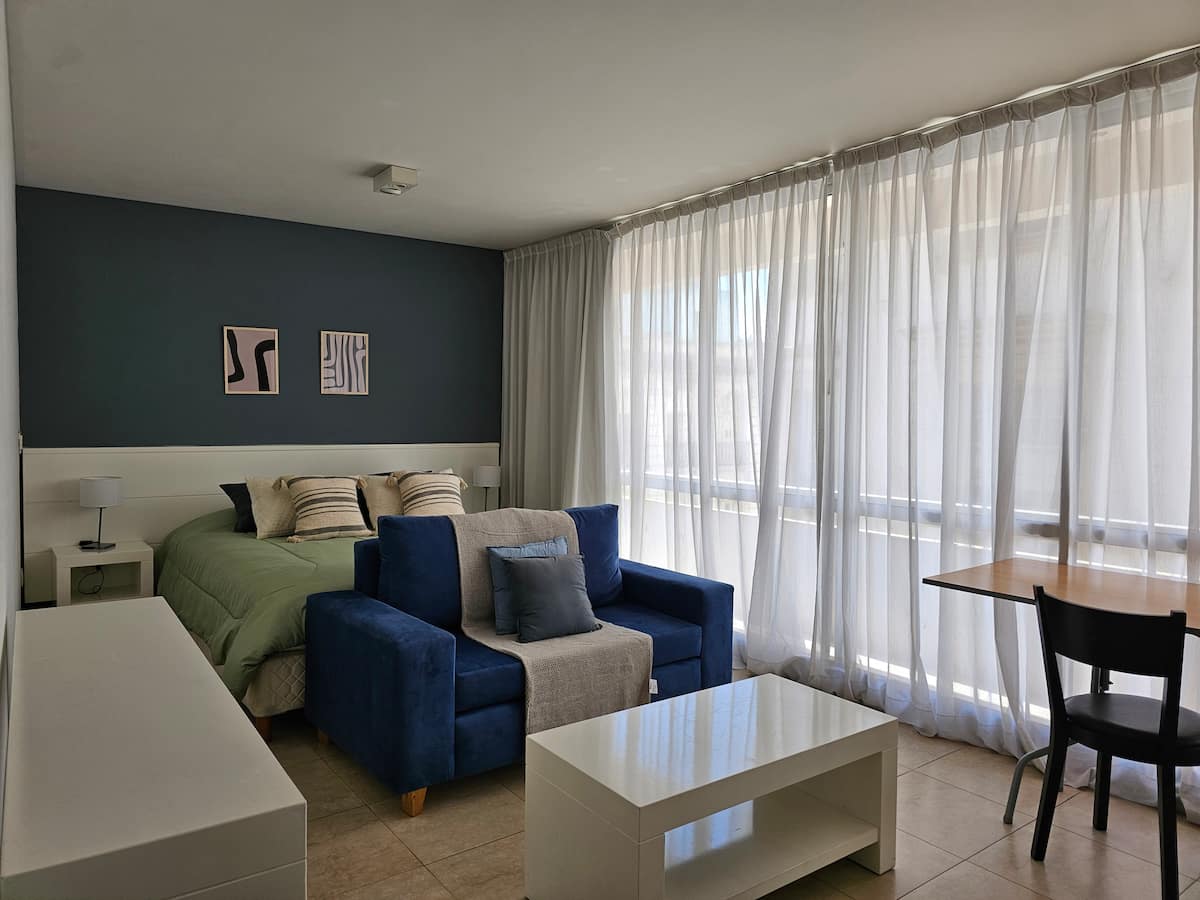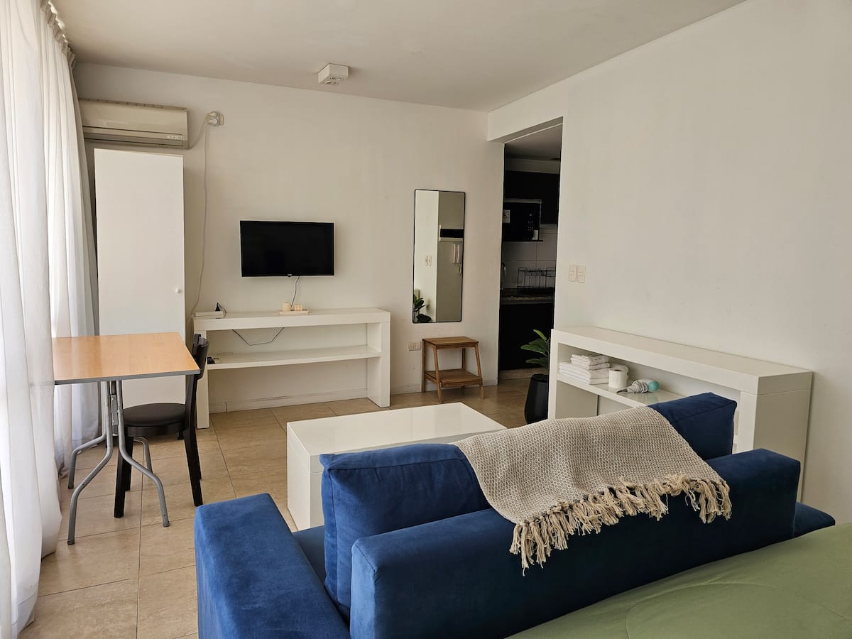 Kitnet mobiliada em Monserrat, quatro quadras do Obelisco. Possui cozinha americana com micro-ondas, louça para duas pessoas, anafe e frigobar, banheiro privativo com banheira e cama king. Inclui TV LED de 32", ar-condicionado, piscina no terraço e área de lavanderia, com roupa de cama e toalhas incluídas. Fica a uma quadra da estação do metrô que atende a linha A e a poucas quadras de pontos como o Teatro Colón, o Congresso Nacional e a Casa Rosada.