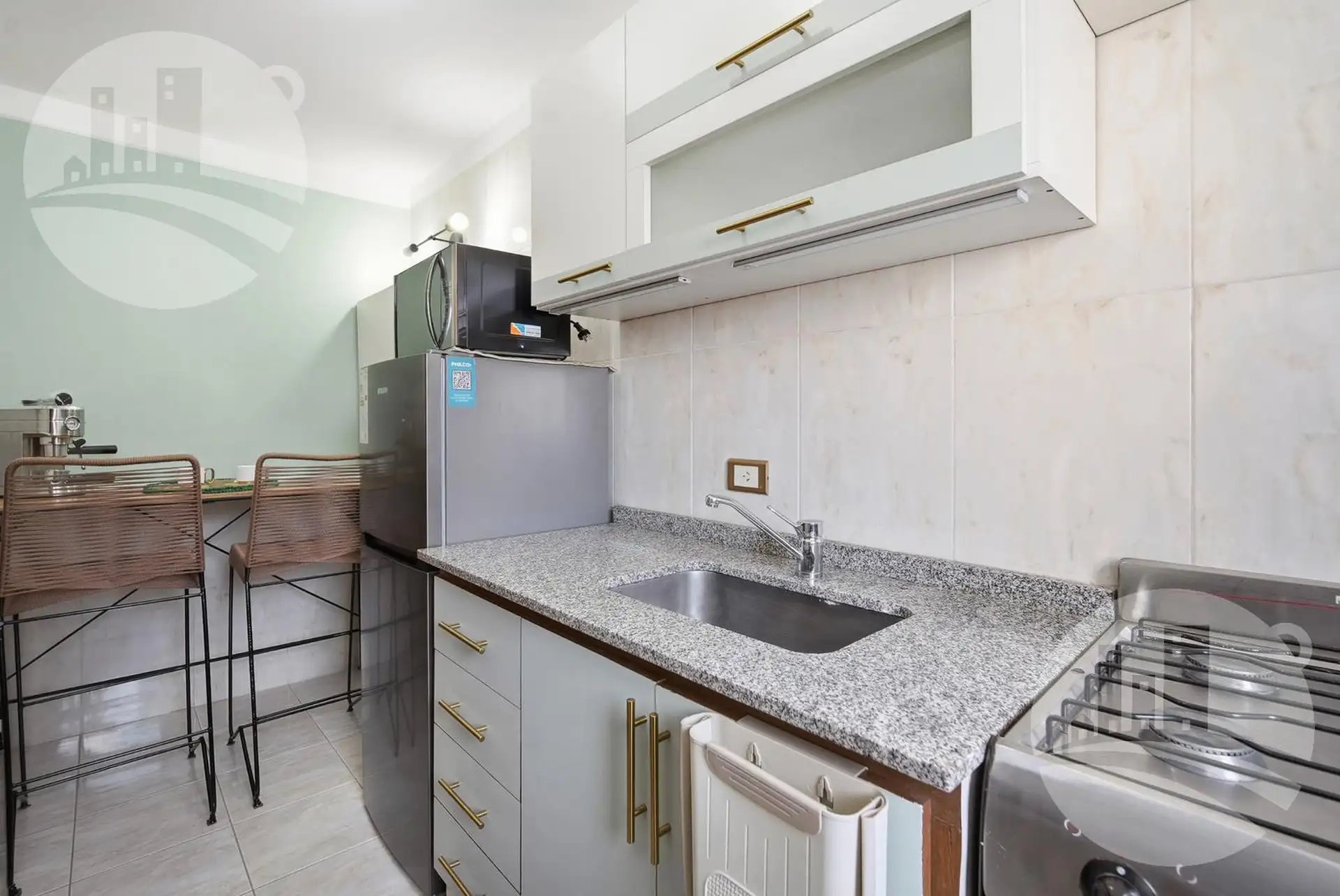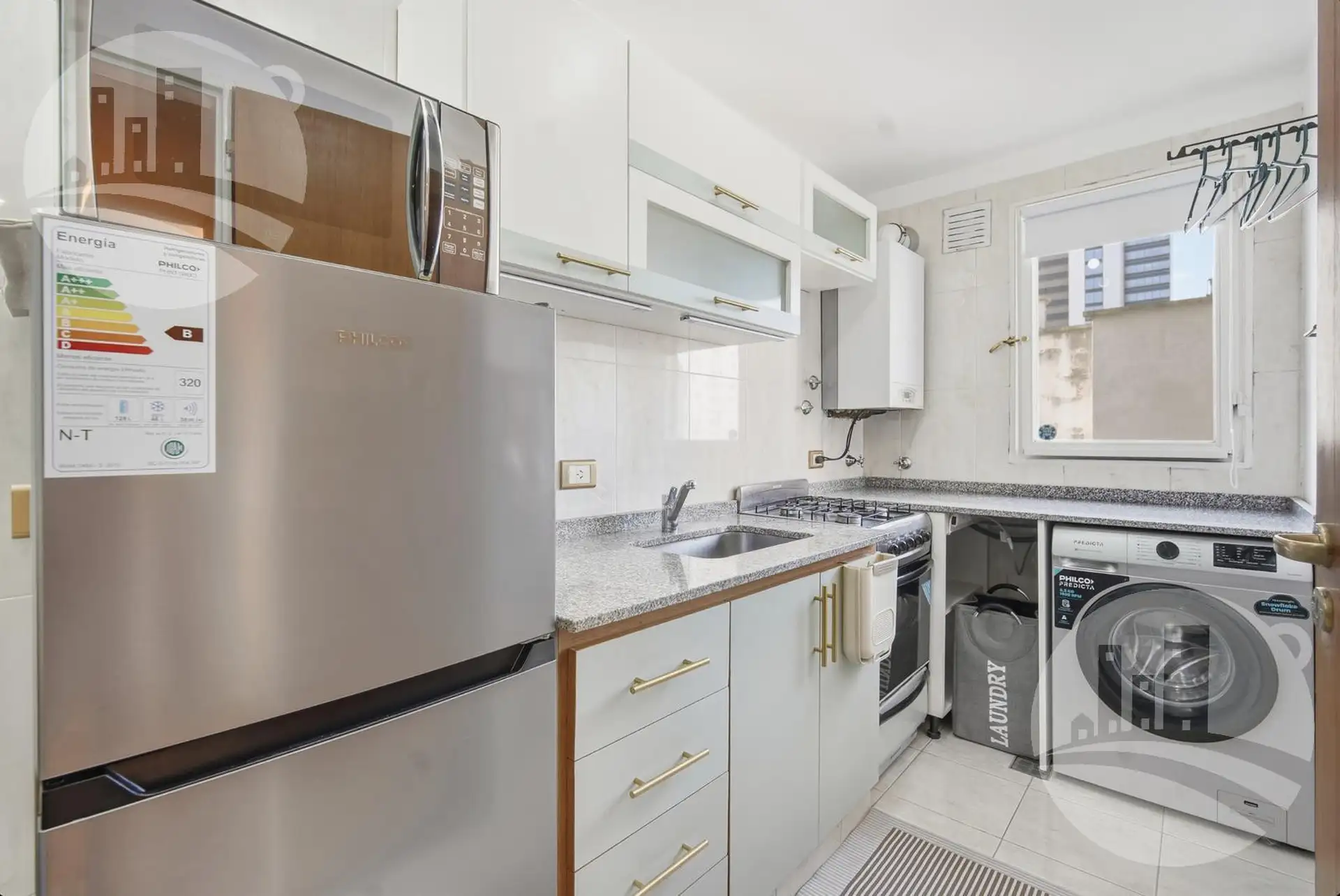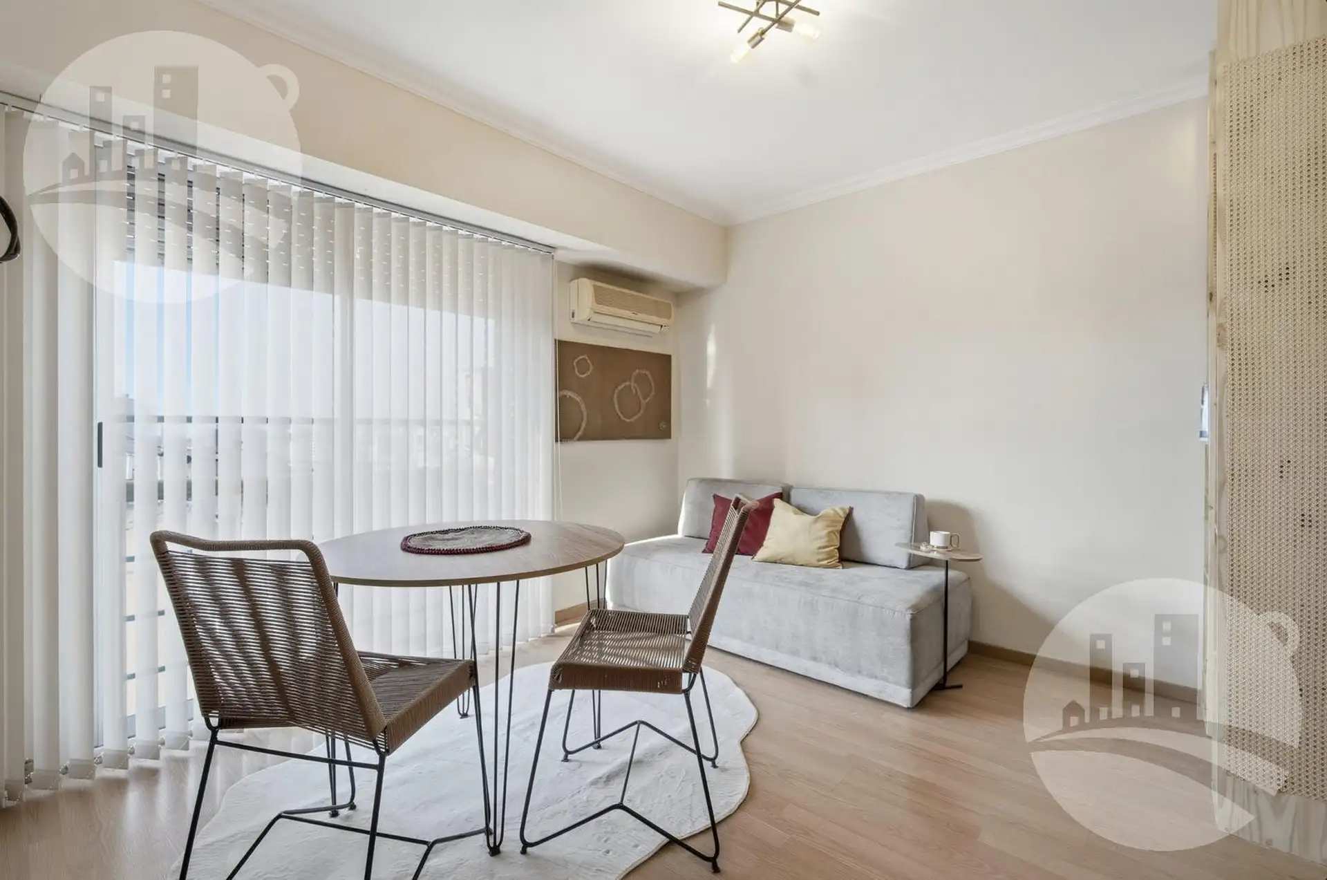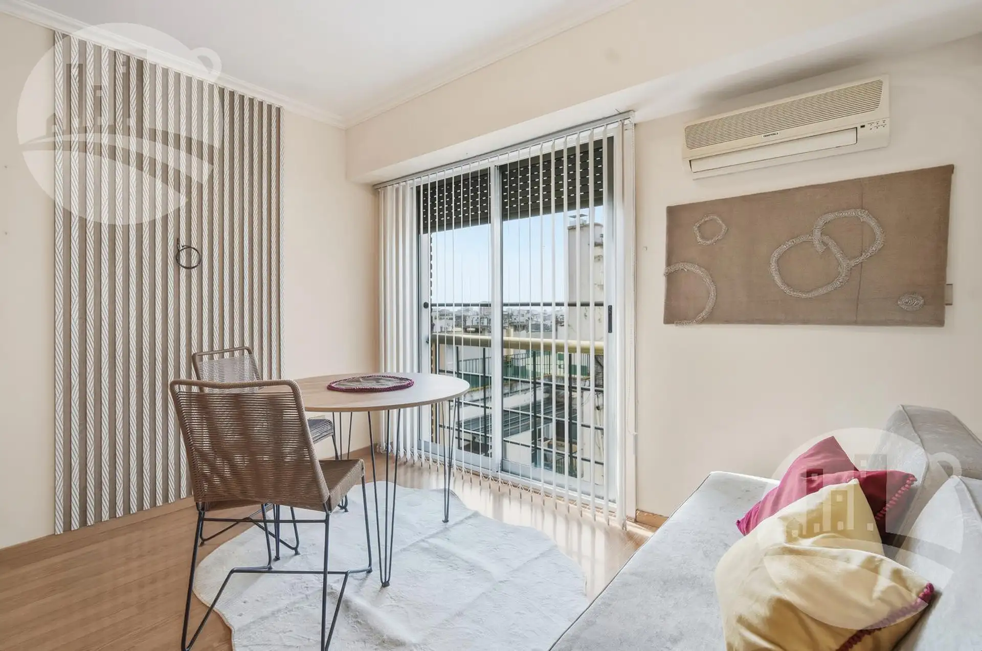 Apartamento de 2 ambientes (1 dormitório) com mobiliário e decoração, no 2º andar alto de uma torre em Monserrat. Possui cozinha independente com desayunador/comedor diário, gás natural e caldeira dual para água quente e aquecimento por piso radiante individual, além de amplo armário e banheiro completo com banheira. Inclui ar-condicionado frio/calor. O condomínio tem baixas expensas que incluem Wi-Fi e água; contrato por 12, 24 ou 36 meses. O preço é acrescido de serviços (energia elétrica, gás