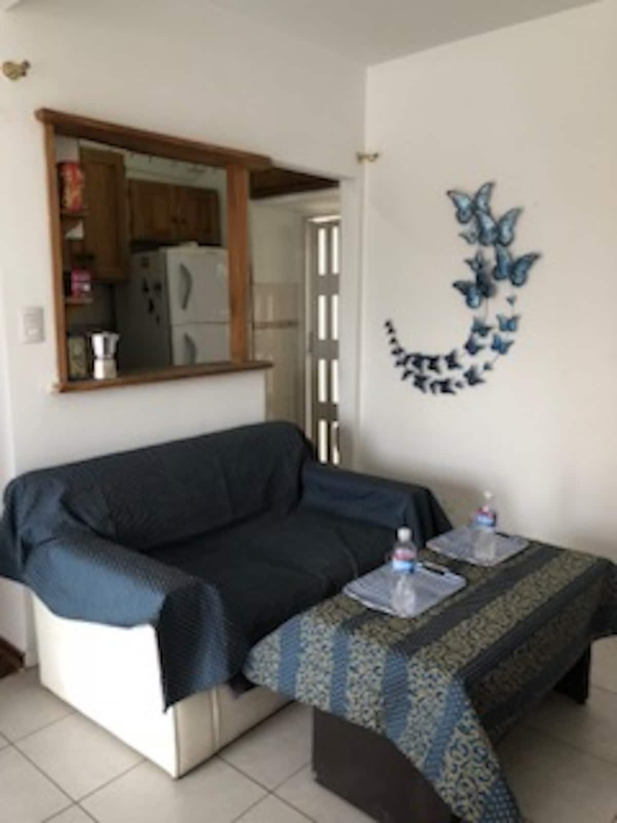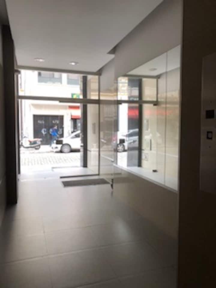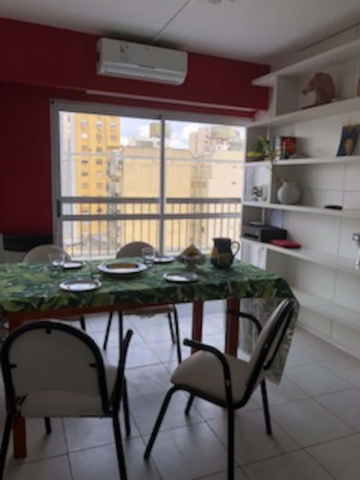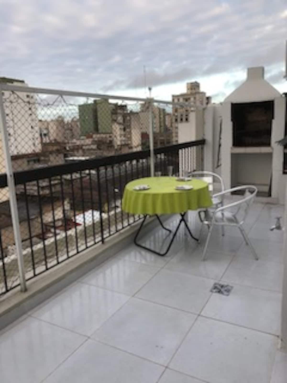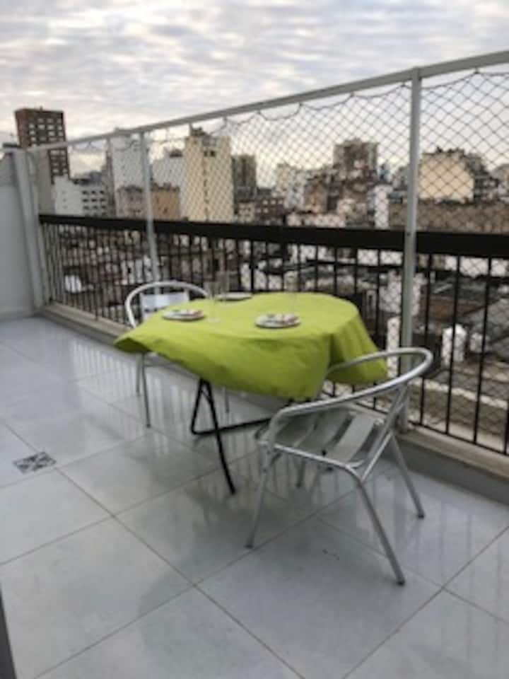 Apartamento de 2 ambientes em Monserrat, com 1 dormitório e sala. Conta com janelas amplas, terraço-balcão privativo e vista panorâmica em andar alto. Tem ar-condicionado frio e aquecimento e fornece uma área de terraço com iluminação, mesa e cadeiras. O condomínio não é mencionado.