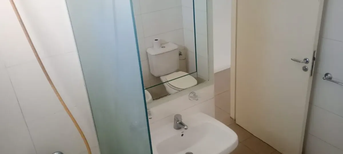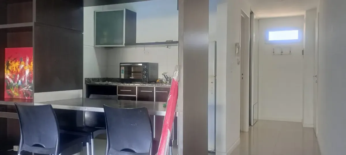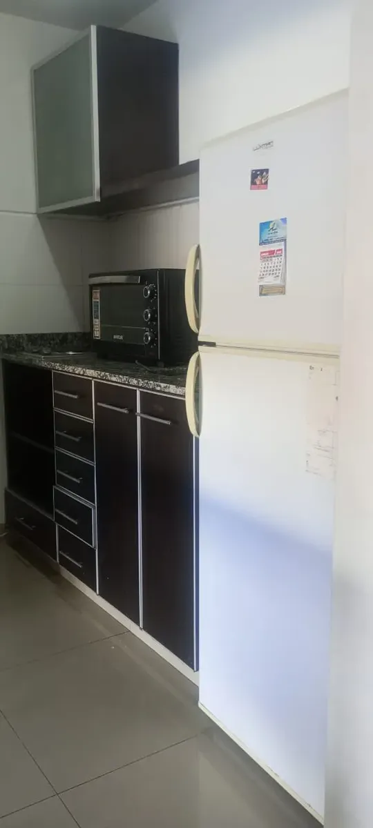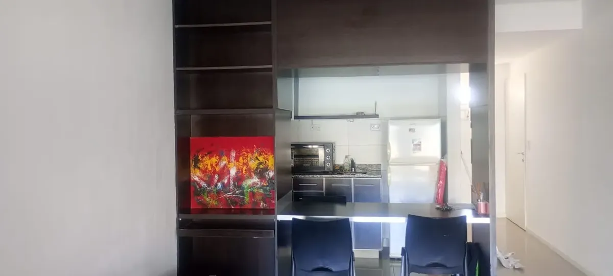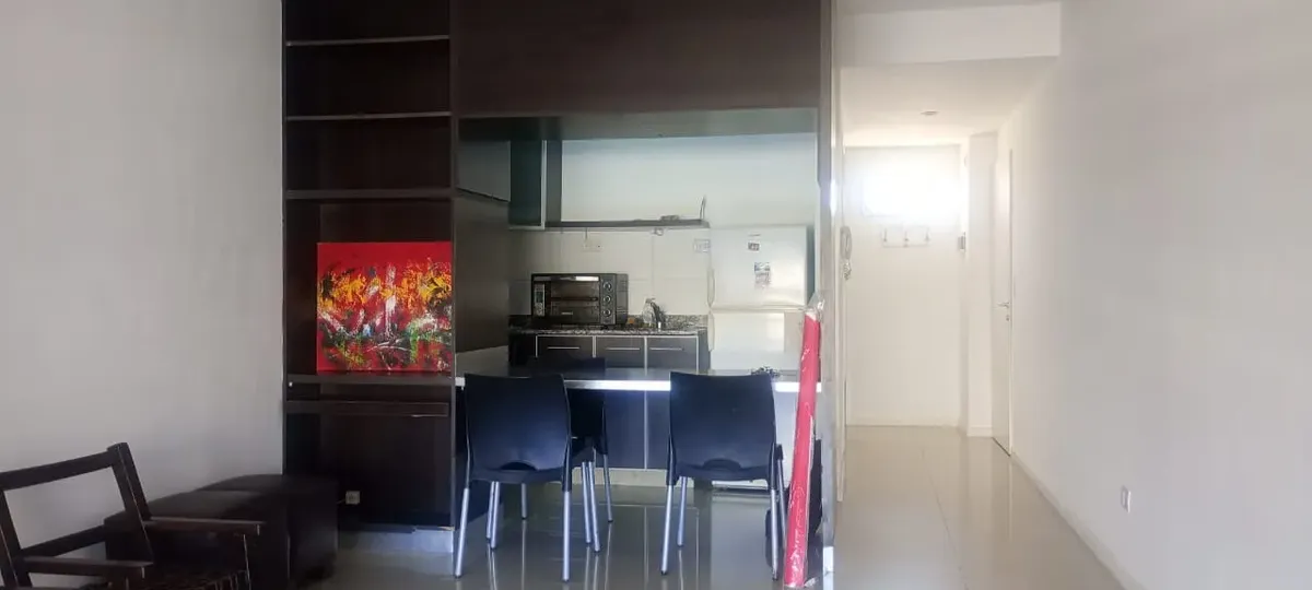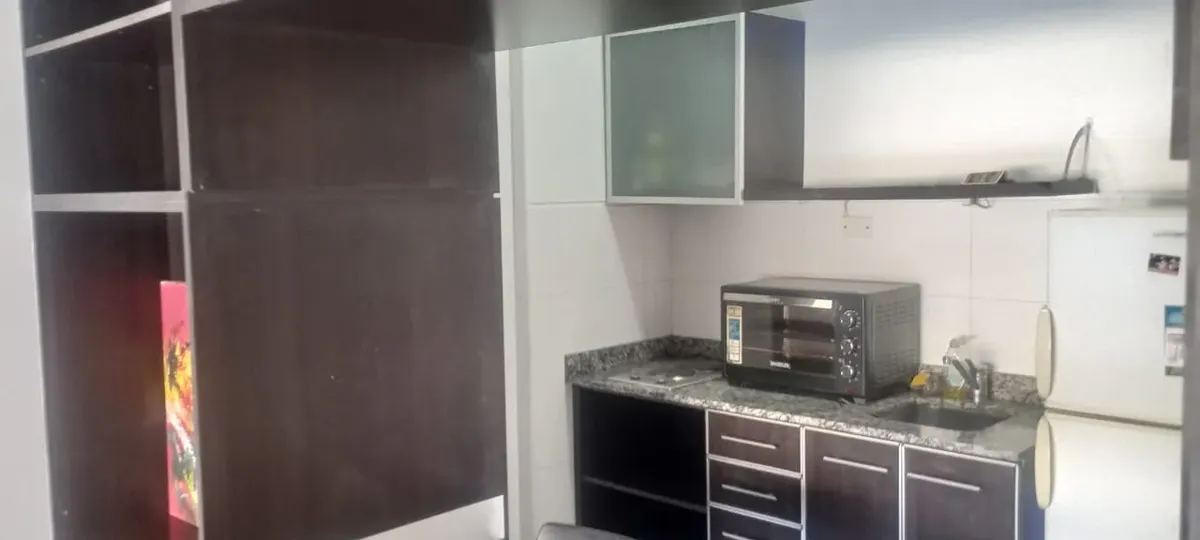 Kitnet mobiliada e equipada de frente para a rua, com varanda em formato de terraço. Cozinha integrada e banheiro completo. Inclui vaga de garagem (fixa).