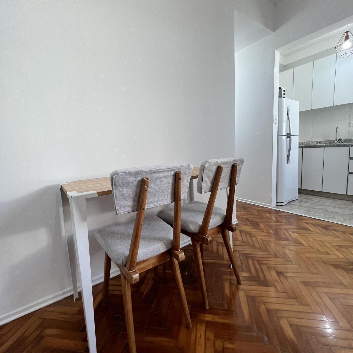 Apartamento de 2 ambientes mobiliado em Monserrat, com 1 quarto. Locação temporária com mínimo de 3 meses e máximo de 1 ano (renovável), com tempo máximo de 6 meses e possibilidade de renovação. Sala de estar e jantar com mesa nórdica, 2 bancos e sofá de dois lugares; cozinha integrada com geladeira com freezer, fogão a gás de 4 bocas, forno elétrico, pia com água fria e quente, chaleira elétrica e utensílios. Quarto com cama de casal, mesas de cabeceira, ar-condicionado frio e quente, armário e