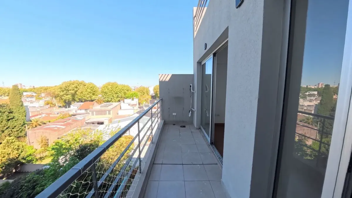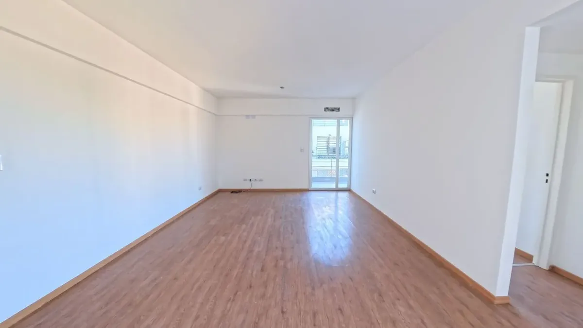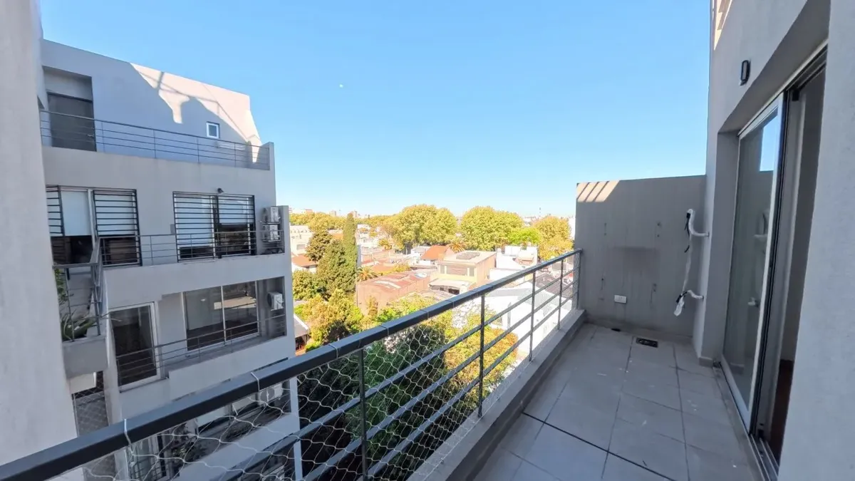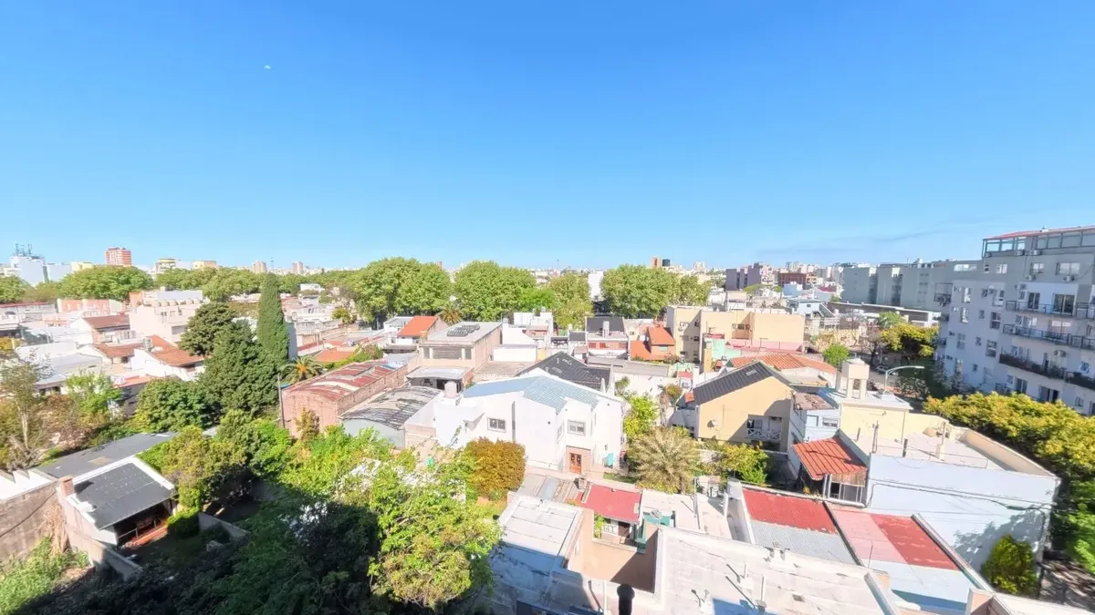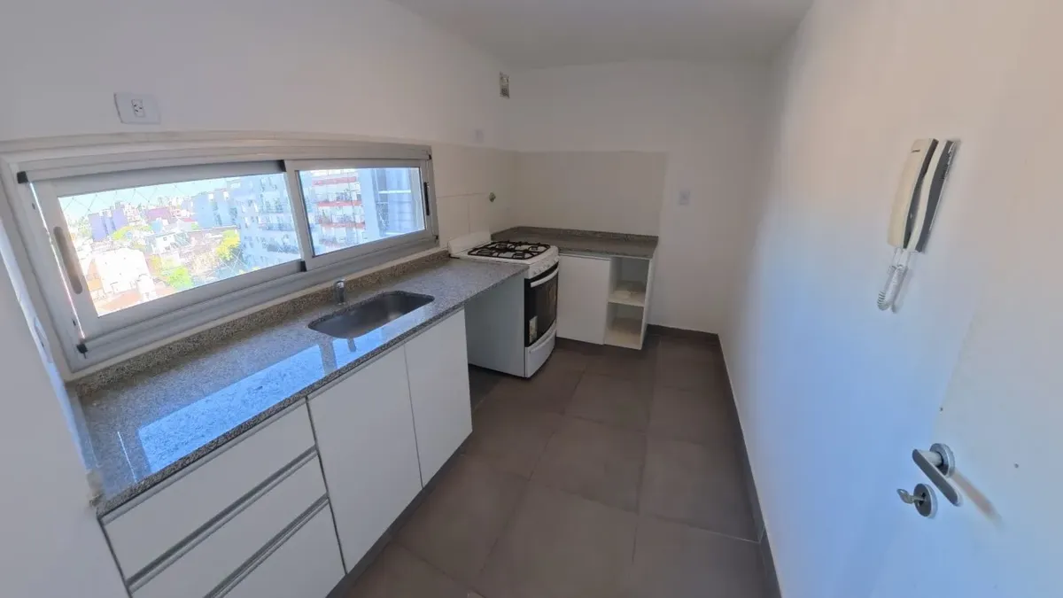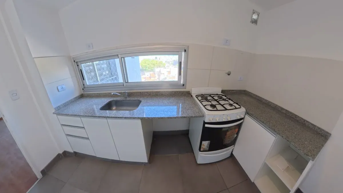 Apartamento de dois ambientes com 56,9 m², 6º andar, com vista de fundos e varanda contínua. Cozinha independente a gás, banheiro completo com janela, 1 quarto com placard e living-comedor com circulação dupla. Há baulera no 7º andar e acesso por hall semiprivado; o prédio tem dois setores, com 1 elevador por setor. Condomínio de $150.000, incluindo AYSA e água quente central. Exige contrato de 1 ou 2 anos, reajuste trimestral por IPC, mês de adiantamento, depósito de USD 700, comprovação de ren
