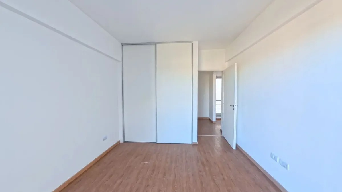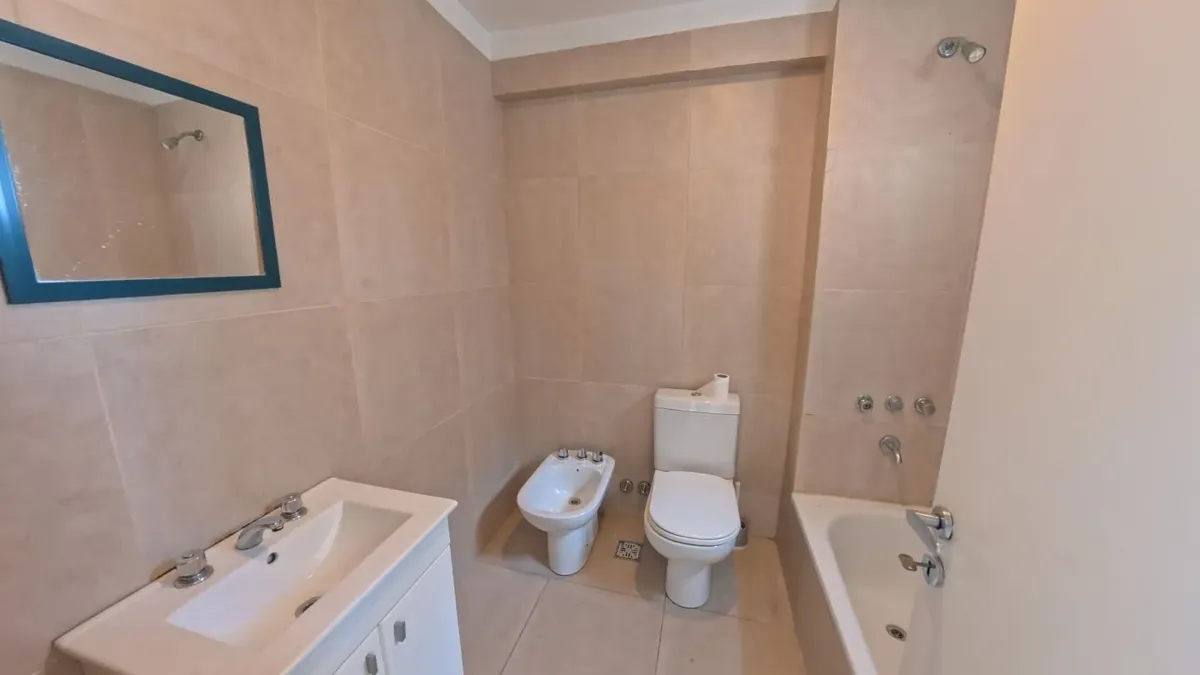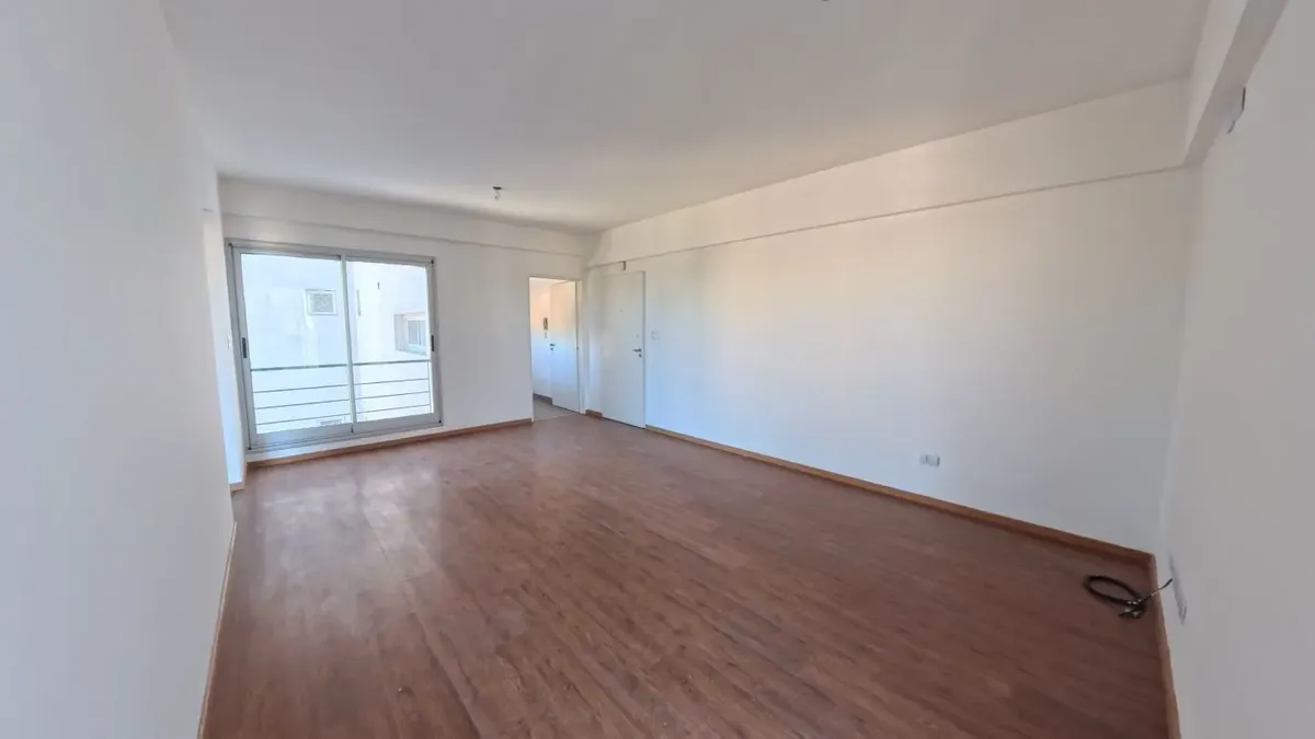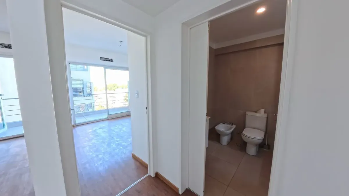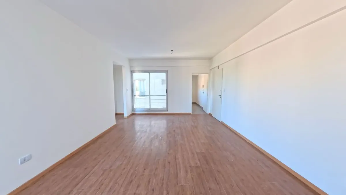 Apartamento de dois ambientes com 56,9 m², 6º andar, com vista de fundos e varanda contínua. Cozinha independente a gás, banheiro completo com janela, 1 quarto com placard e living-comedor com circulação dupla. Há baulera no 7º andar e acesso por hall semiprivado; o prédio tem dois setores, com 1 elevador por setor. Condomínio de $150.000, incluindo AYSA e água quente central. Exige contrato de 1 ou 2 anos, reajuste trimestral por IPC, mês de adiantamento, depósito de USD 700, comprovação de ren