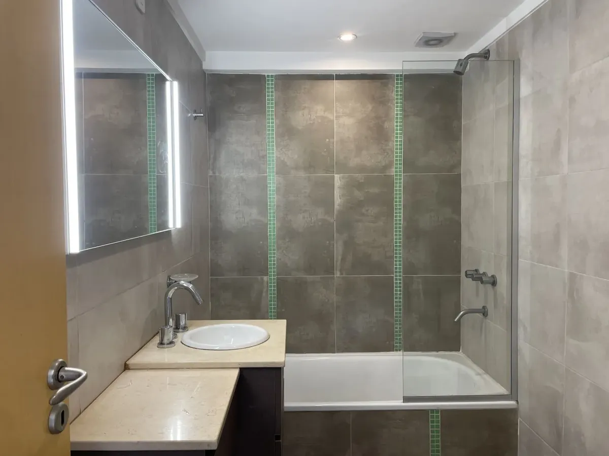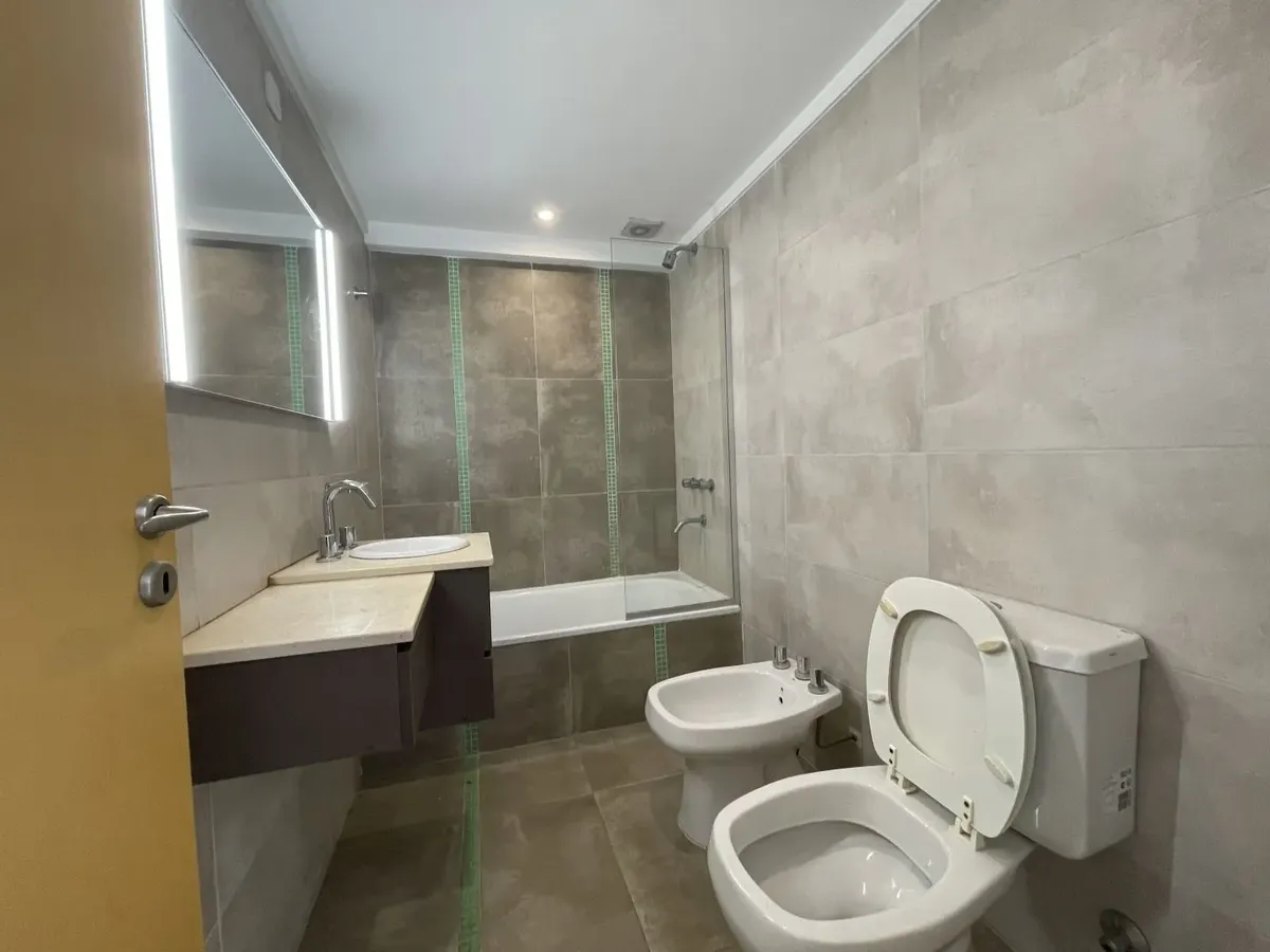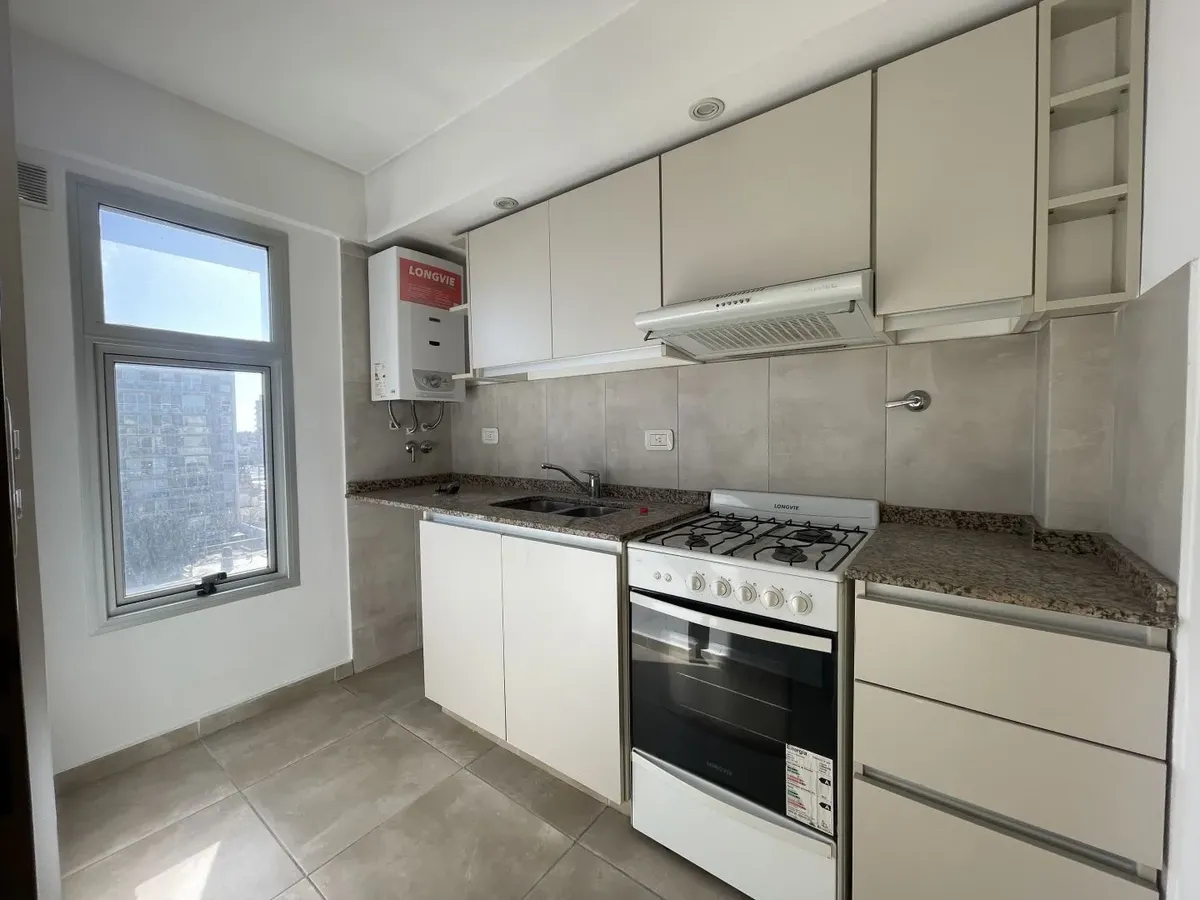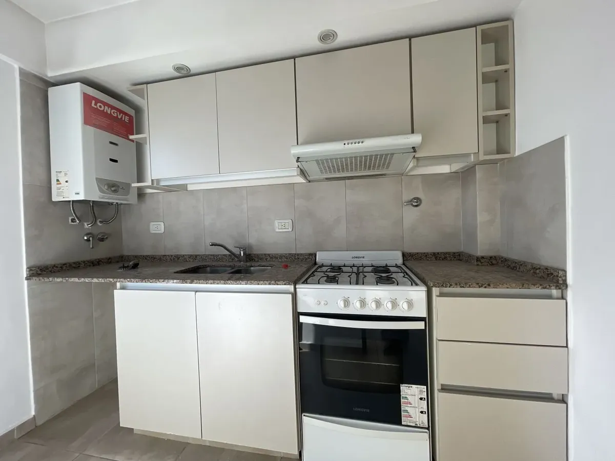 Apartamento de 2 ambientes em Morón, com sala de estar e jantar e saída para a varanda de frente. O imóvel tem instalação de ar-condicionado frio e quente e armário para armazenamento. A cozinha é separada e equipada com fogão a gás, aquecedor de água (termotanque) e uma unidade com pia (spar) com acesso ao exterior. Pelo corredor, há um banheiro completo com banheira e box instalado, além de um quarto com armário embutido e aquecedor a gás. O valor informado refere-se ao apartamento sem vaga de
