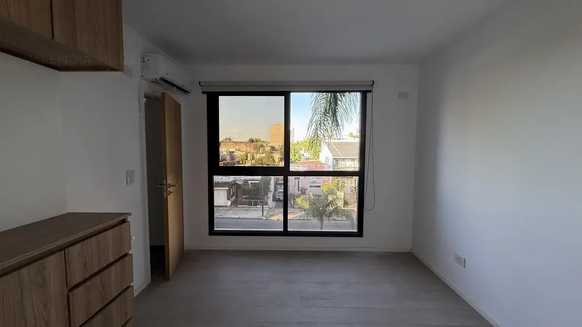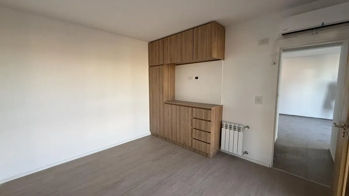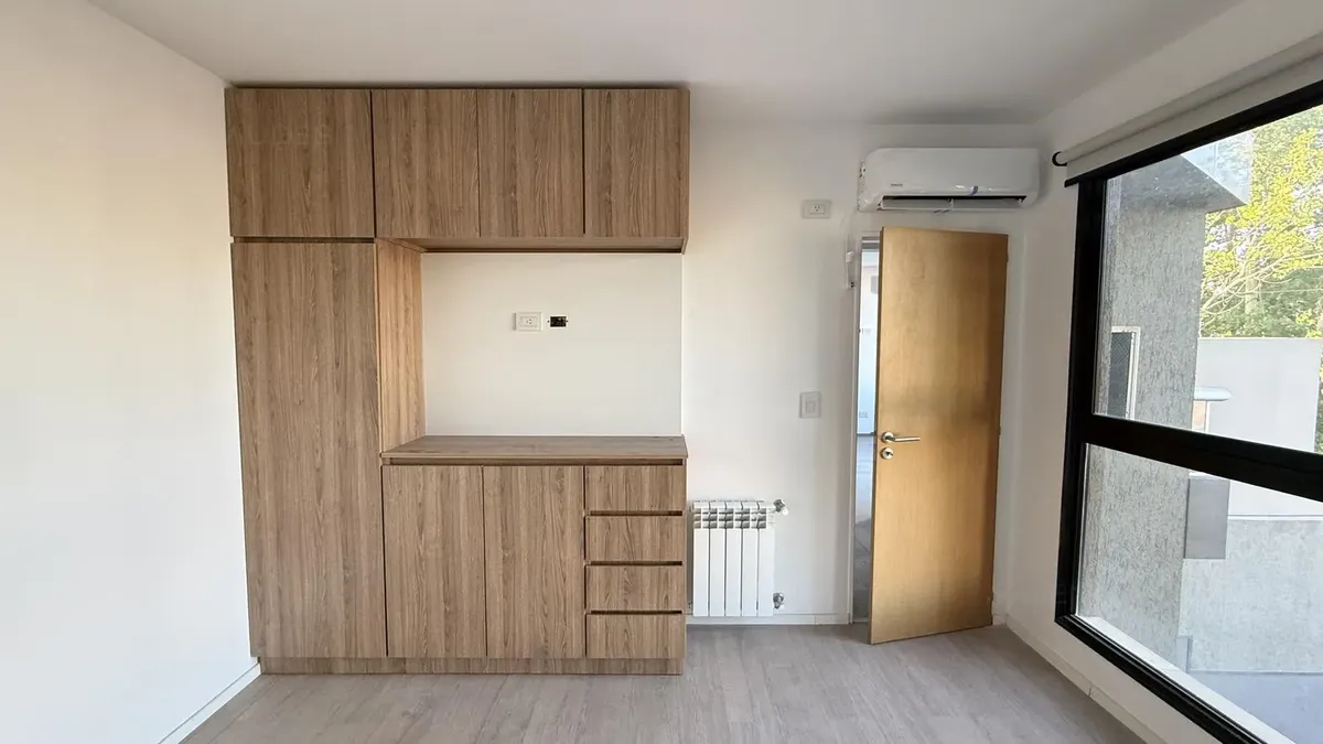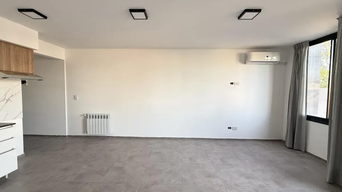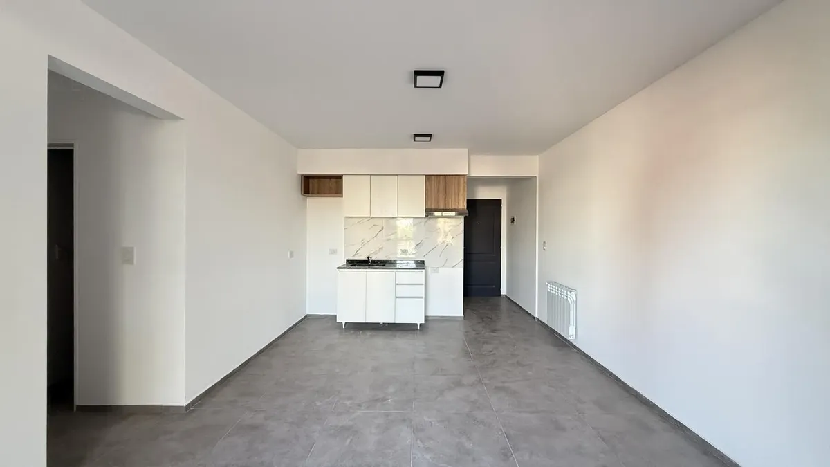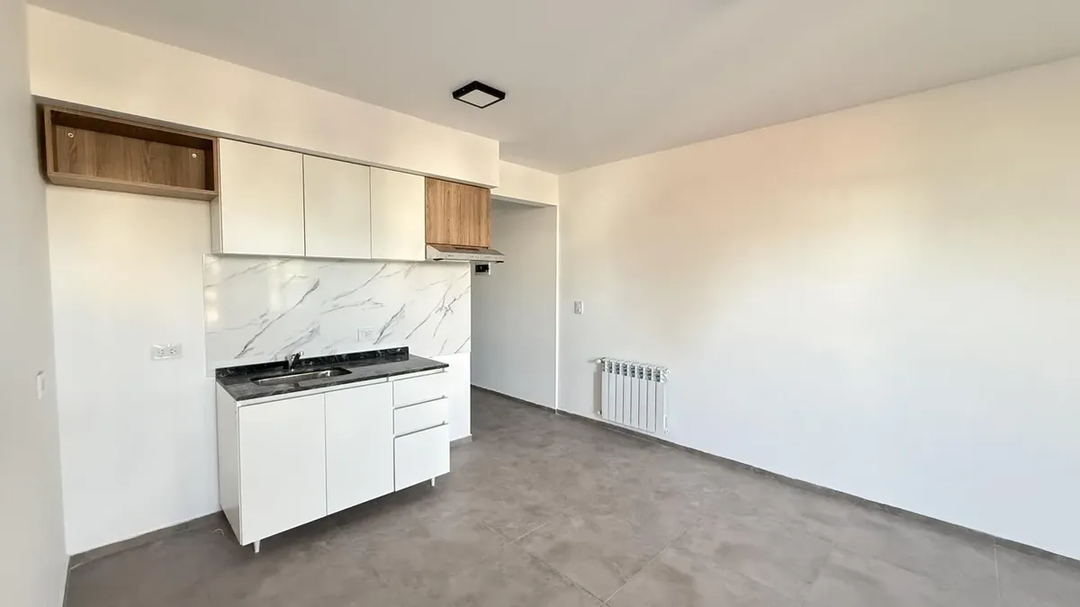 Apartamento de 2 ambientes em Morón Sur, com 1 quarto. Cozinha e sala integradas, com alacena, armário sob a bancada e coifa; cozinha elétrica instalada. Há saída para varanda do tipo balcão francês, quarto com guarda-roupa e espaço para TV, e banheiro completo. O imóvel é entregue com ar-condicionado, aquecimento por radiadores e cortinas instaladas, além de caldeira central no edifício para calefação eficiente. Não há área para instalação de máquina de lavar (sem descarga de lavarropas).