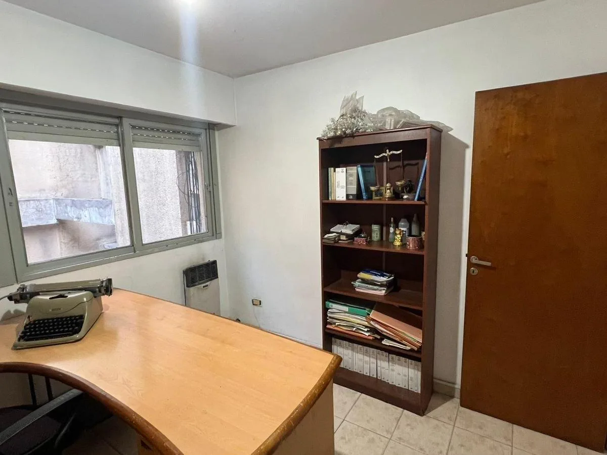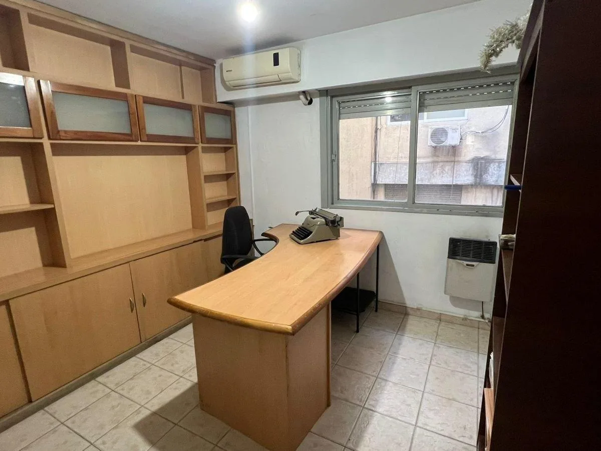 Apartamento de 2 ambientes em Morón, apresentado como adequado para escritório. Possui recepção com sala de espera, kitchenette, 2 escritórios e 1 banheiro completo. Inclui móveis de escritório.