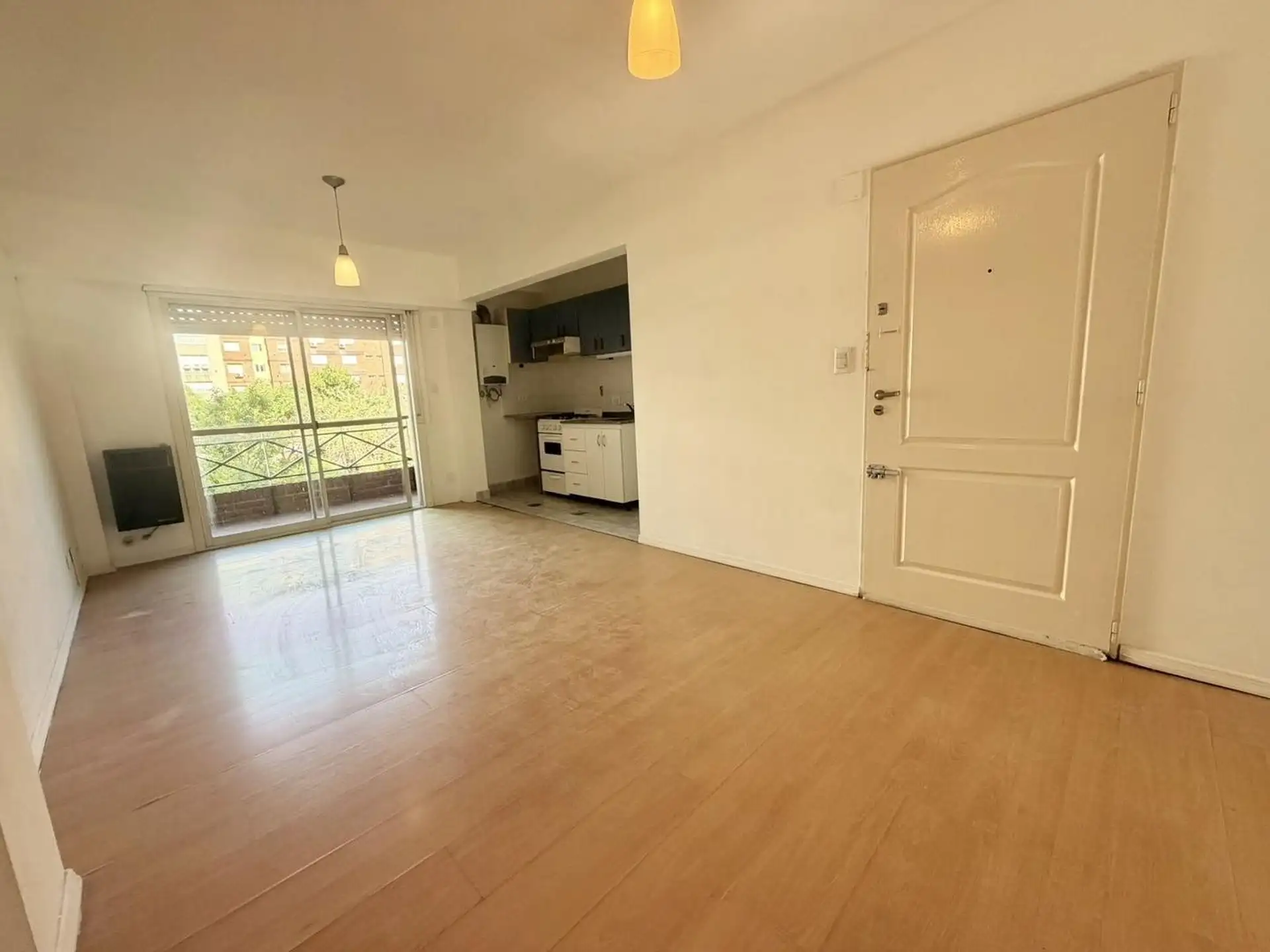 Apartamento de dois ambientes em Castelar Norte, com 1 dormitório e 1 banheiro. Inclui living com cozinha semi-integrada, dormitório com armário, varanda com área de churrasco e vaga de garagem. A locação tem ajuste trimestral pelo IPC: por 3 meses, $500.000, mais condomínio de aprox. $145.000 e imposto municipal.