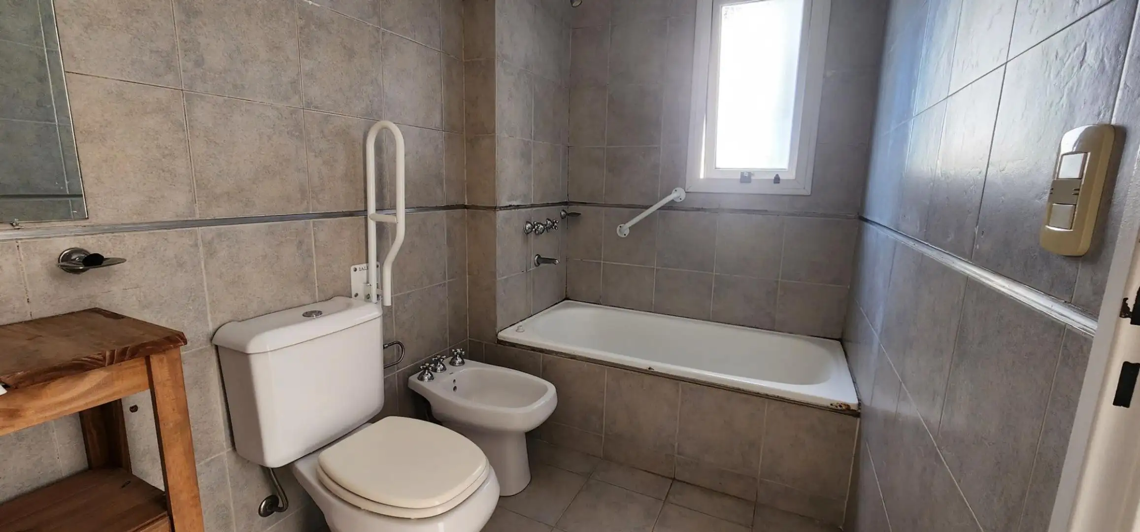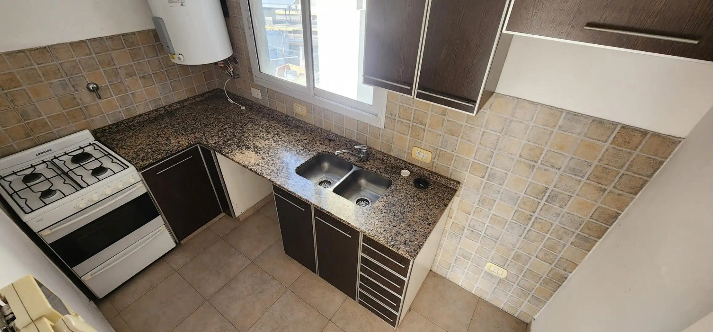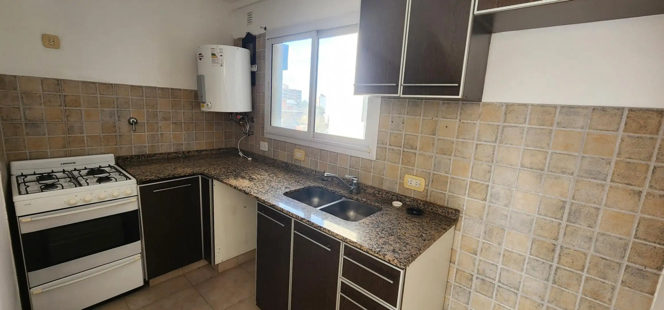 Apartamento de 2 ambientes de frente para o miolo de quadra (contra frente), com orientação norte. O imóvel tem 1 quarto, living com varanda, cozinha independente com móveis sob a bancada e conexão para lavadora, além de banheiro completo com banheira. Há aquecimento por estufa a tiro balanceado e termo elétrico, e o prédio tem 3 elevadores, terraço comum com solário e área de churrasco. A locação exige garantia familiar proprietária e não permite animais, com contrato de 2 anos e reajuste trime