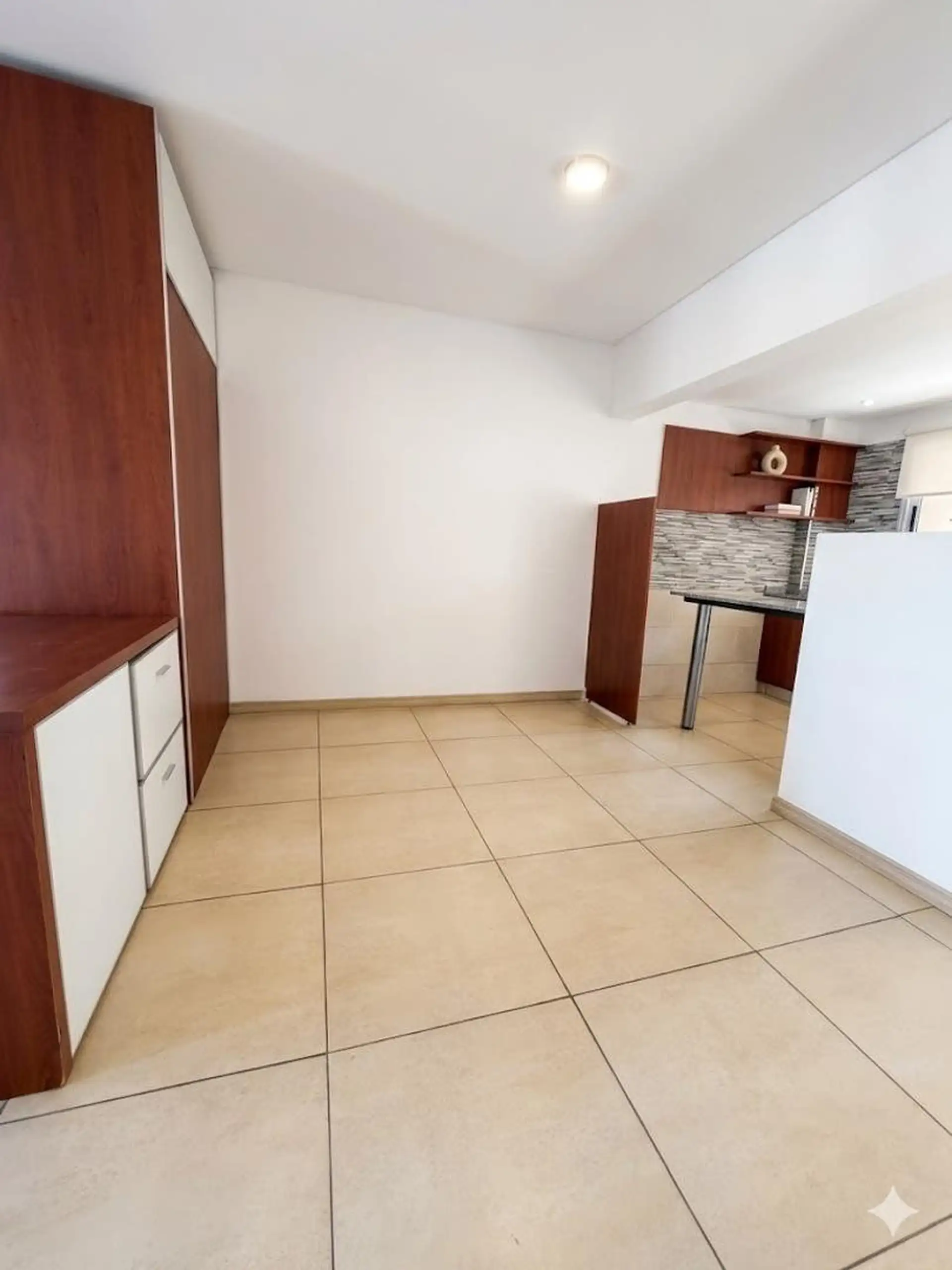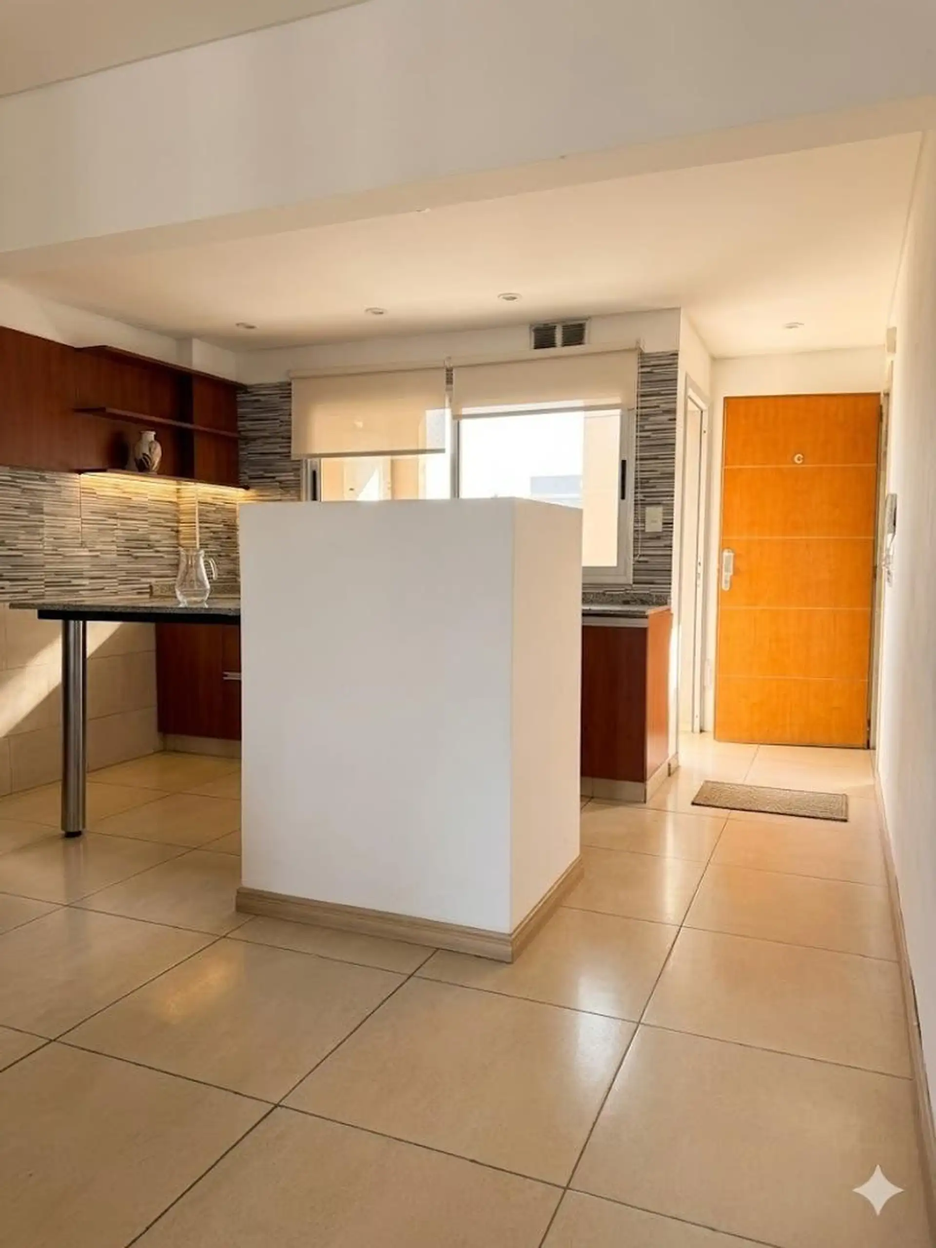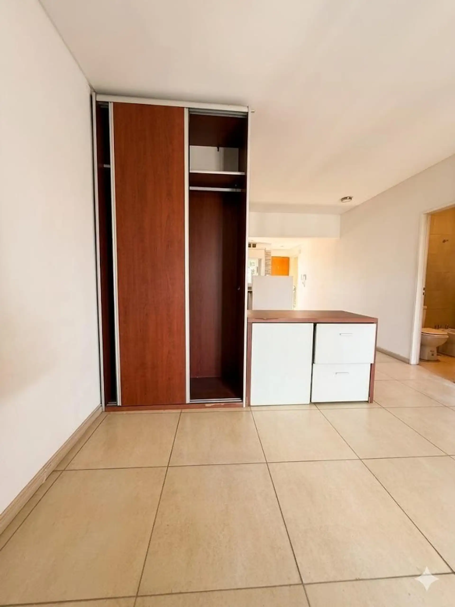 Apartamento tipo kitnet de 1 ambiente em Morón, com possibilidade de dividir o dormitório. Possui cozinha instalada com ilha e passaplaca, área de jantar, lavadouro independente, banheiro completo com vanitório e dormitório separado por armário. Inclui varanda-terraço, aquecimento de água por calefón a gás natural, pisos de porcelanato e móveis de cozinha completos. O prédio tem SUM com área de churrasco (parrilla), quiosque para 15 pessoas com banheiro, ar-condicionado nas áreas comuns e terraç
