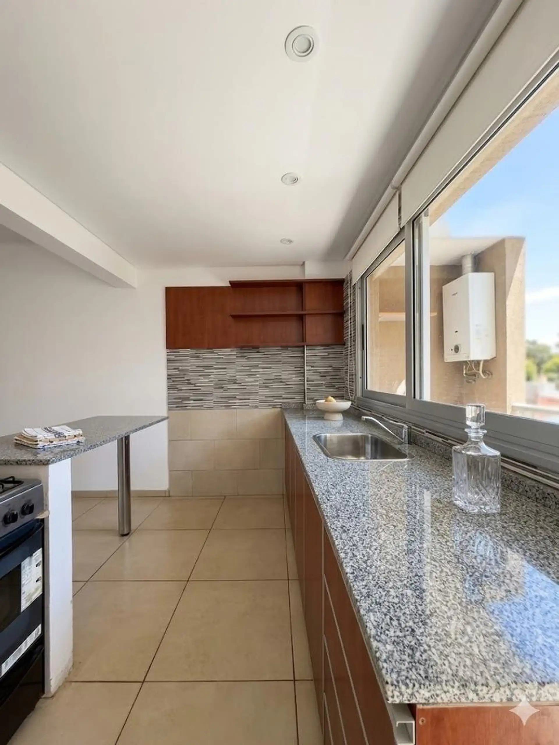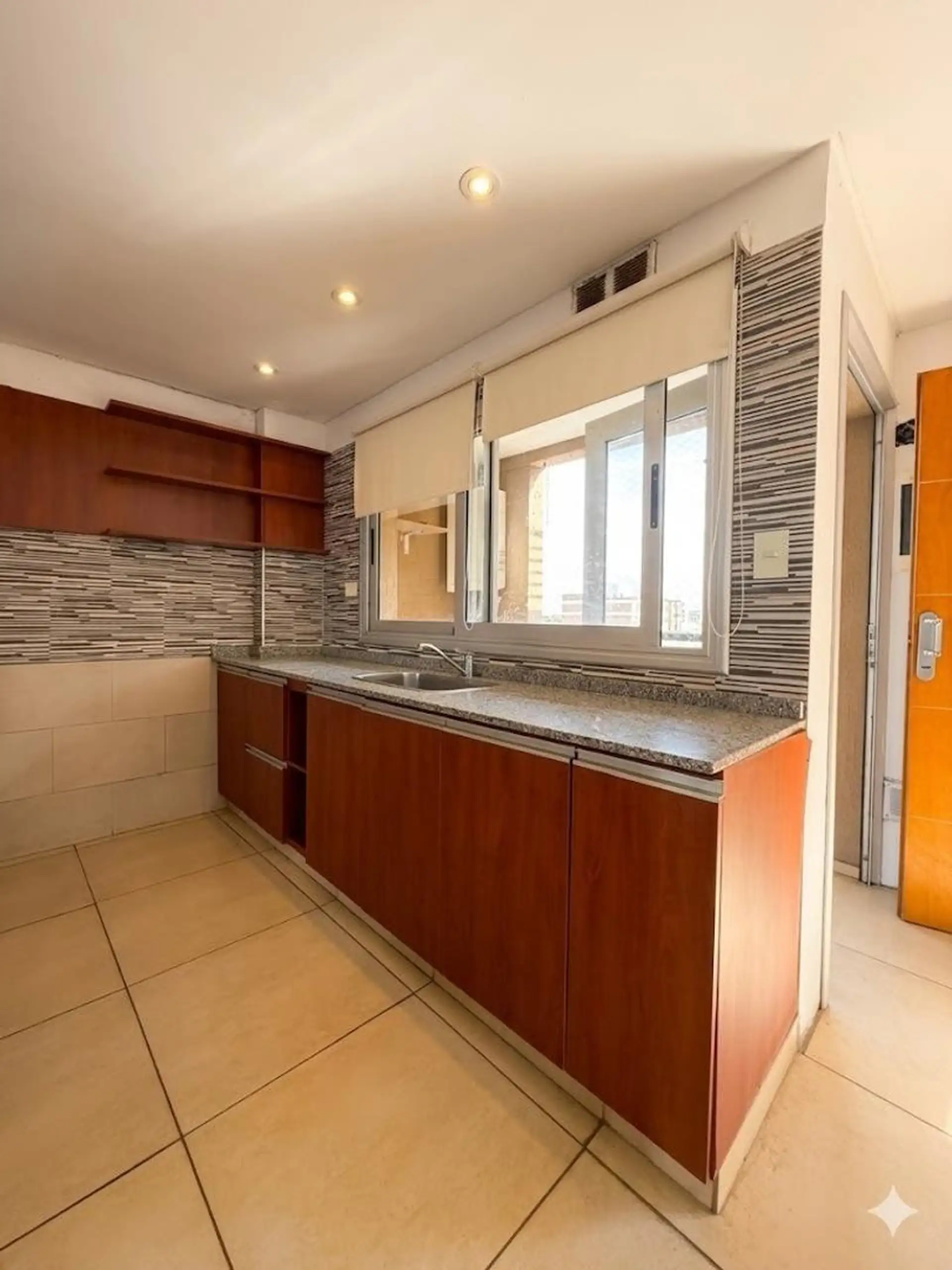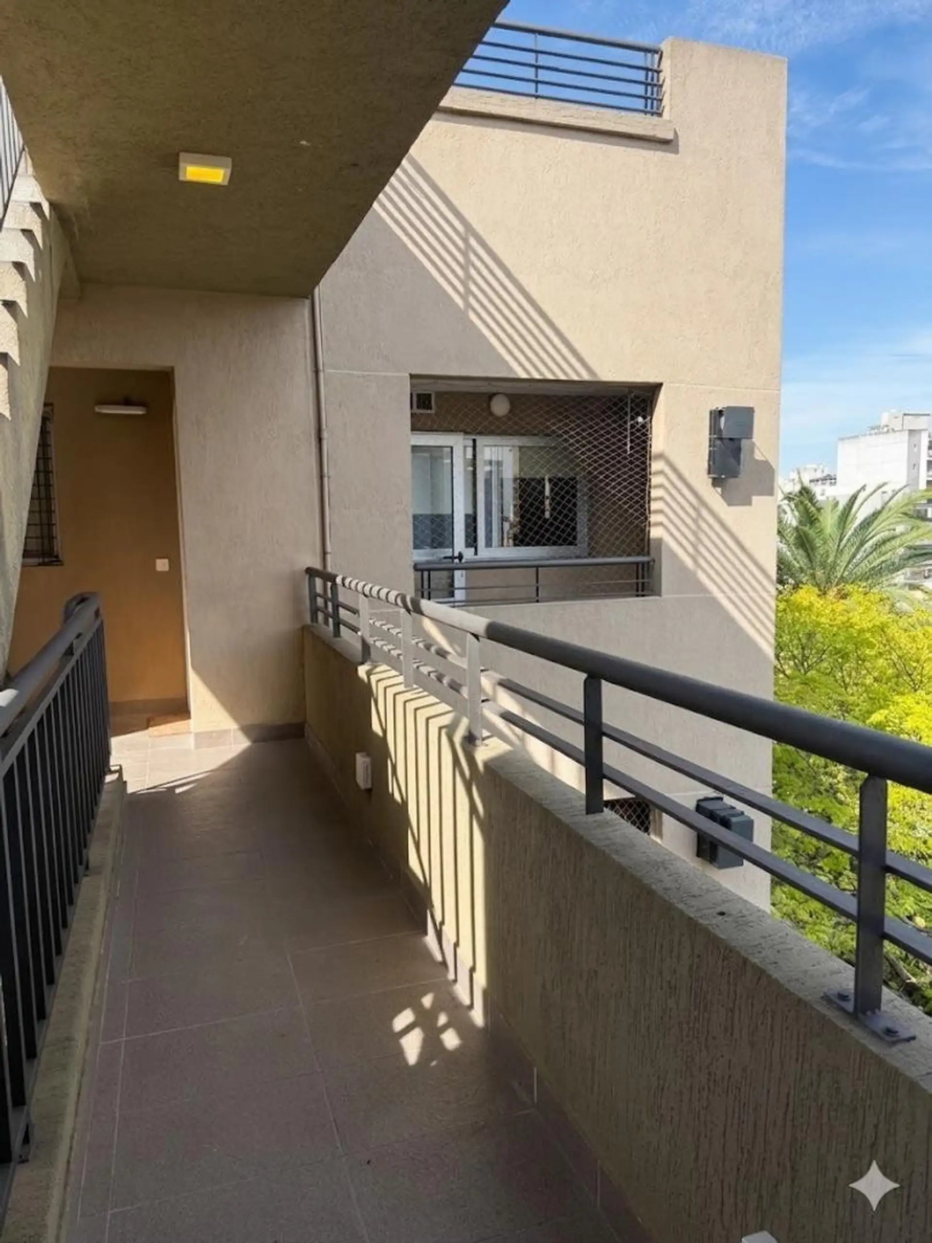 Apartamento tipo kitnet de 1 ambiente em Morón, com possibilidade de dividir o dormitório. Possui cozinha instalada com ilha e passaplaca, área de jantar, lavadouro independente, banheiro completo com vanitório e dormitório separado por armário. Inclui varanda-terraço, aquecimento de água por calefón a gás natural, pisos de porcelanato e móveis de cozinha completos. O prédio tem SUM com área de churrasco (parrilla), quiosque para 15 pessoas com banheiro, ar-condicionado nas áreas comuns e terraç