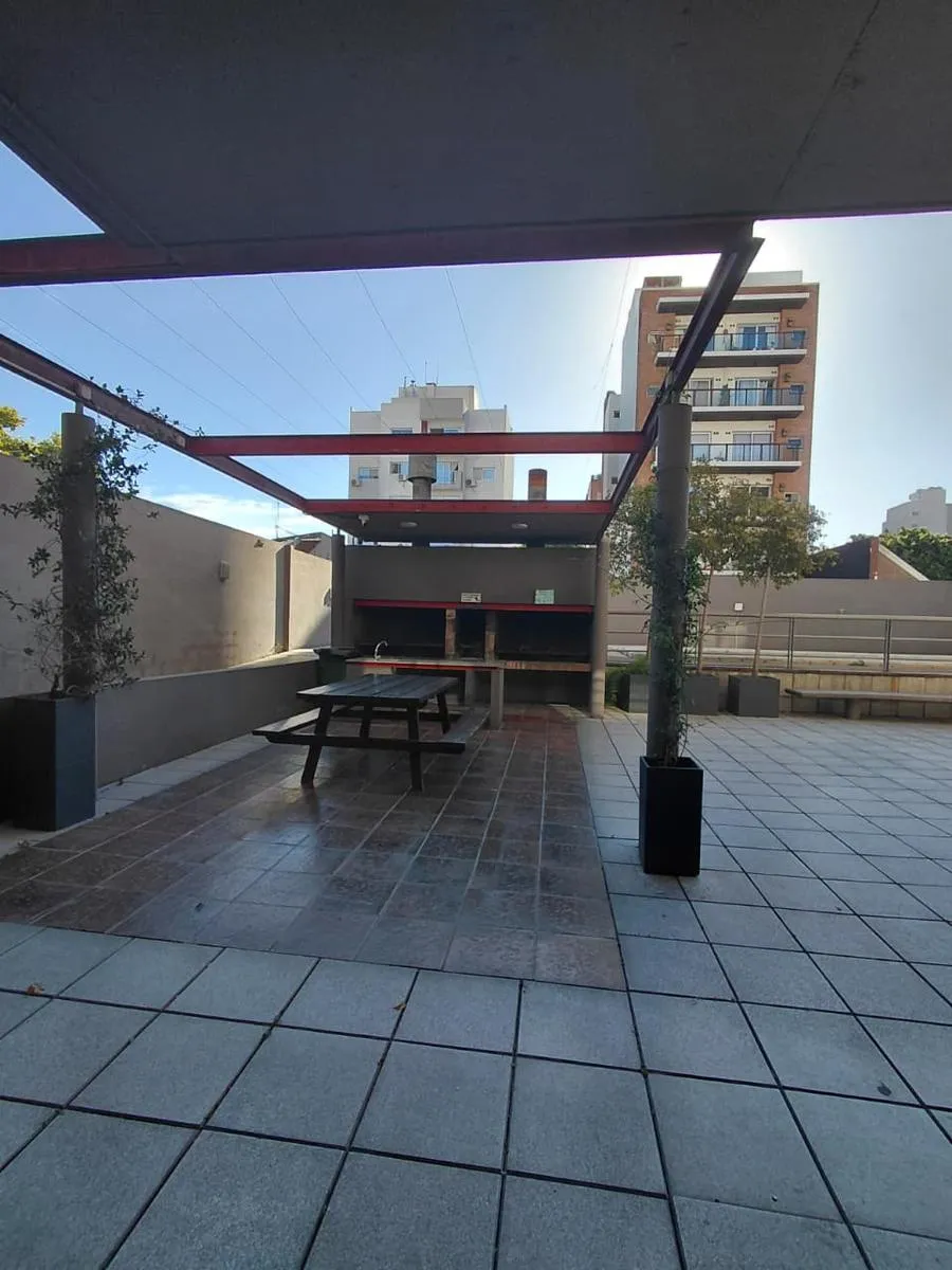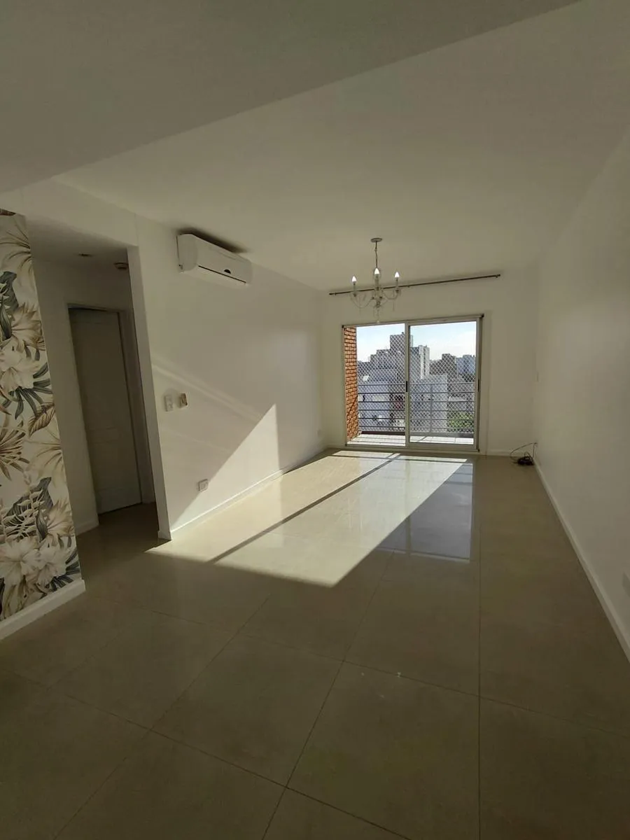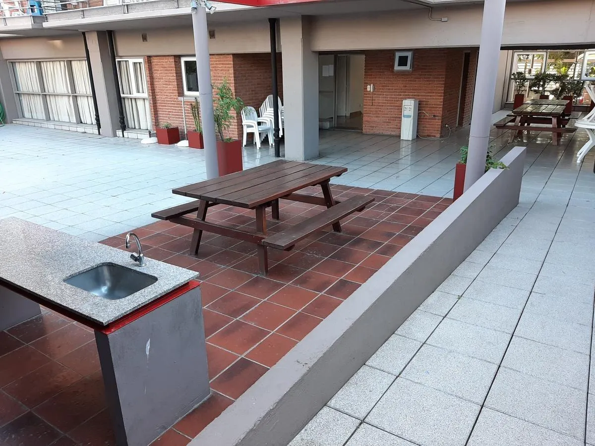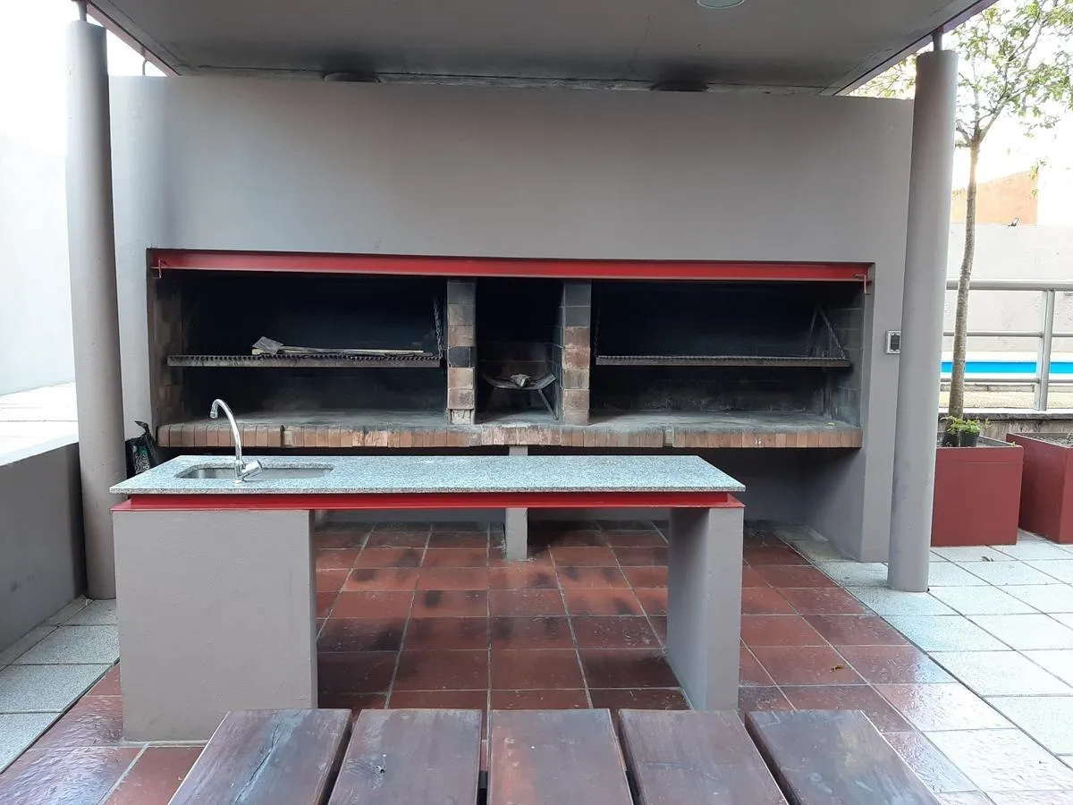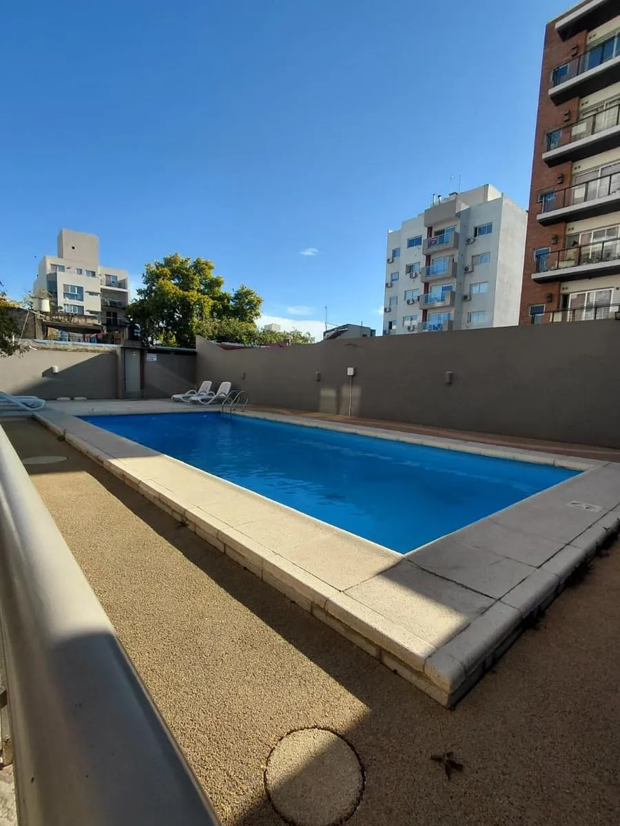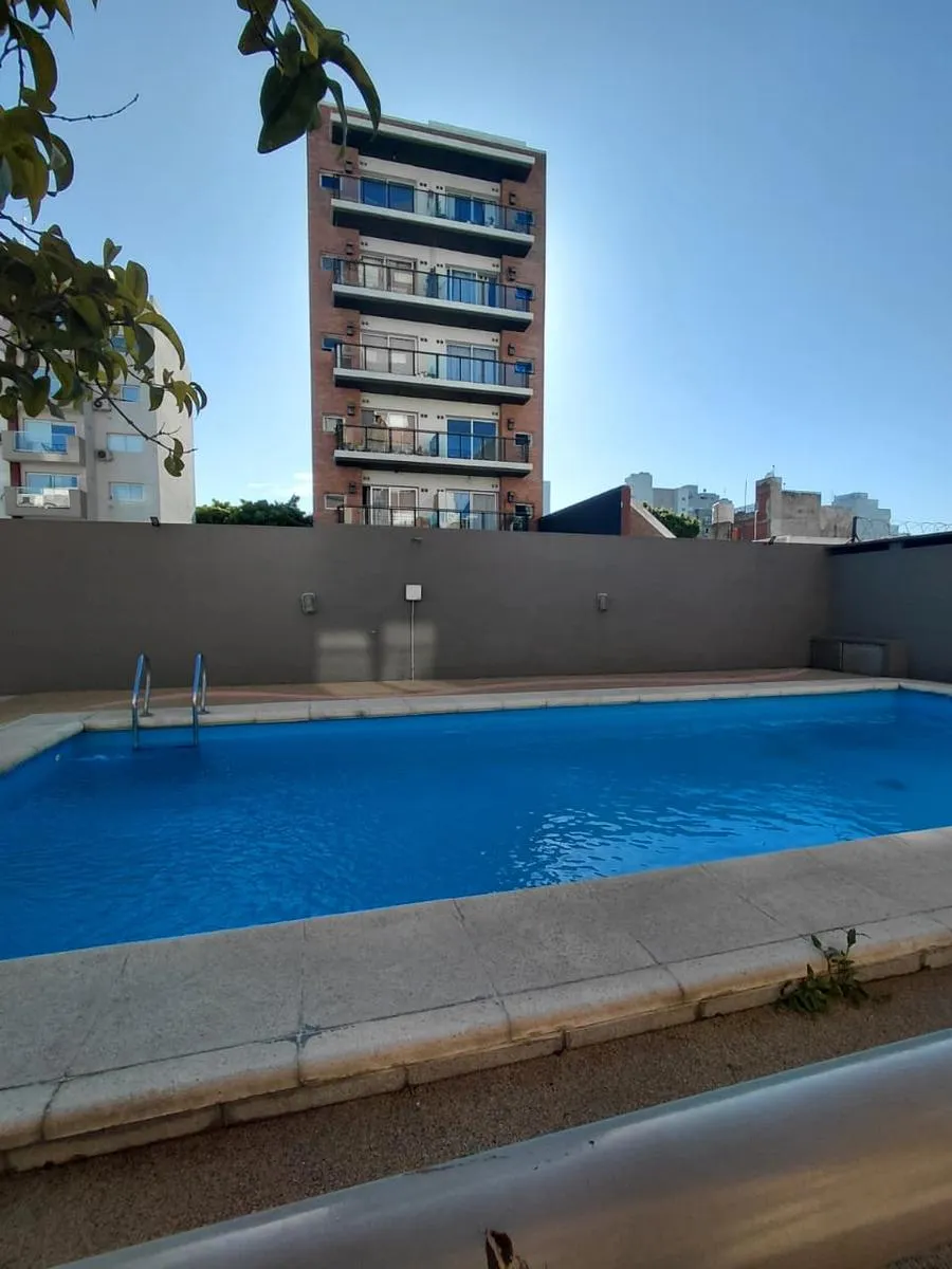 Apartamento de 2 ambientes em Morón Sur, com 1 quarto, varanda e vaga de garagem coberta. O imóvel tem área de estar e jantar com ar-condicionado frio/quente e varanda voltada aos fundos, com vista para a piscina do complexo. A cozinha é separada e totalmente equipada com móveis, fogão (anafe) e forno elétrico; o quarto tem armário embutido com interiores, ar-condicionado frio/quente e persiana automatizada, além de banheiro completo. A vaga é coberta e fica no subsolo, com depósito (baulera). O