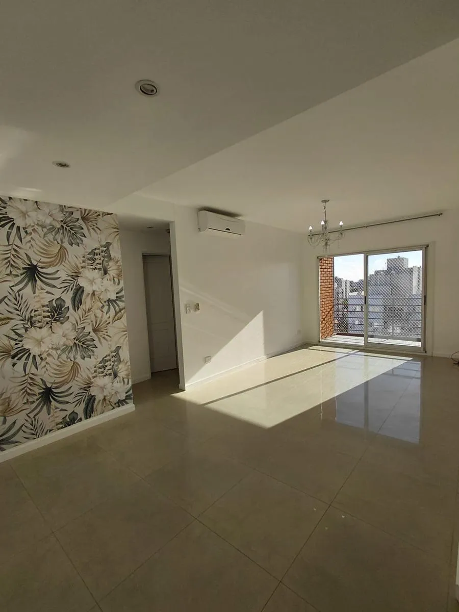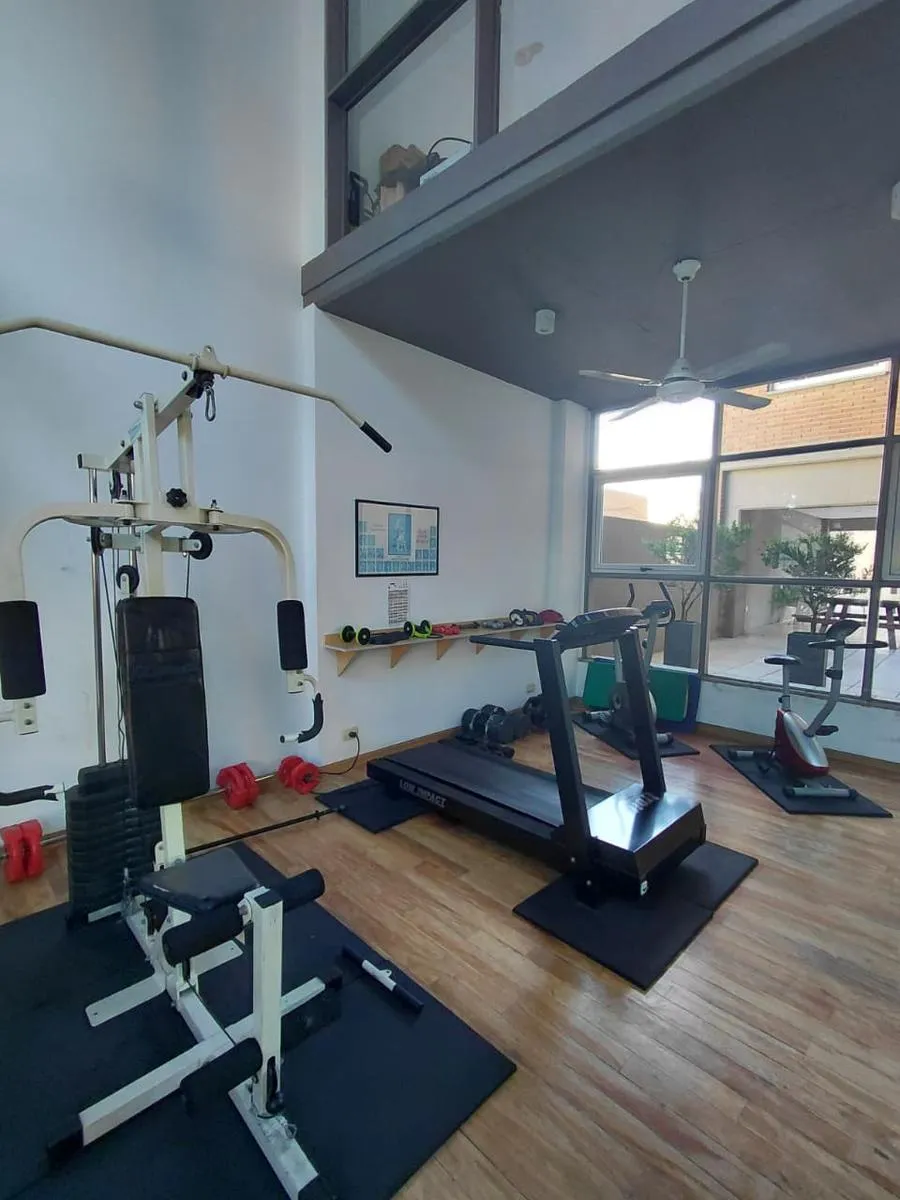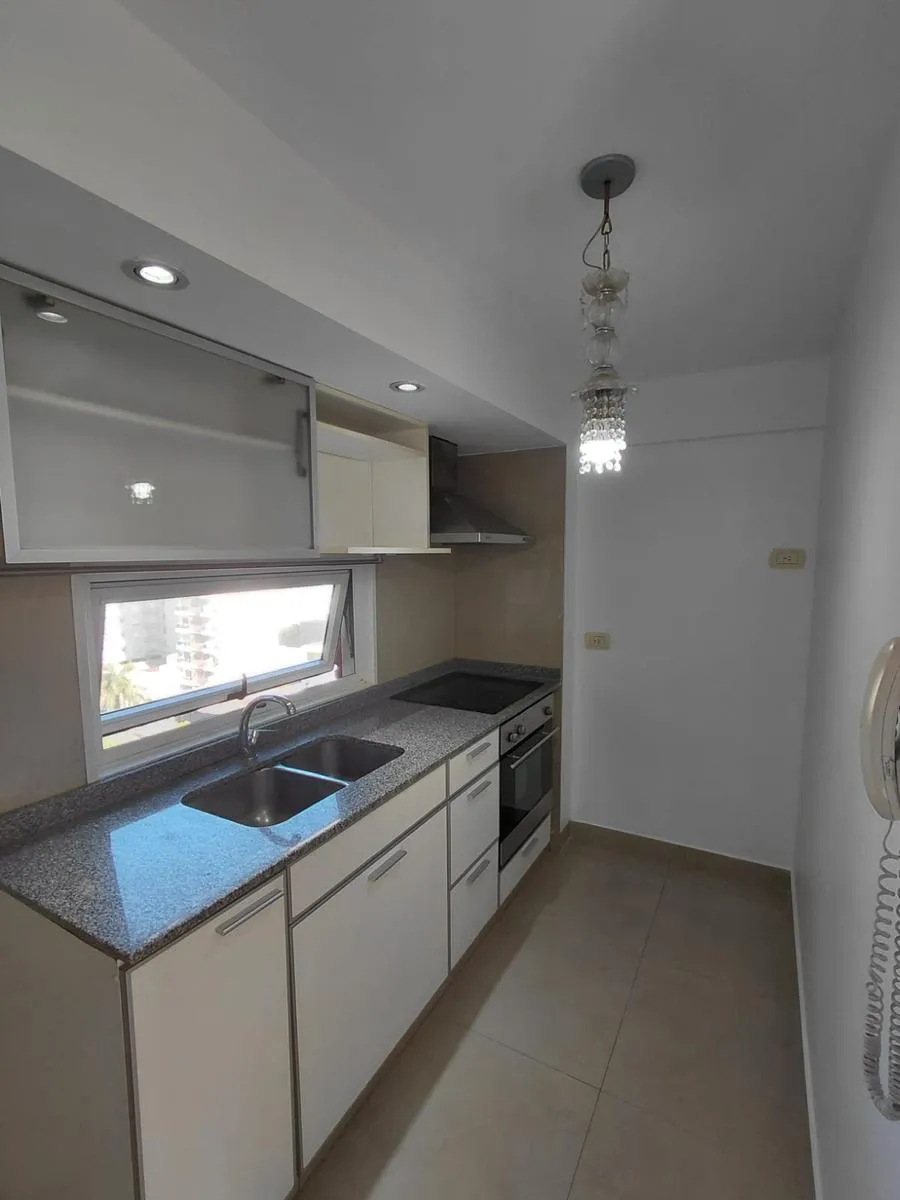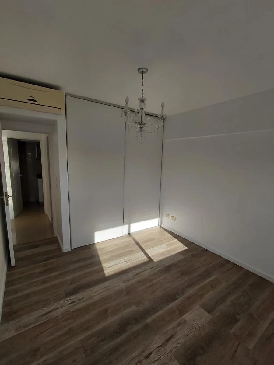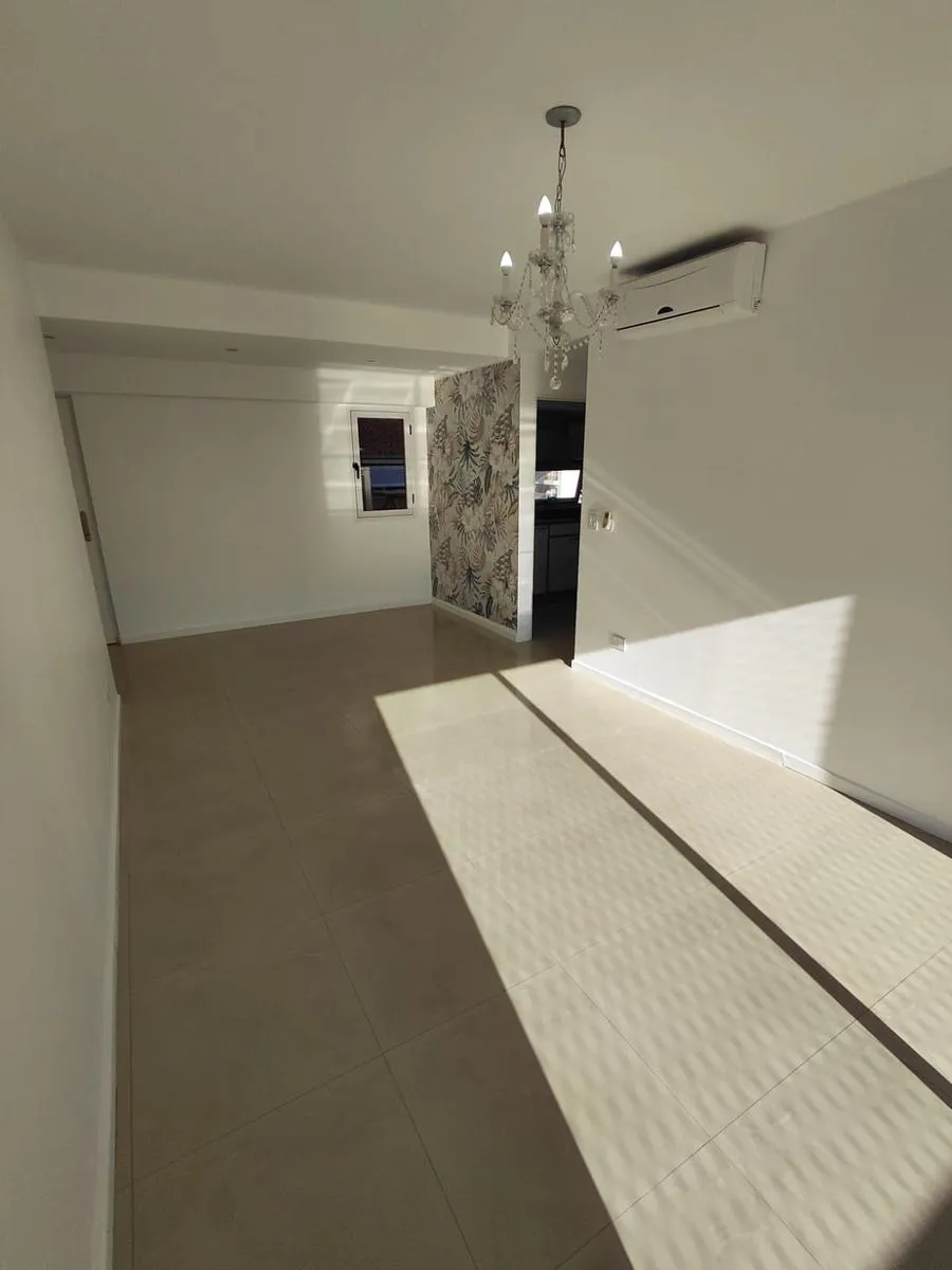 Apartamento de 2 ambientes em Morón Sur, com 1 quarto, varanda e vaga de garagem coberta. O imóvel tem área de estar e jantar com ar-condicionado frio/quente e varanda voltada aos fundos, com vista para a piscina do complexo. A cozinha é separada e totalmente equipada com móveis, fogão (anafe) e forno elétrico; o quarto tem armário embutido com interiores, ar-condicionado frio/quente e persiana automatizada, além de banheiro completo. A vaga é coberta e fica no subsolo, com depósito (baulera). O
