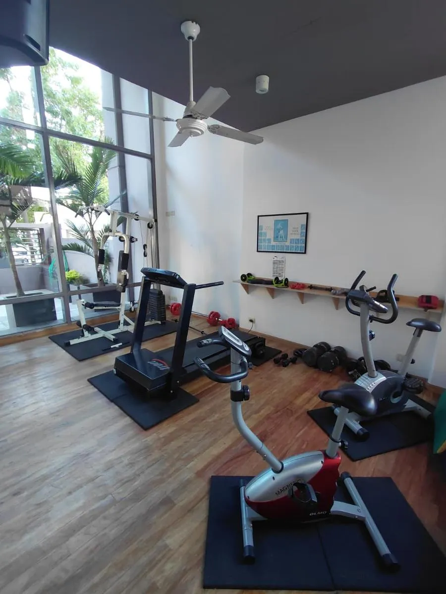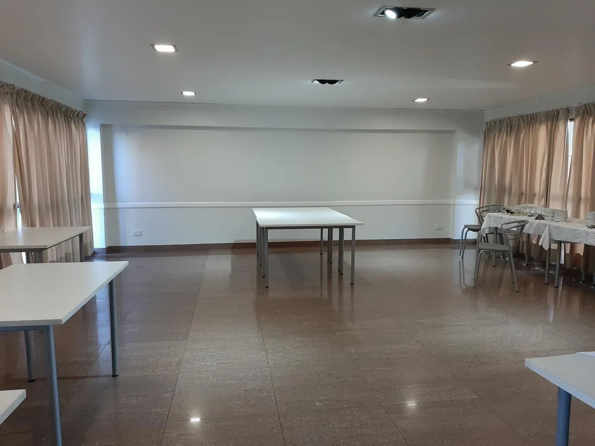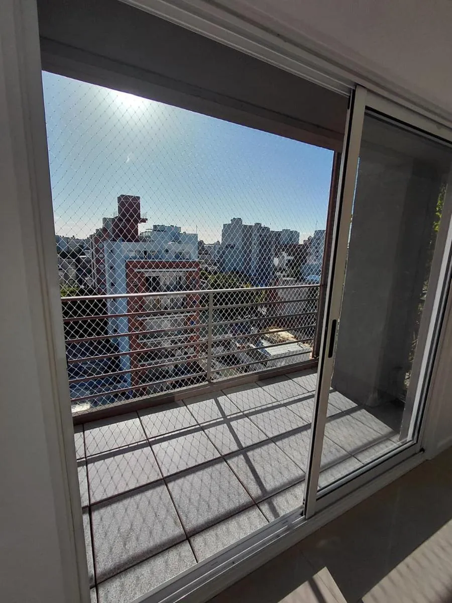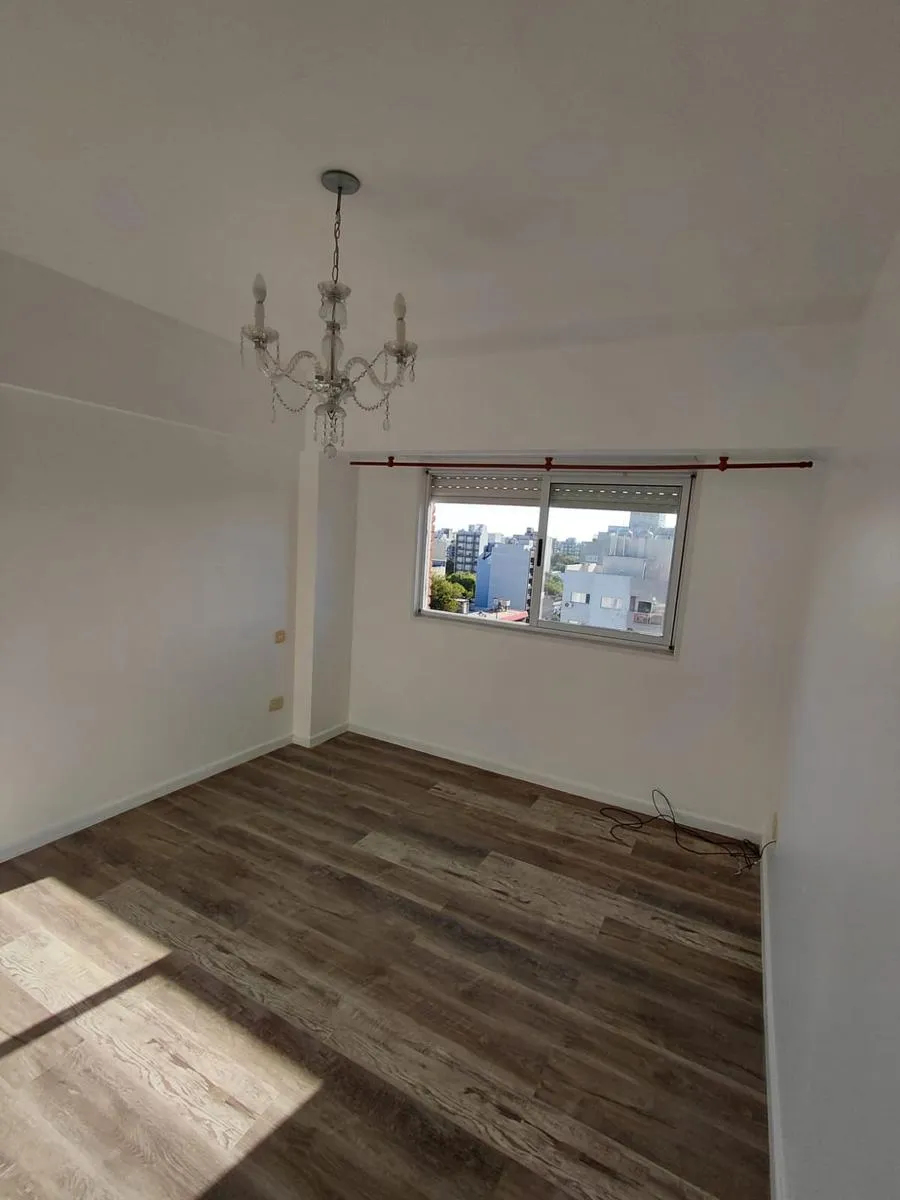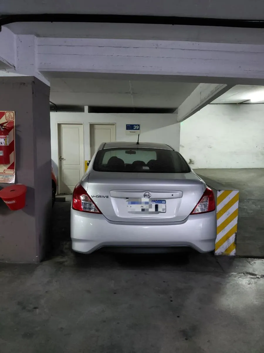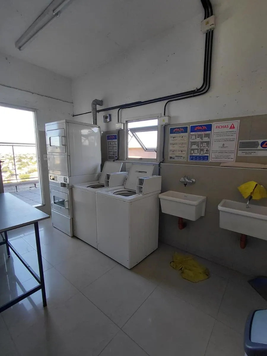 Apartamento de 2 ambientes em Morón Sur, com 1 quarto, varanda e vaga de garagem coberta. O imóvel tem área de estar e jantar com ar-condicionado frio/quente e varanda voltada aos fundos, com vista para a piscina do complexo. A cozinha é separada e totalmente equipada com móveis, fogão (anafe) e forno elétrico; o quarto tem armário embutido com interiores, ar-condicionado frio/quente e persiana automatizada, além de banheiro completo. A vaga é coberta e fica no subsolo, com depósito (baulera). O