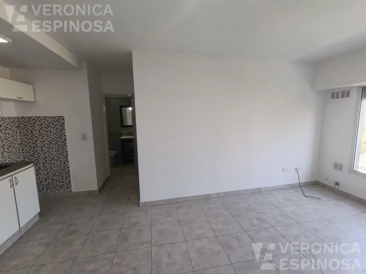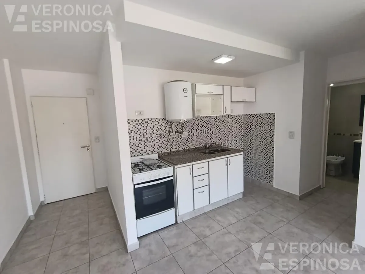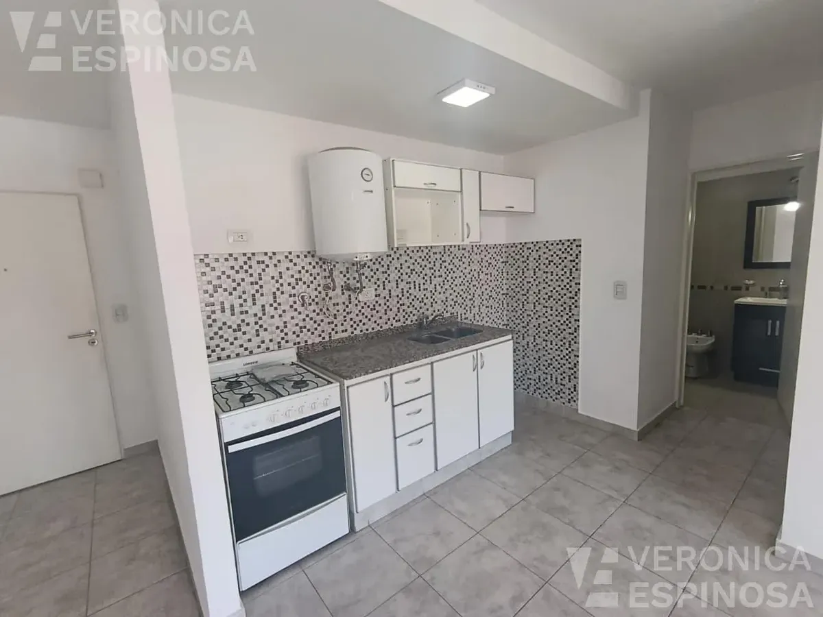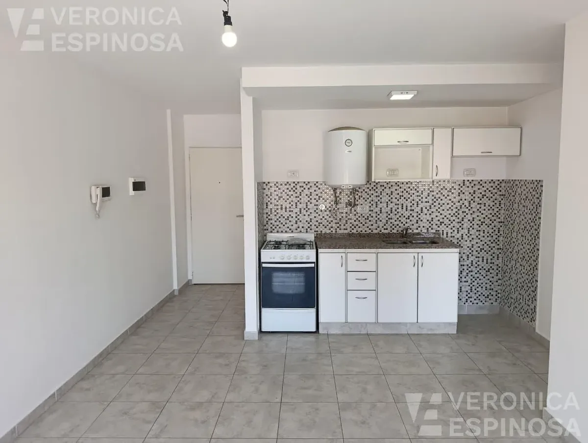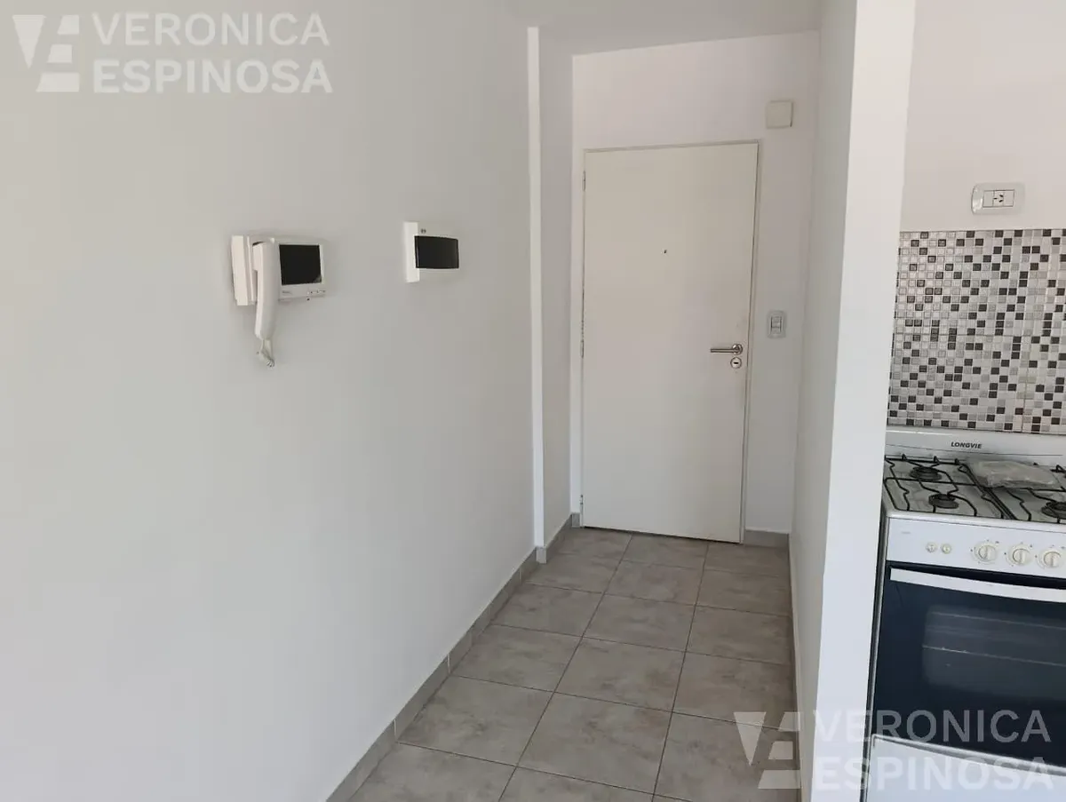 Apartamento de dois ambientes com frente para a rua, no centro de Morón. A unidade tem sala de estar e jantar, cozinha com bancada de mármore, pia de aço inox, torneira monocomando, armários inferiores e despensa, além de aparelho de cozinha e aquecedor de água elétrico (termotanque). O quarto tem piso de cerâmica, guarda-roupa embutido do piso ao teto e aquecimento por aquecedor de tiro balanceado. Há pré-instalação de ar-condicionado nos dois ambientes e banheiro completo com banheira e tornei