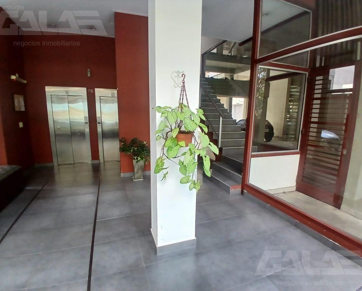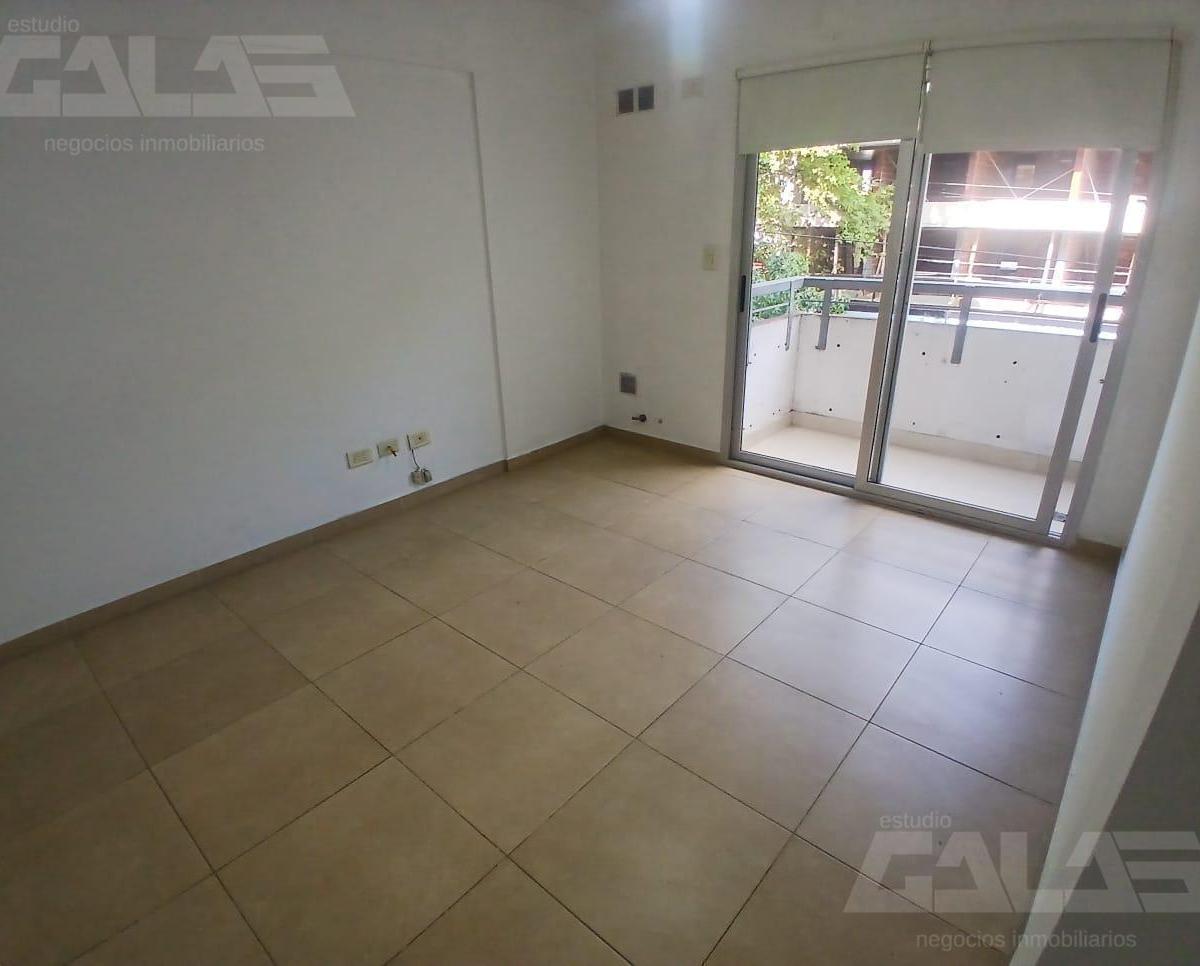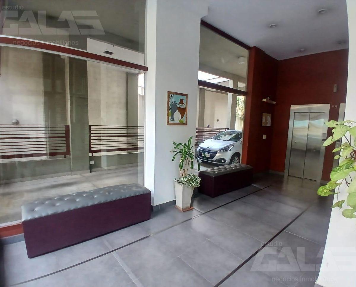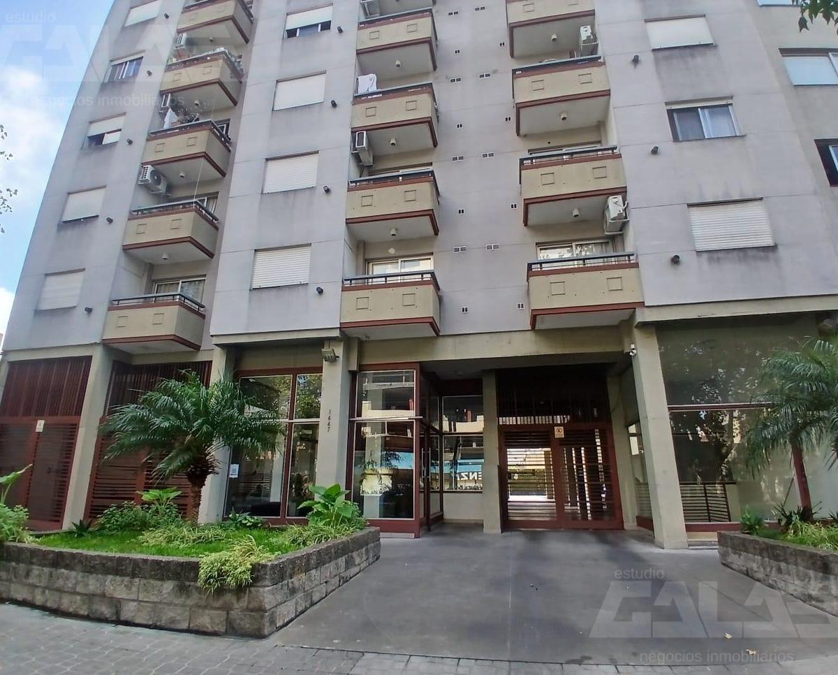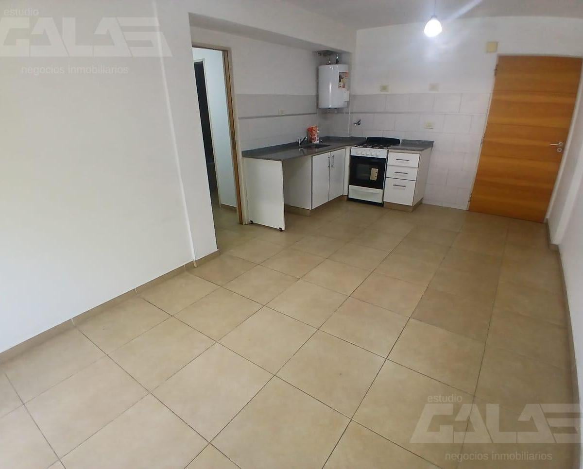 Apartamento de dois ambientes para alugar em Morón, com 1 quarto e varanda de frente para a rua. Sala de estar e jantar com saída para a varanda, cozinha integrada com móveis planejados sob a bancada e banheiro completo com banheira. O prédio tem 2 corpos, pátio interno e garagens a nível e no subsolo.