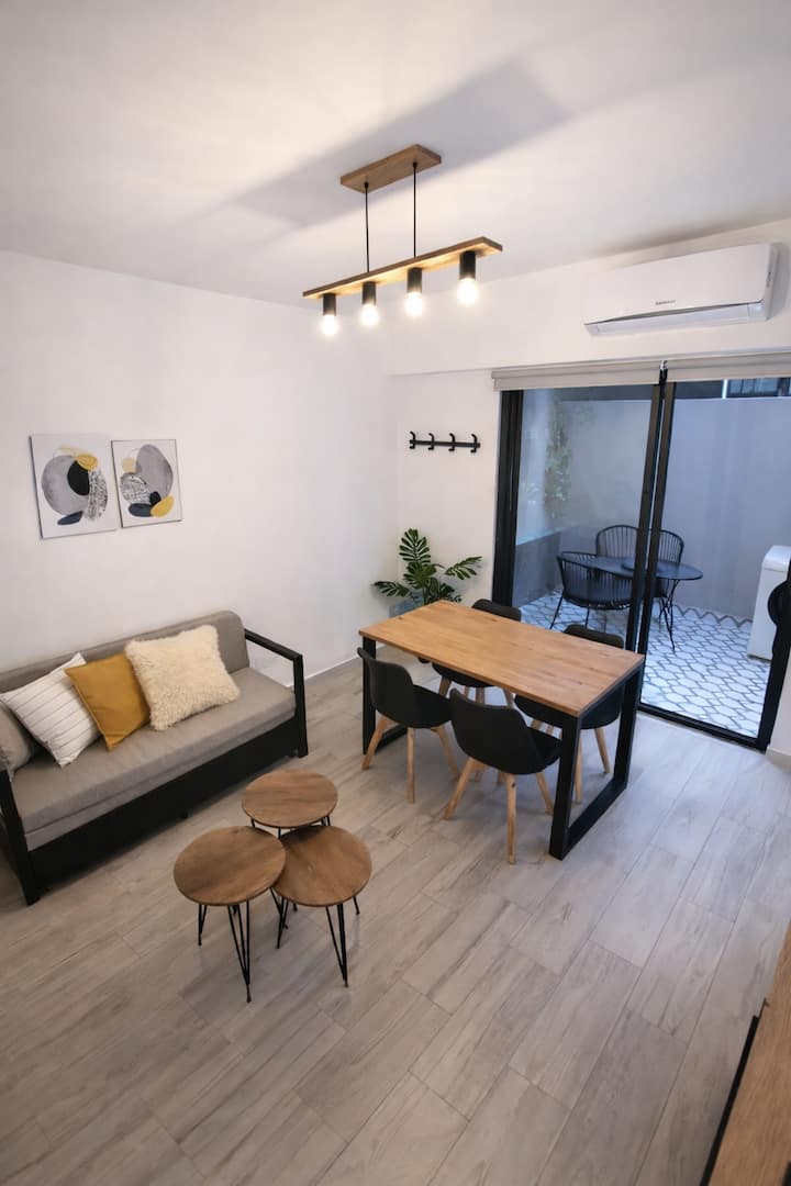 Apartamento em Palermo Soho, na Calle Armenia 1900. Tem 1 quarto, sofá-cama e capacidade para até 4 pessoas. Inclui Wi-Fi, 2 Smart TVs e máquina de lavar, além de pátio interno. Acesso dos hóspedes: todo o apartamento.