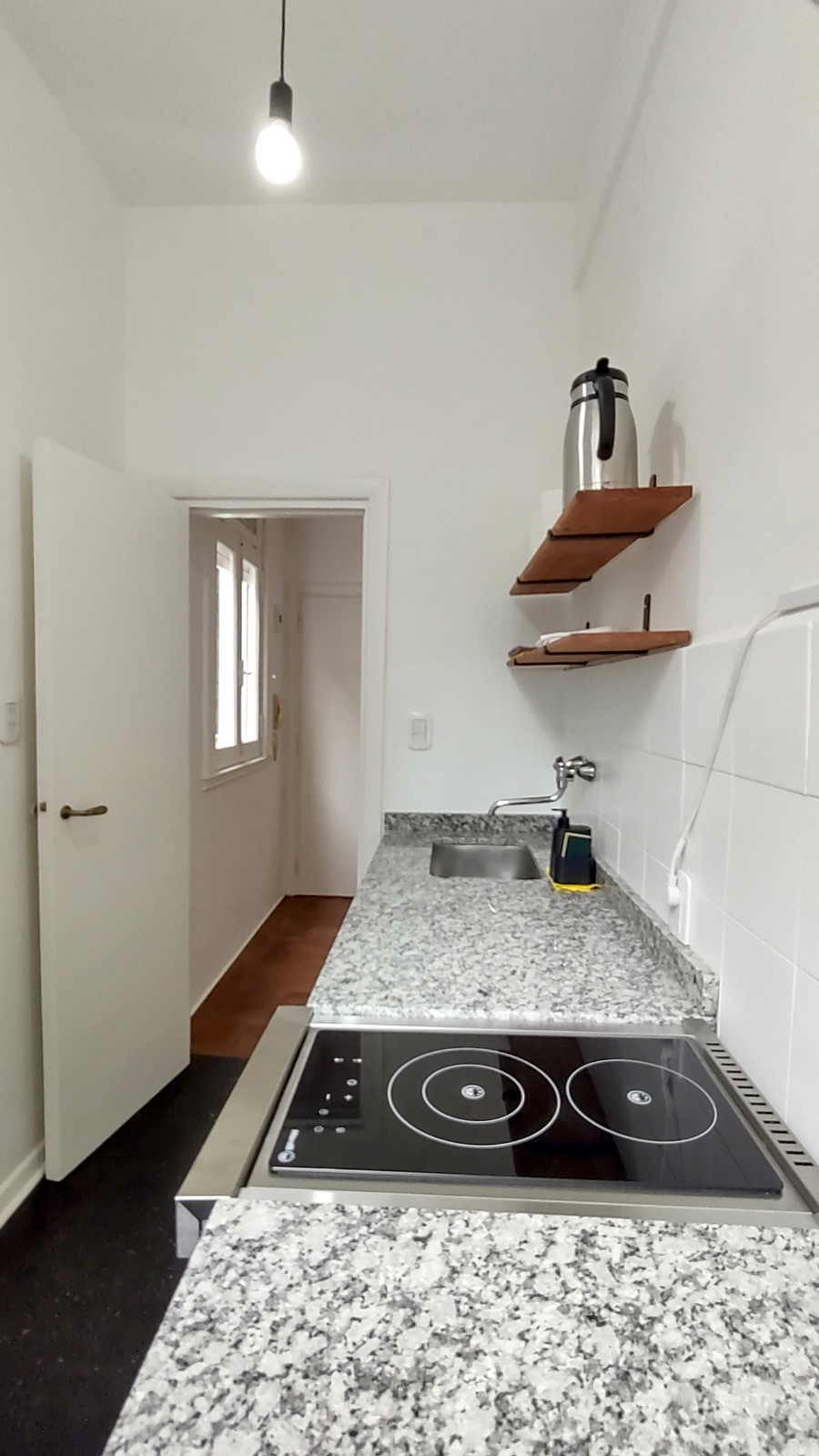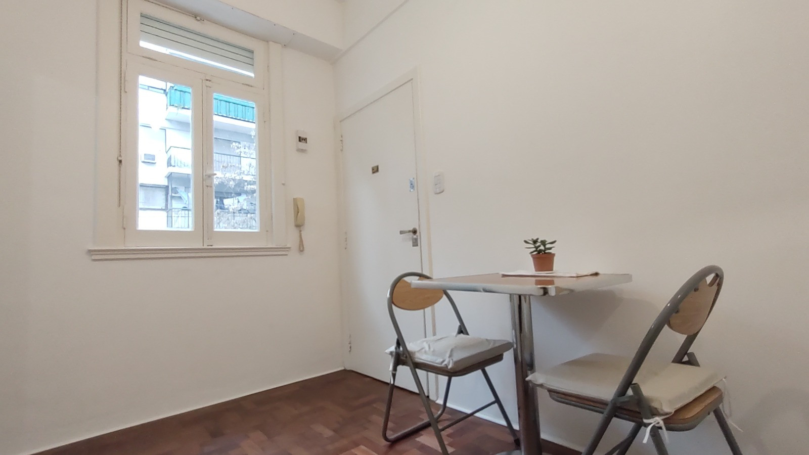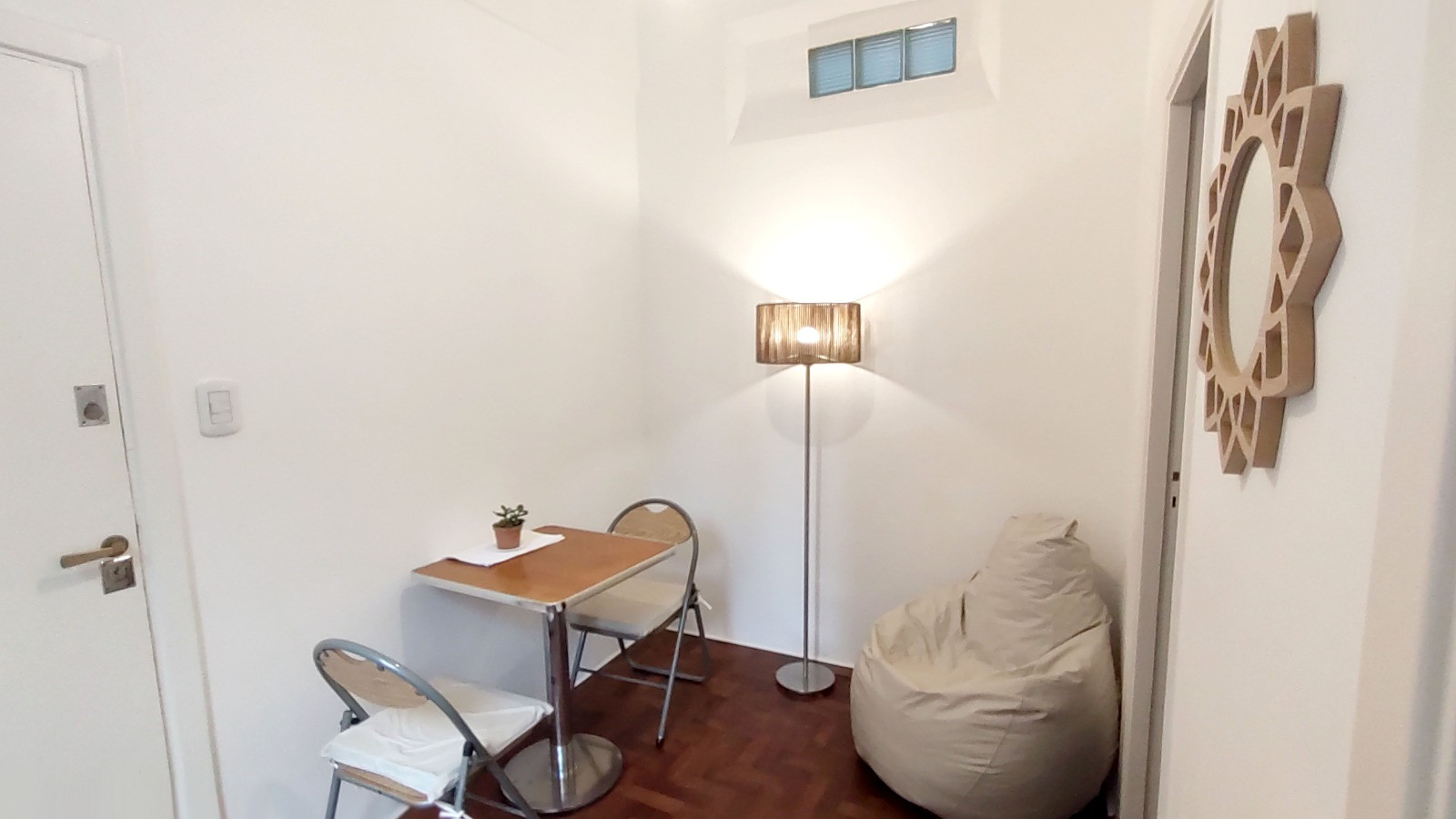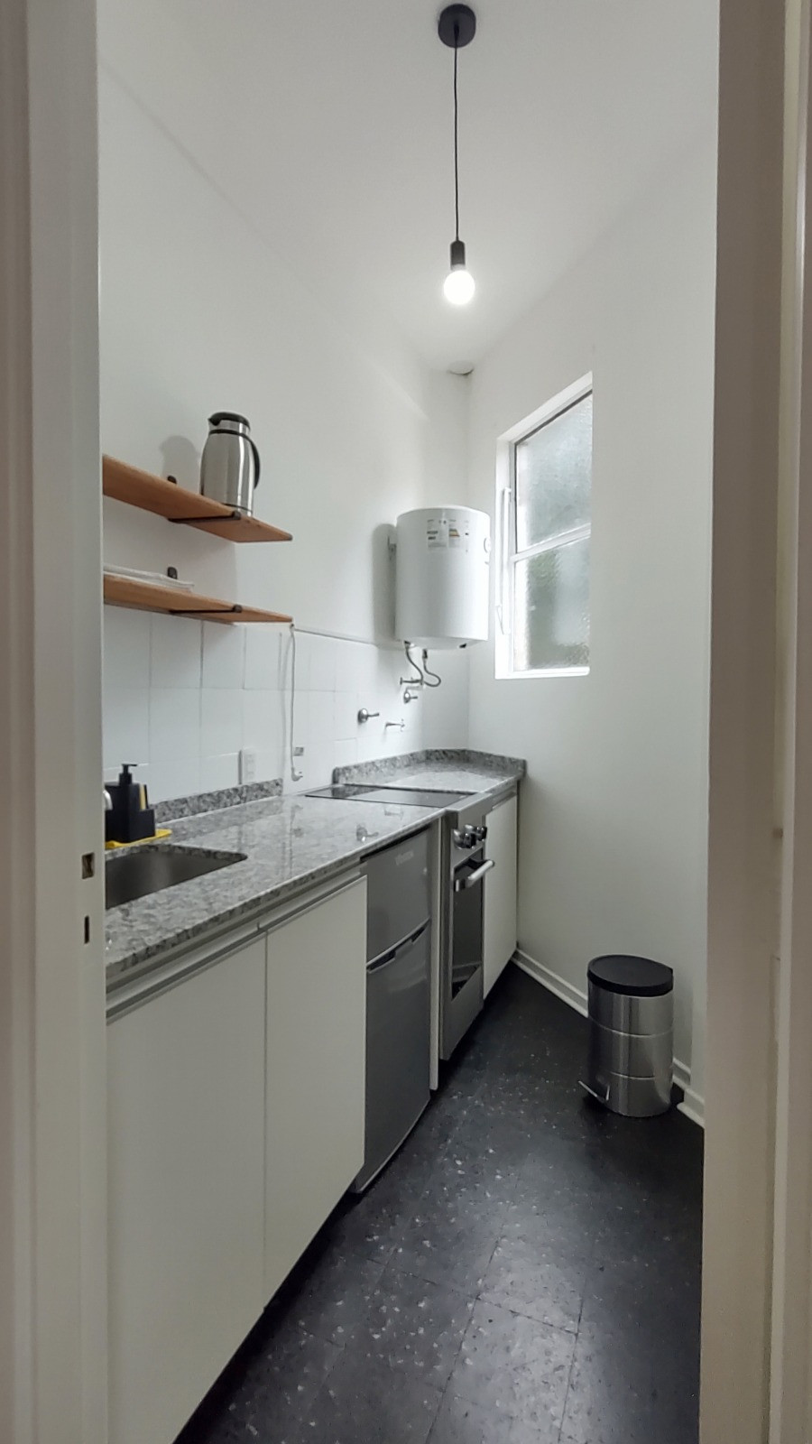 Apartamento de 2 ambientes mobiliado, pronto para morar, com cozinha equipada. Possui living com mesa para 2 pessoas, quarto com cama de casal, escrivaninha e ar-condicionado, além de banheiro completo com banheira. Inclui varanda com varal e termotanque e geladeira.