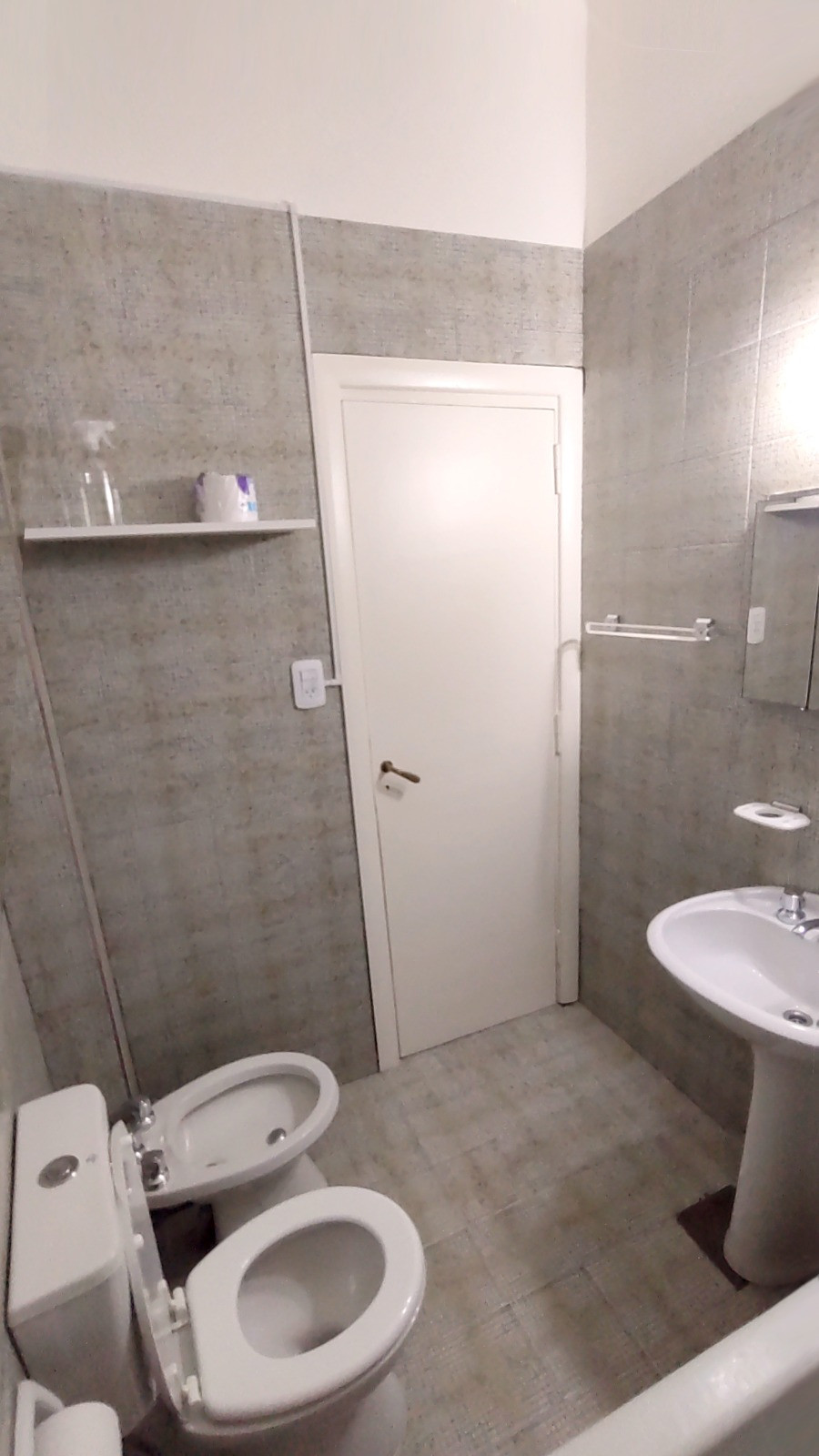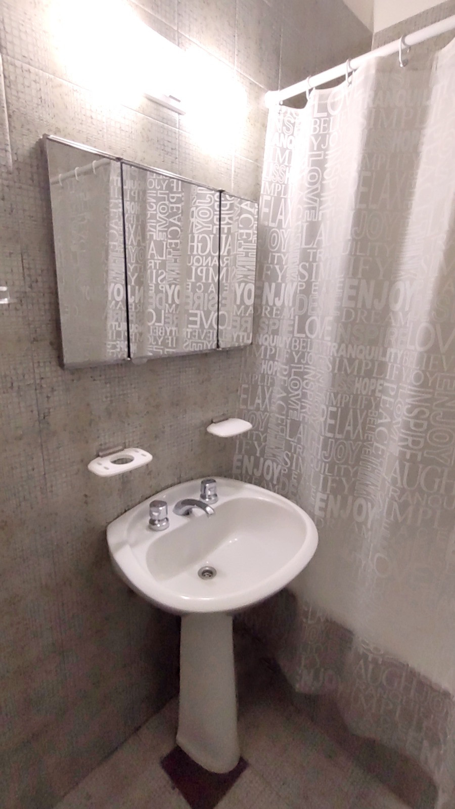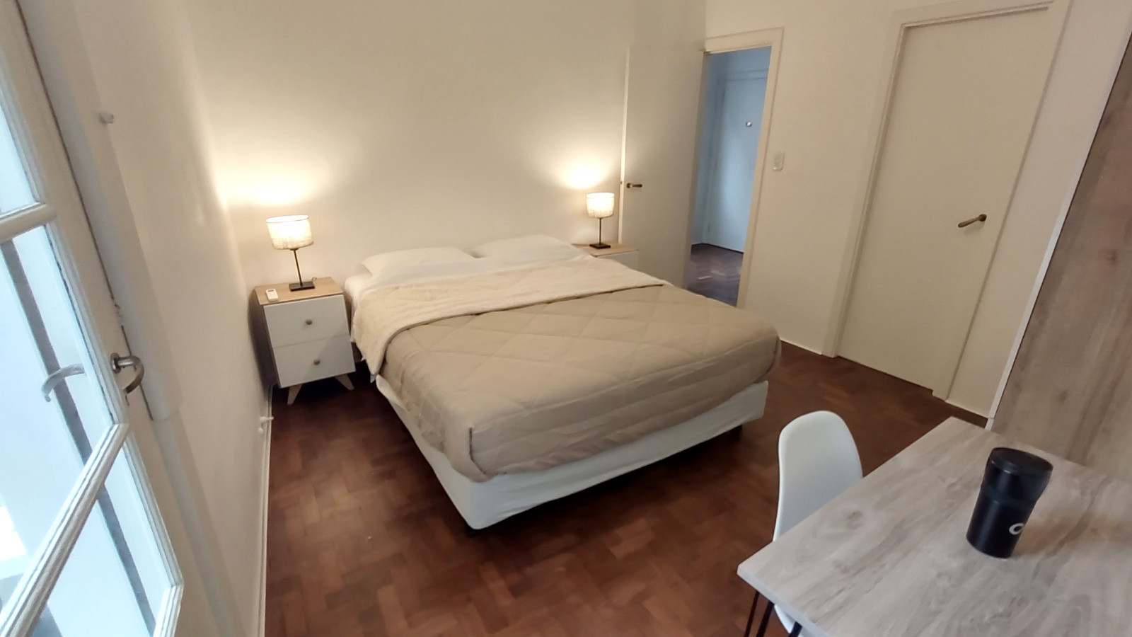 Apartamento de 2 ambientes mobiliado, pronto para morar, com cozinha equipada. Possui living com mesa para 2 pessoas, quarto com cama de casal, escrivaninha e ar-condicionado, além de banheiro completo com banheira. Inclui varanda com varal e termotanque e geladeira.