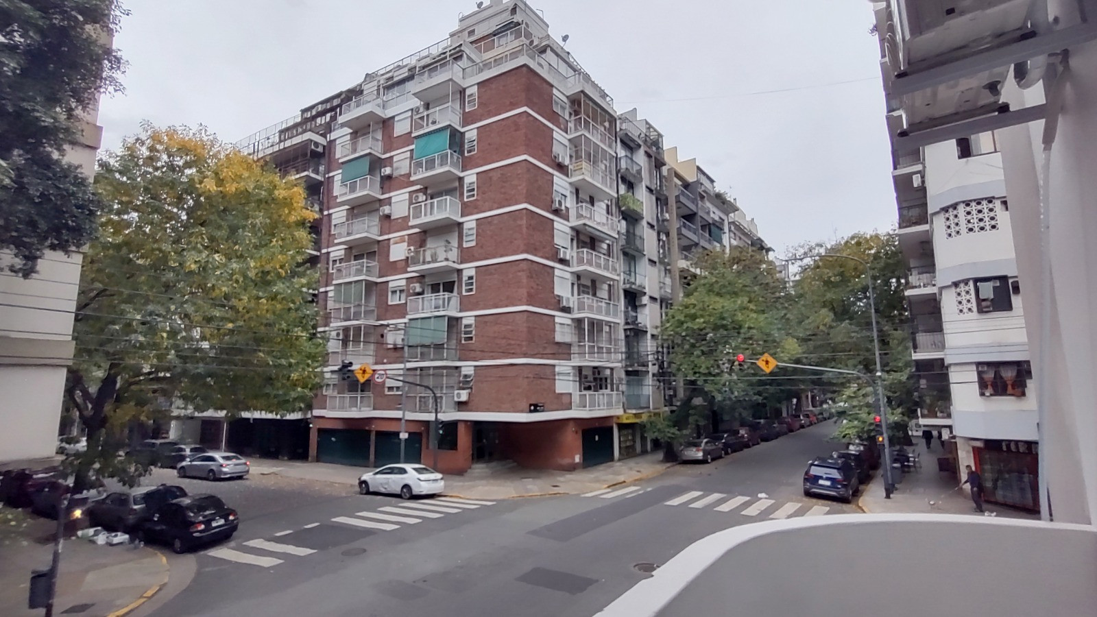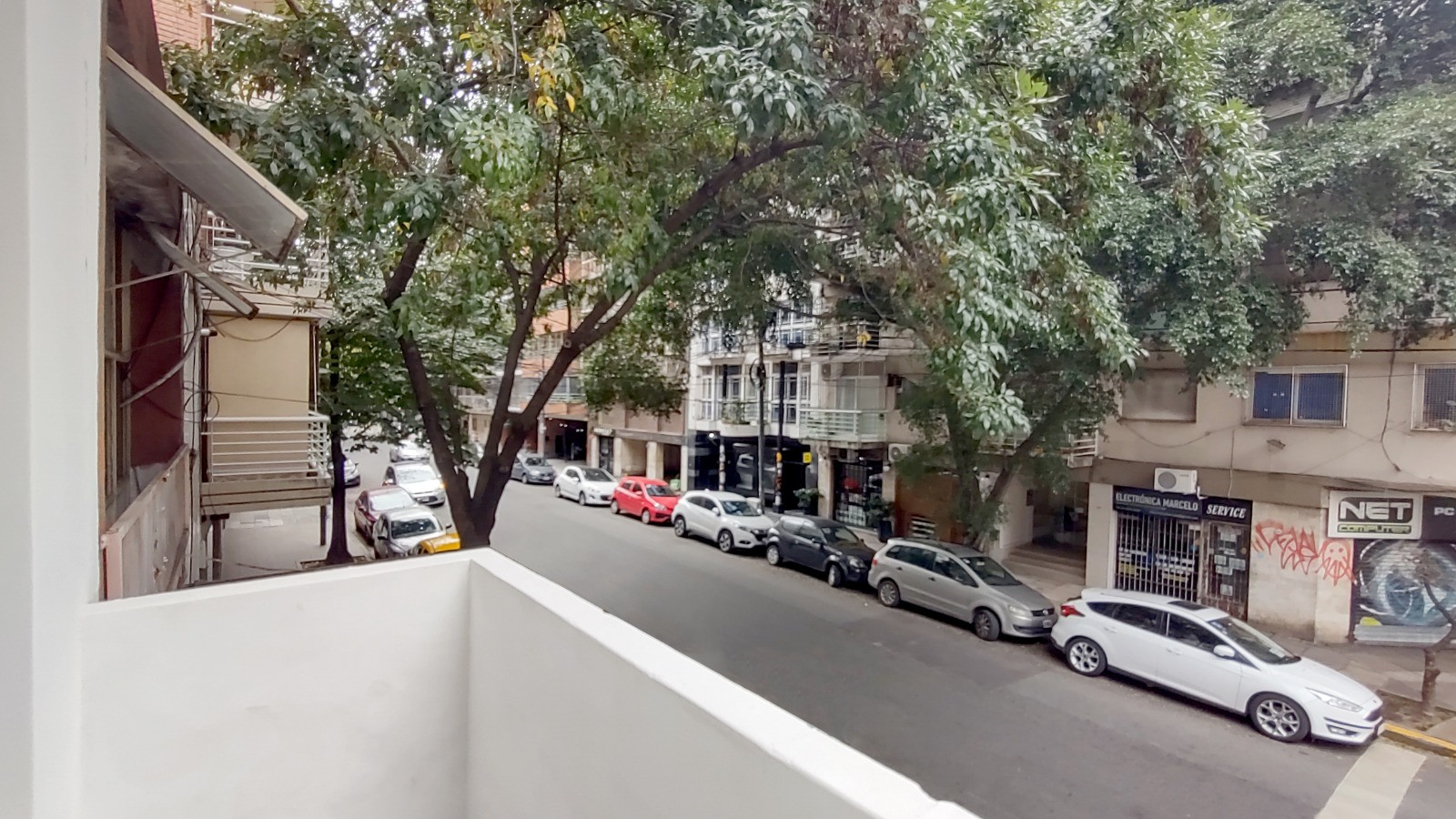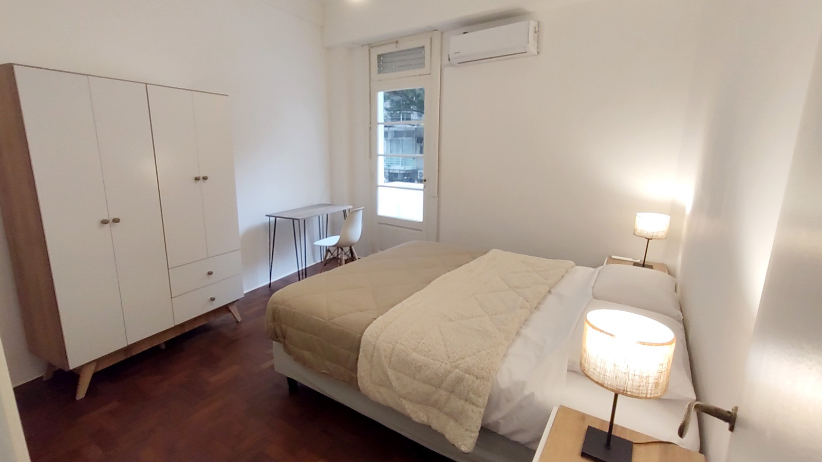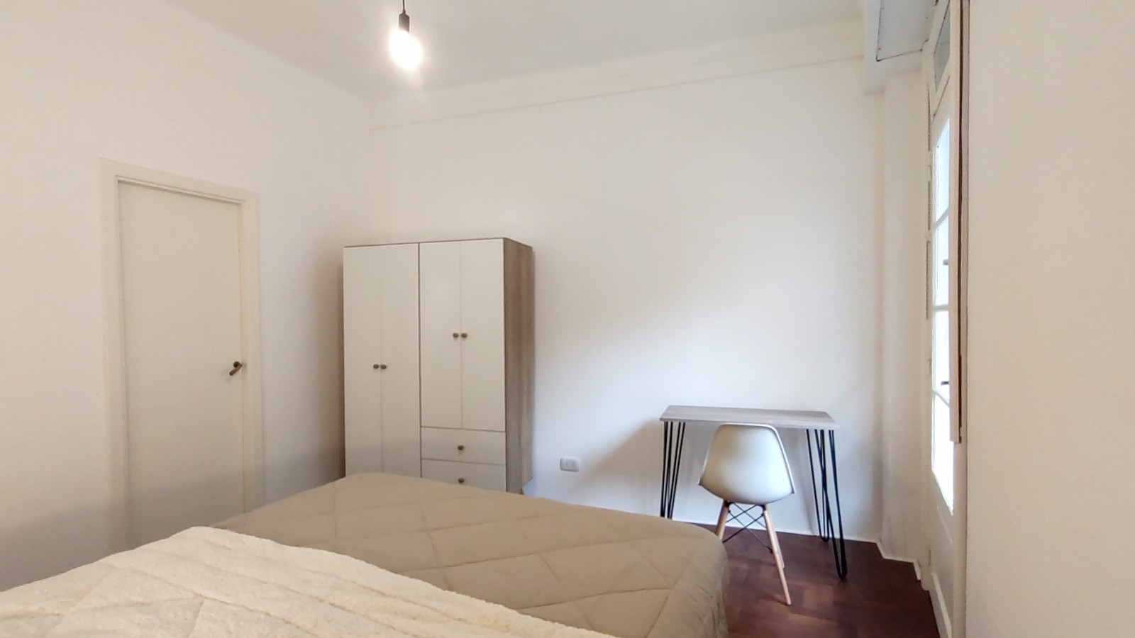 Apartamento de 2 ambientes mobiliado, pronto para morar, com cozinha equipada. Possui living com mesa para 2 pessoas, quarto com cama de casal, escrivaninha e ar-condicionado, além de banheiro completo com banheira. Inclui varanda com varal e termotanque e geladeira.