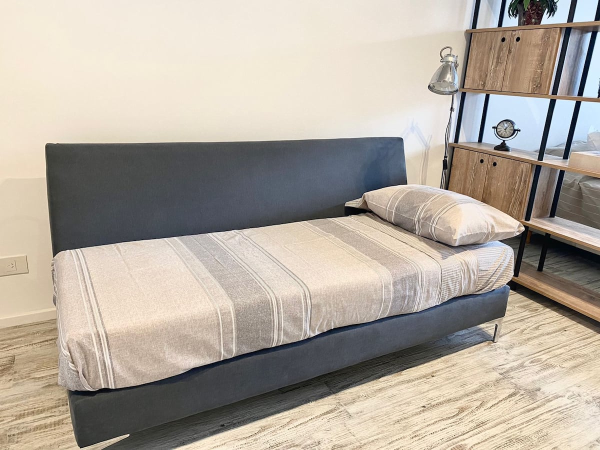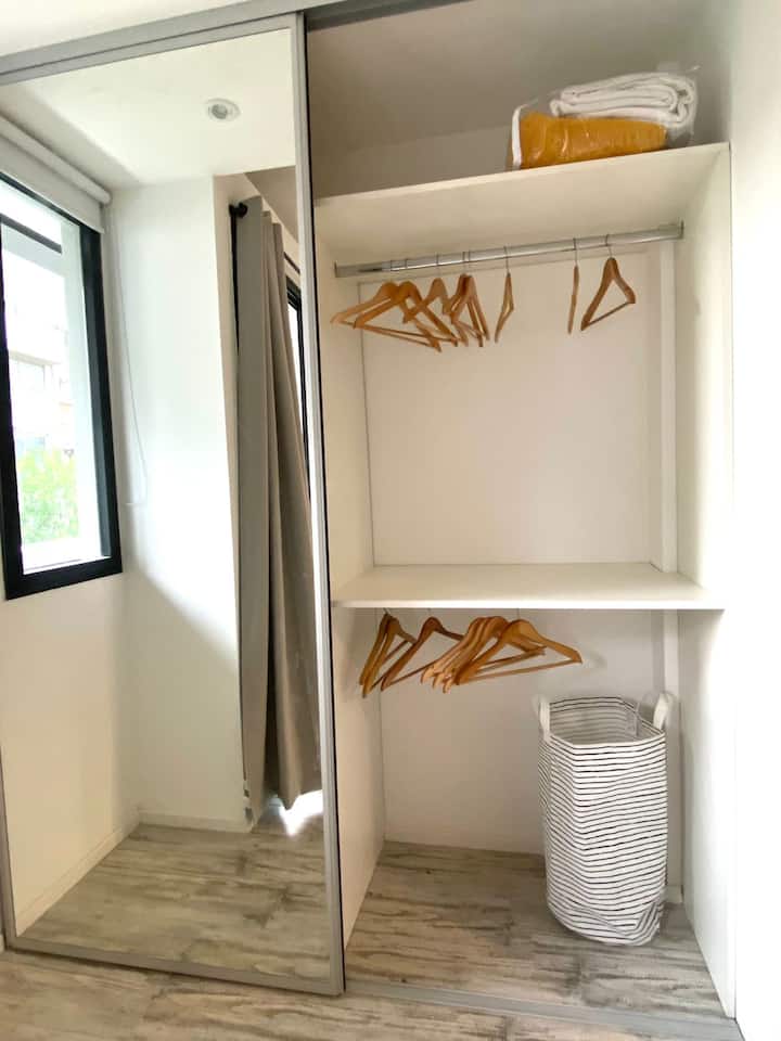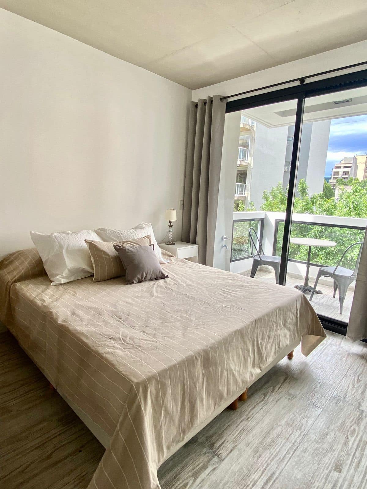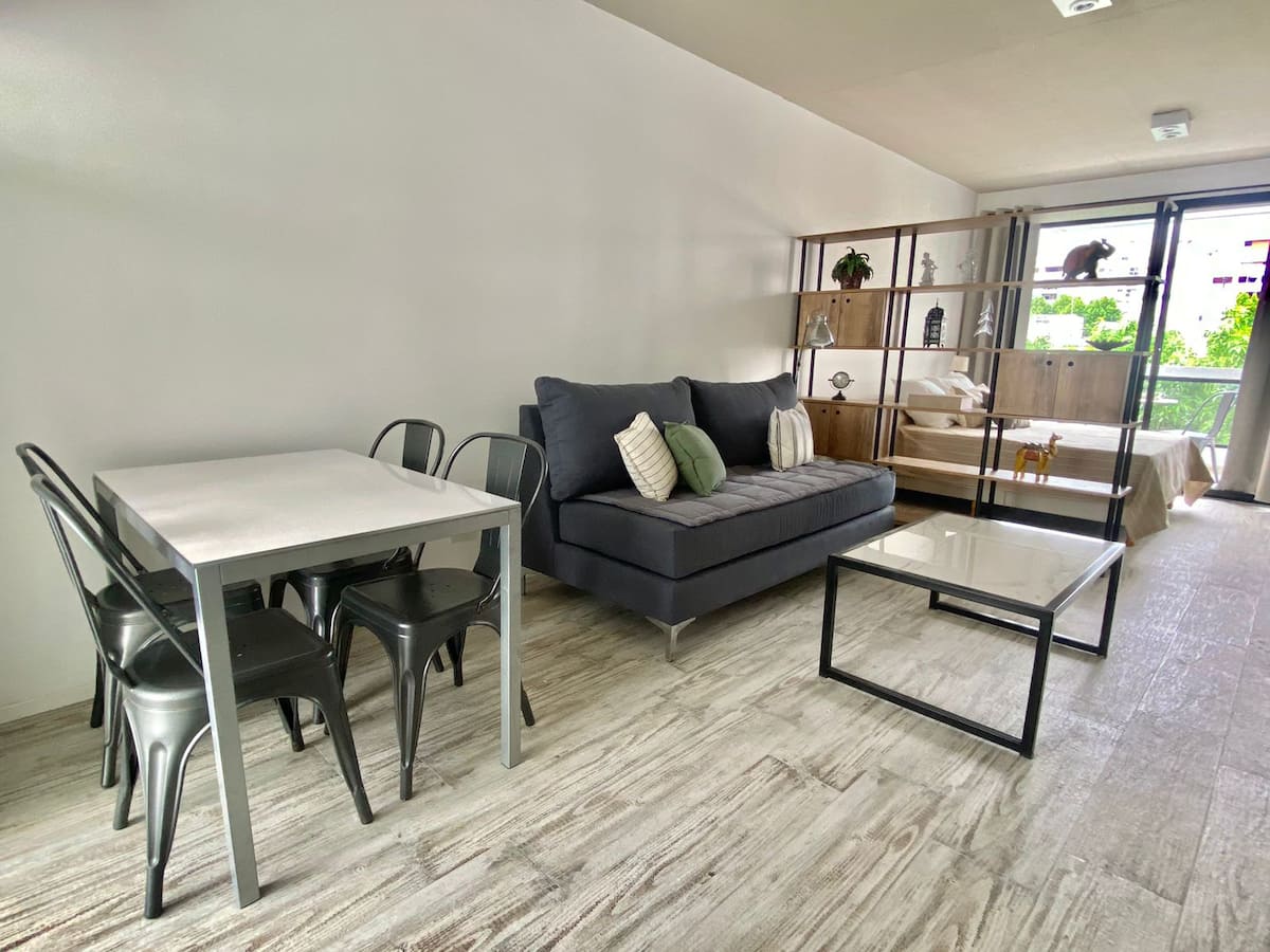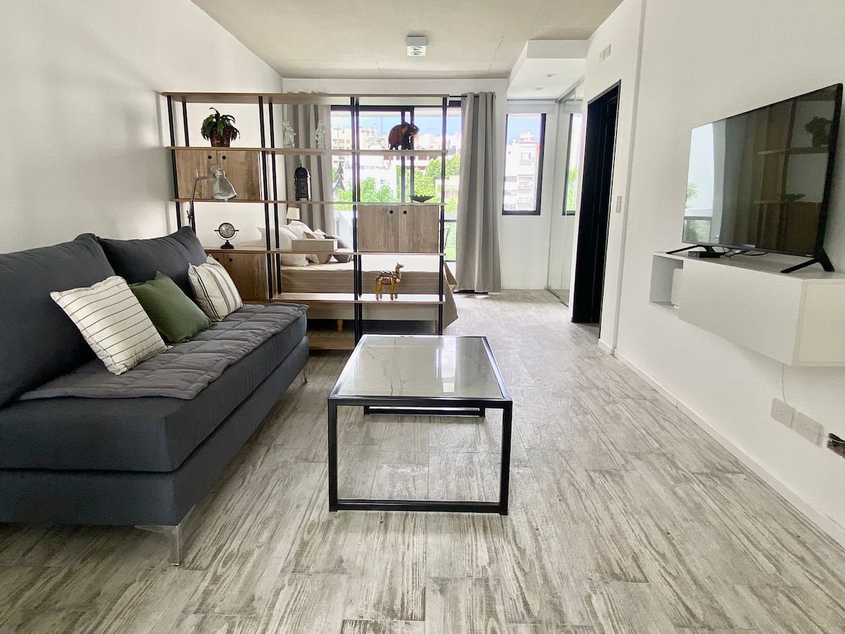 Estúdio de 50 m² em Palermo, novo, com varanda e janela de frente para a rua. Mobiliado para 3 pessoas, com cama queen, sofá-cama (65x180 cm), armários, ar-condicionado, máquina de lavar e Wi-Fi de alta velocidade (300 Mb). Há check-in por autoatendimento com fechadura inteligente; a porta do prédio deve ser mantida fechada corretamente até completar o fechamento.