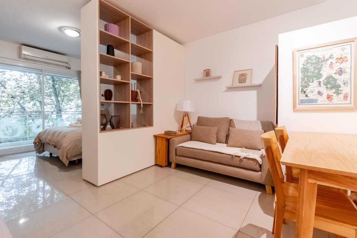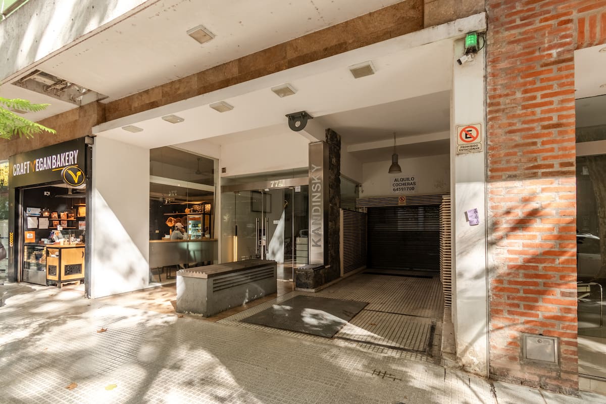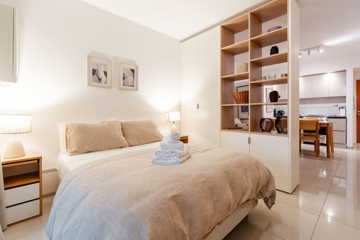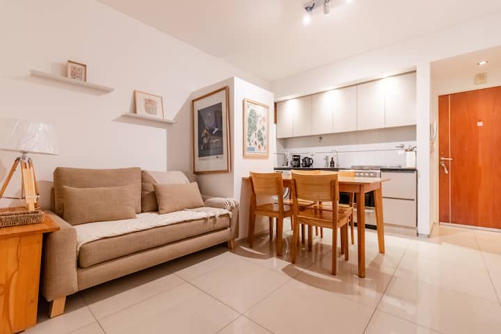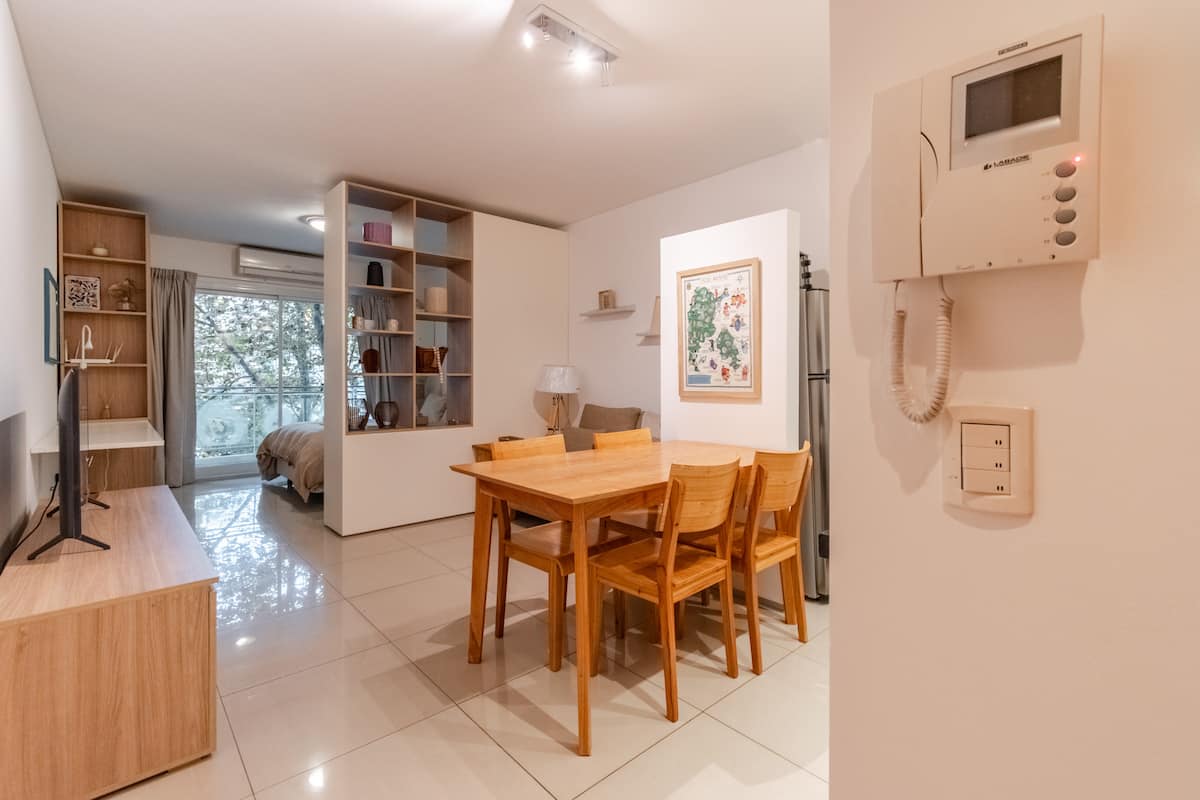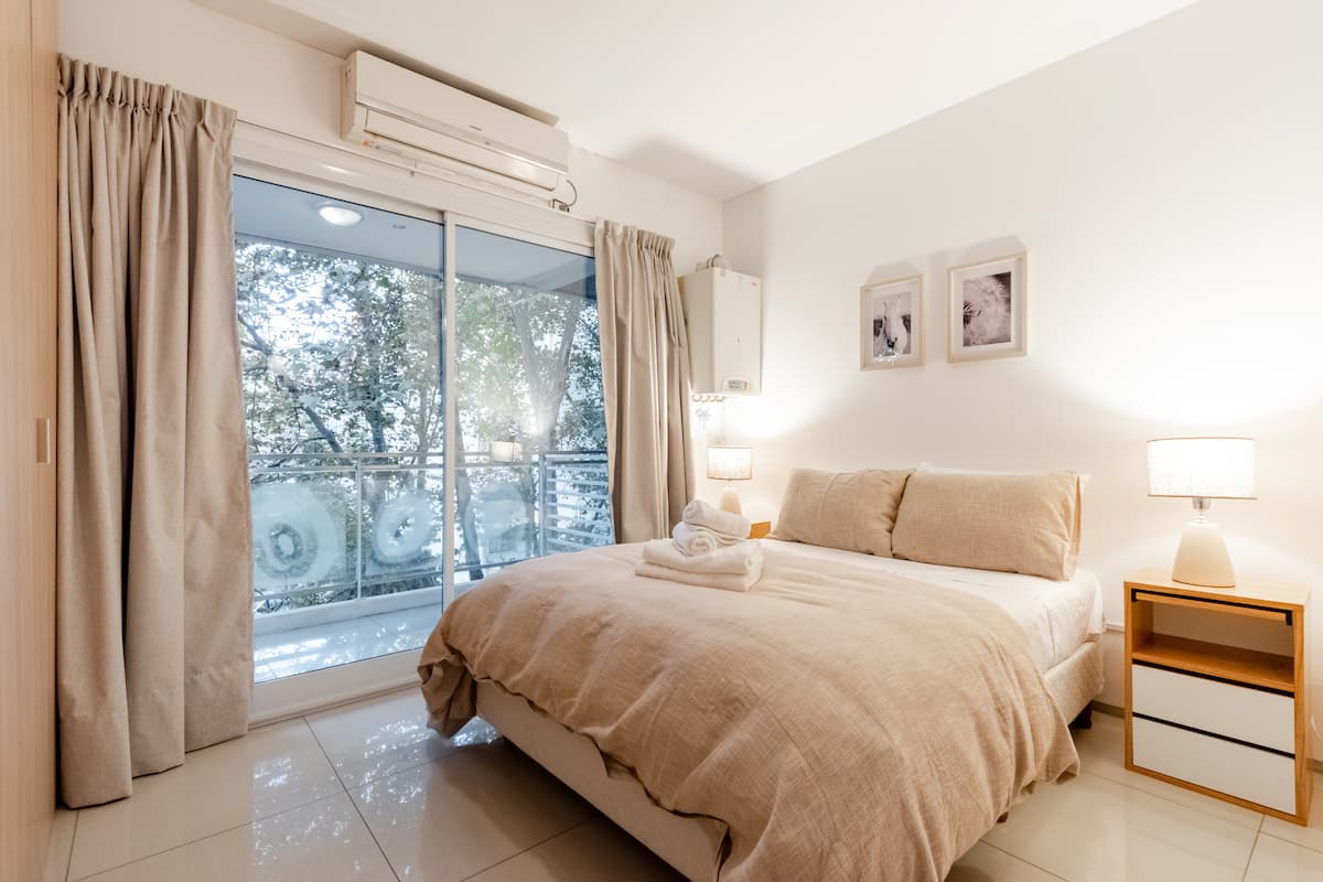 Apartamento em Palermo, com 1 quarto. A unidade tem cama de casal, cozinha equipada com aparelhos, filtro de água e utensílios, banheiro completo, WiFi de alta velocidade, ar-condicionado e TV. Fica perto de bares, restaurantes, lojas e transporte público.