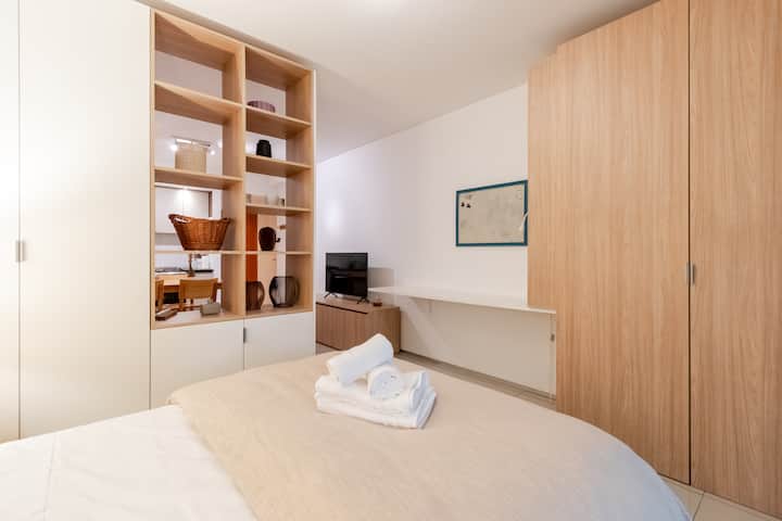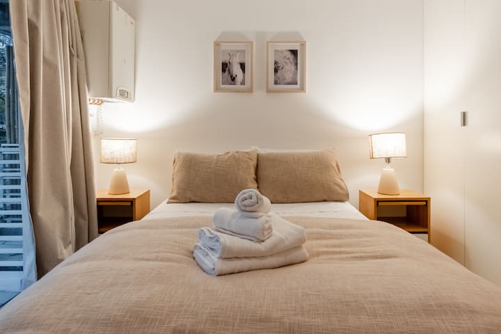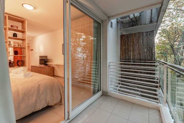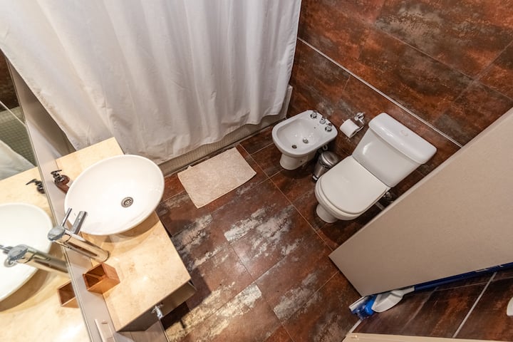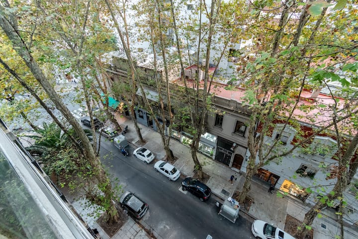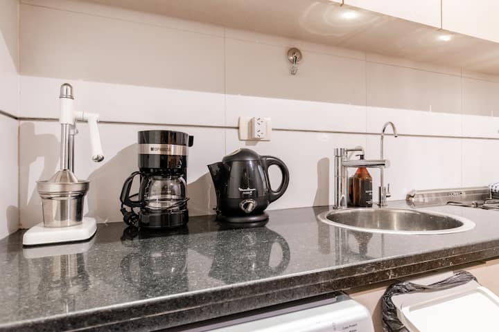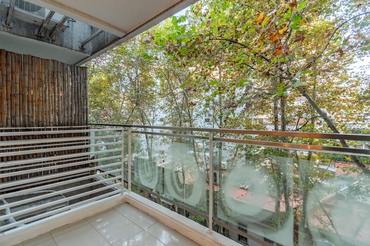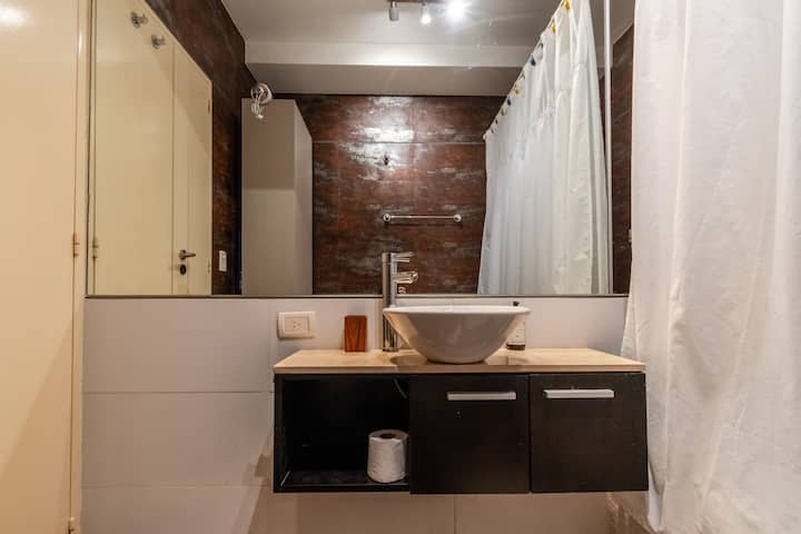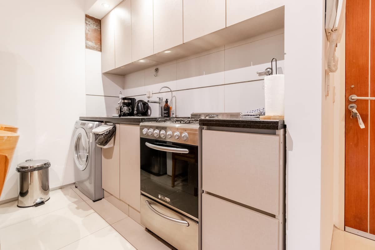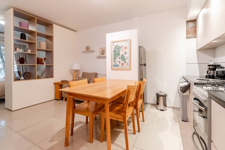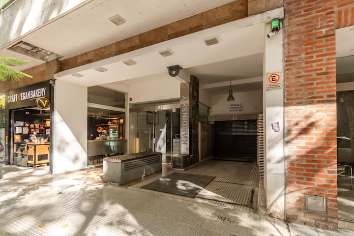 Apartamento em Palermo, com 1 quarto. A unidade tem cama de casal, cozinha equipada com aparelhos, filtro de água e utensílios, banheiro completo, WiFi de alta velocidade, ar-condicionado e TV. Fica perto de bares, restaurantes, lojas e transporte público.