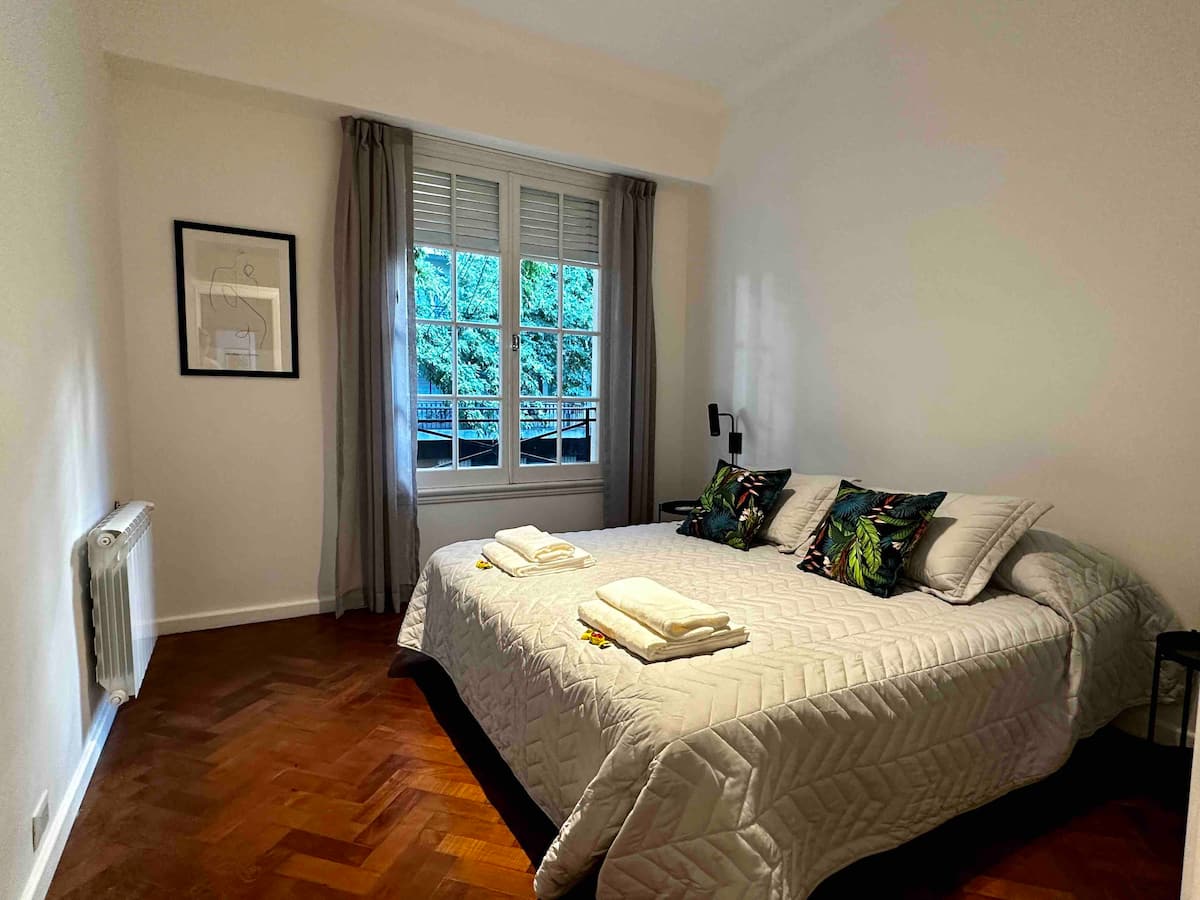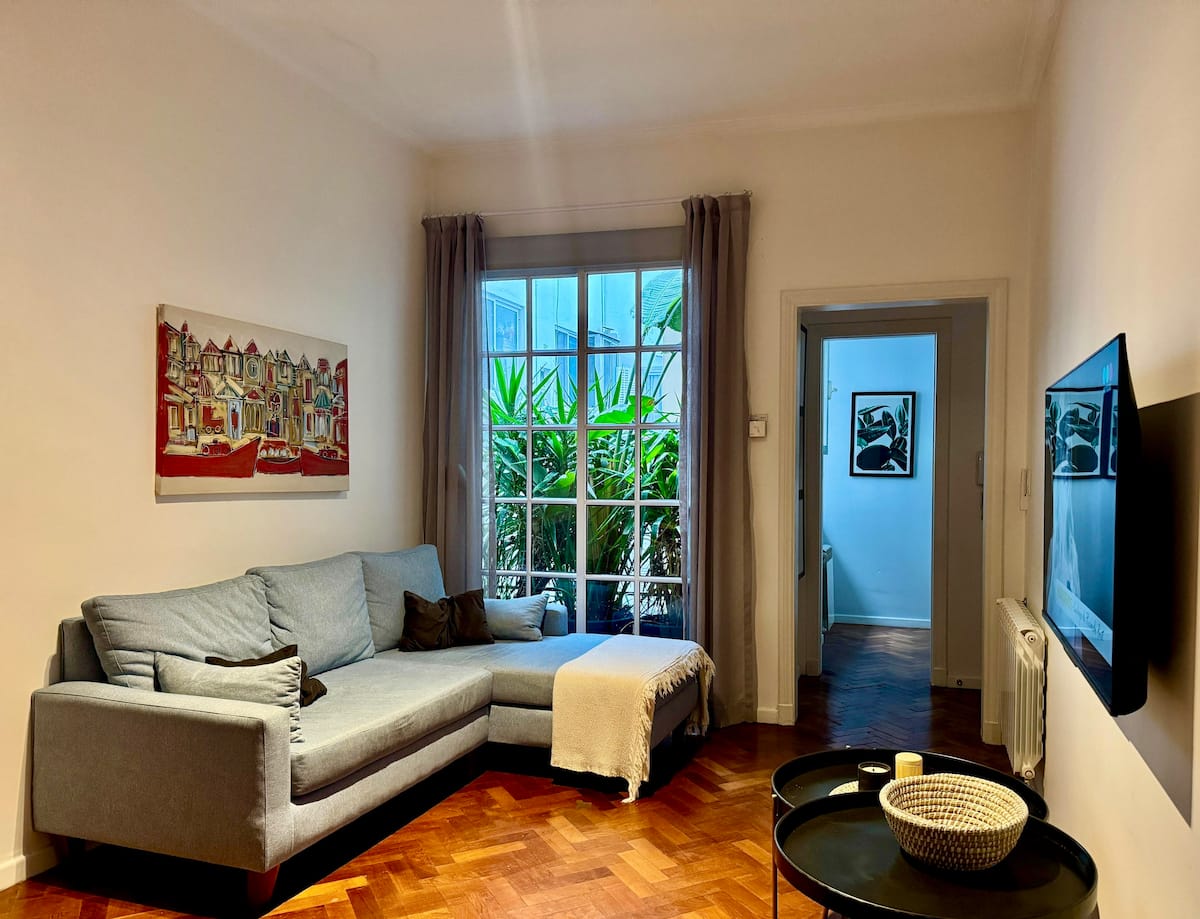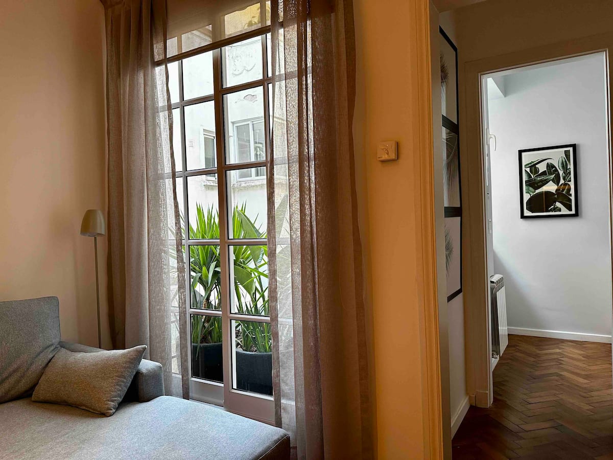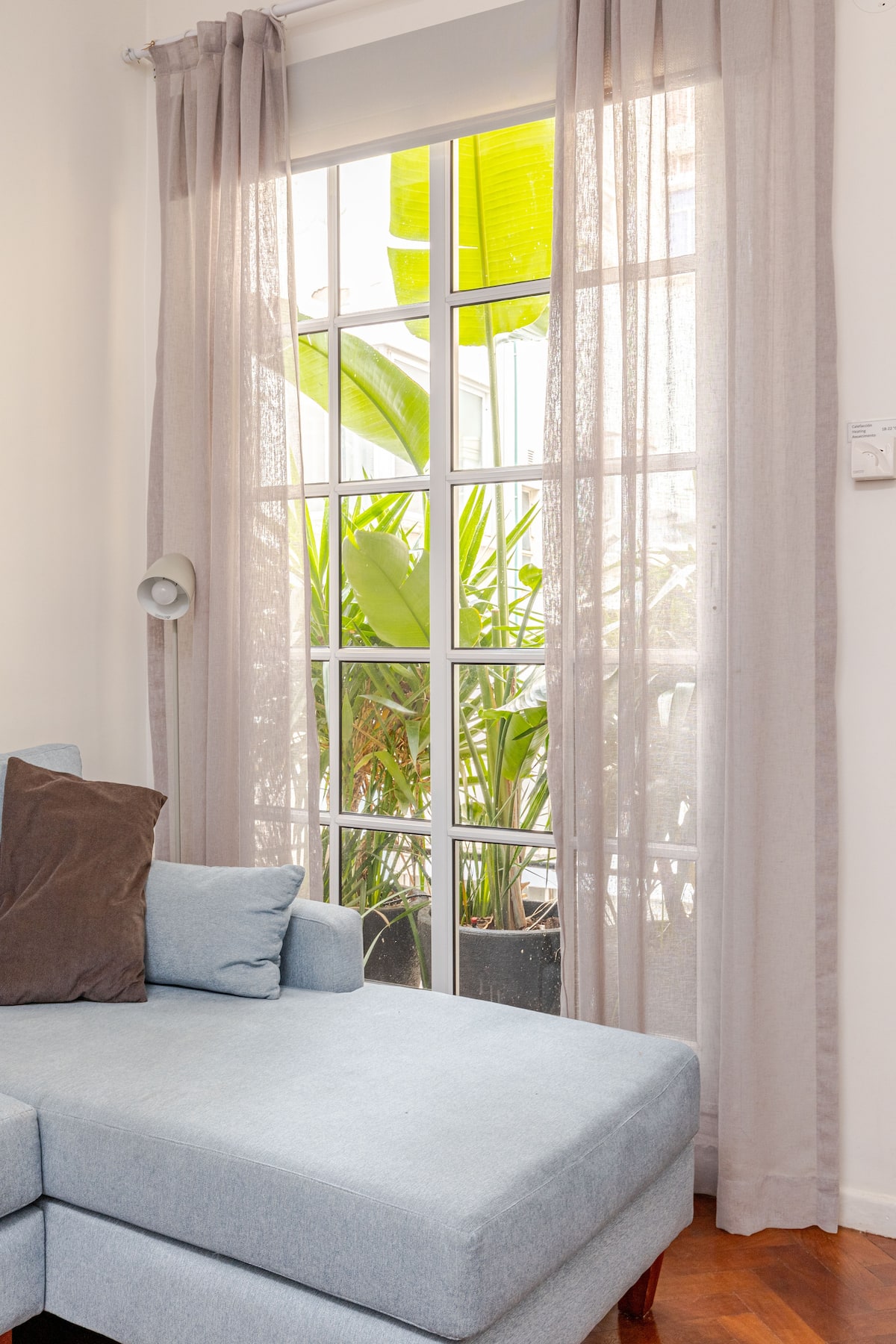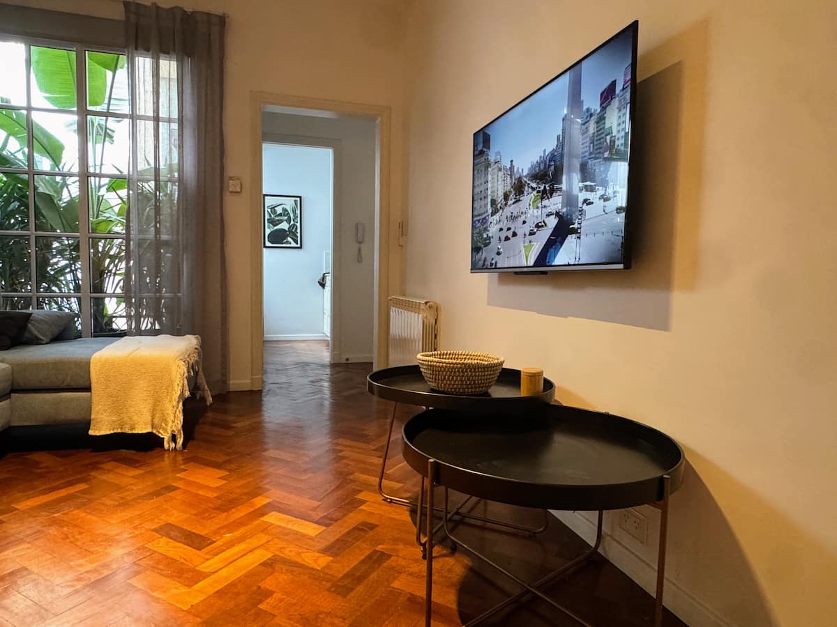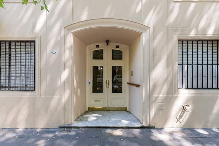 Apartamento com 1 quarto em Palermo Soho. Foi reformado e mantém o estilo francês, com ajustes para as necessidades atuais. Inclui sala com sofá em formato de L e mesa de trabalho, cozinha, varanda com vista para área interna, banheiro, closet e quarto.