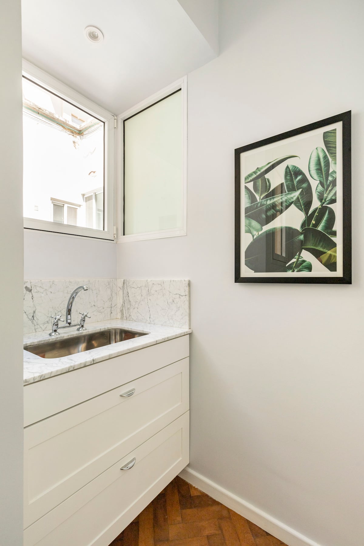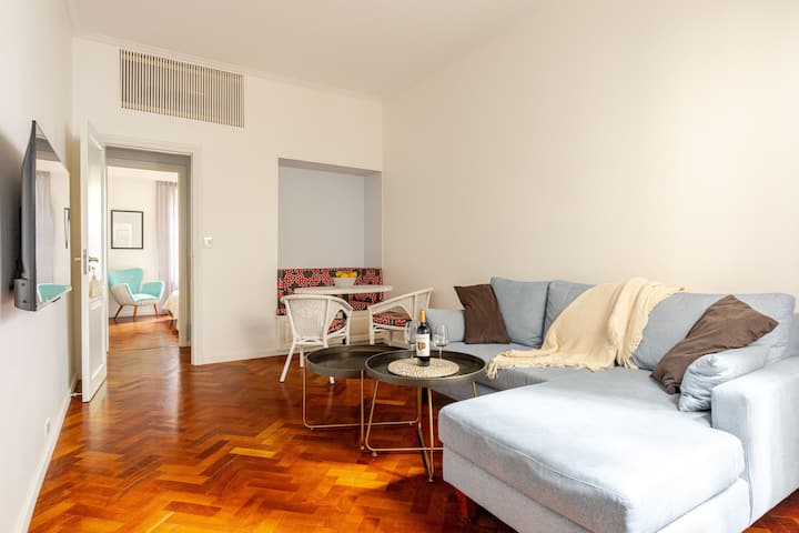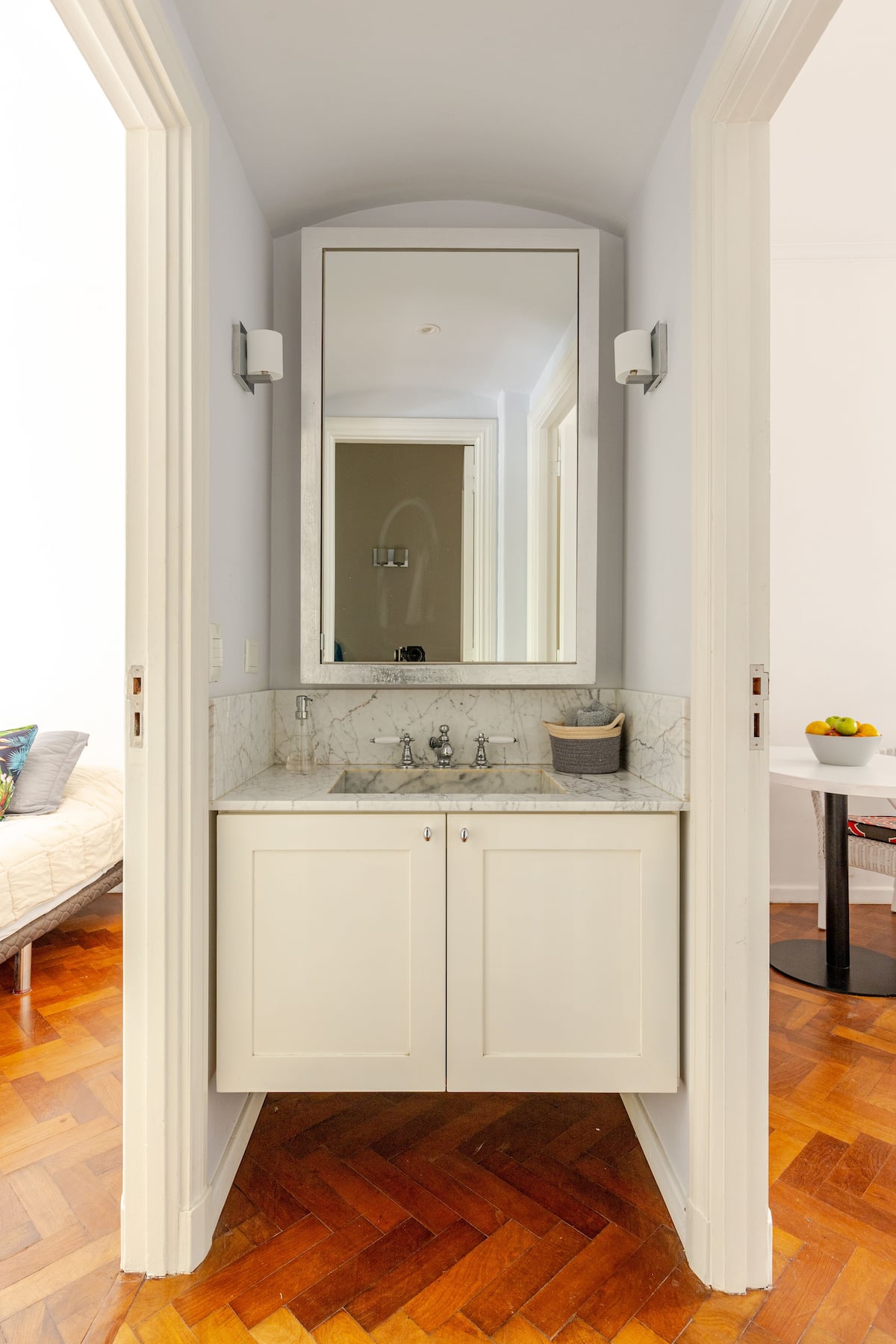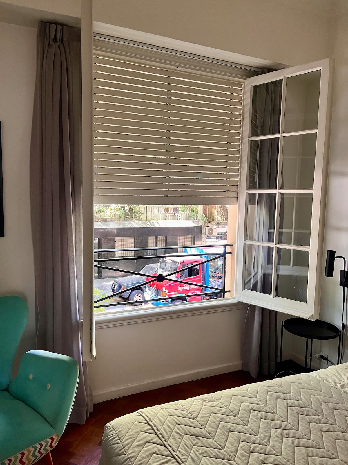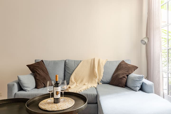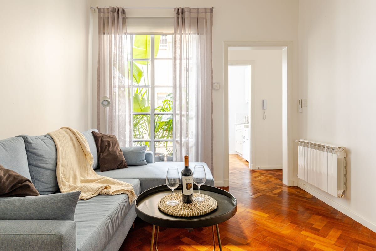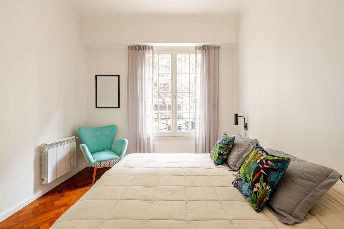 Apartamento com 1 quarto em Palermo Soho. Foi reformado e mantém o estilo francês, com ajustes para as necessidades atuais. Inclui sala com sofá em formato de L e mesa de trabalho, cozinha, varanda com vista para área interna, banheiro, closet e quarto.