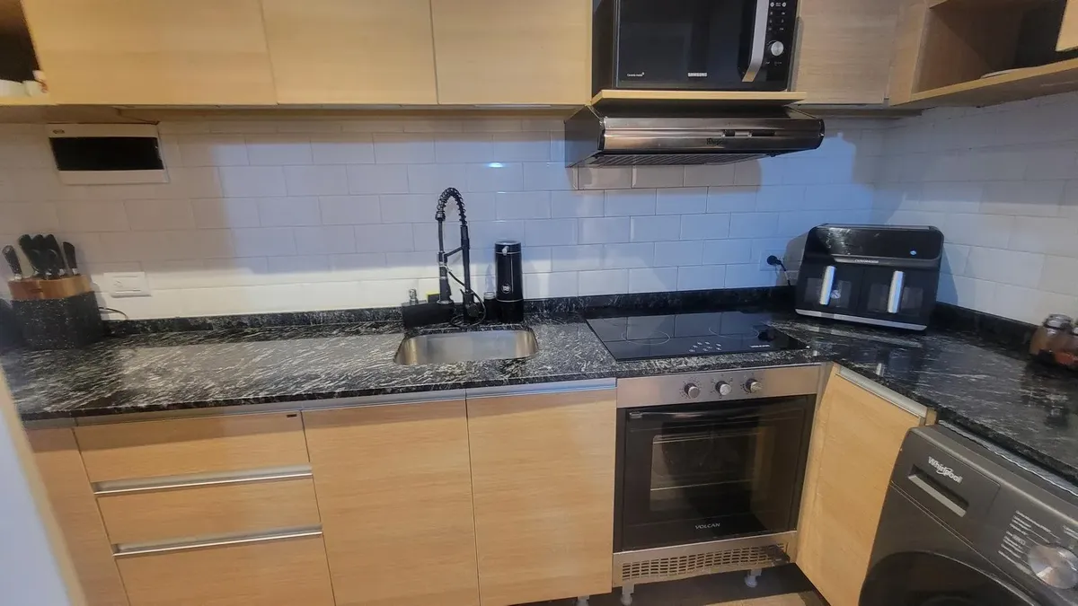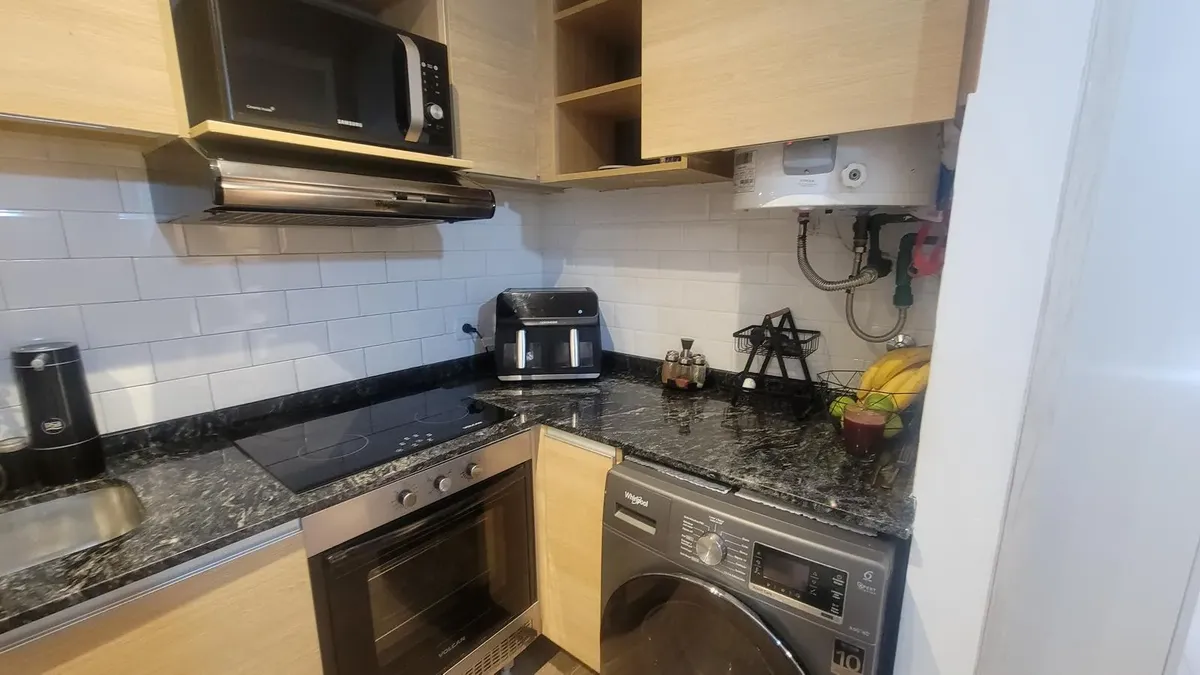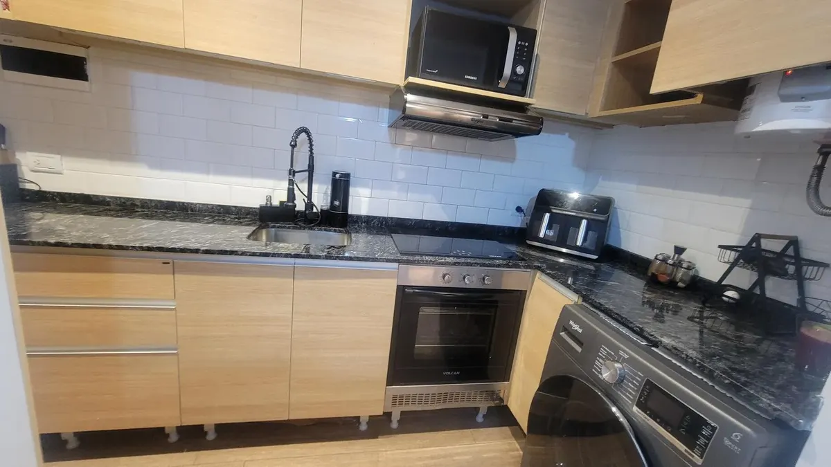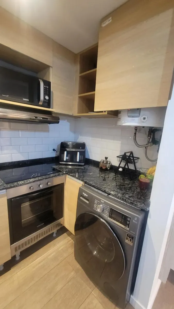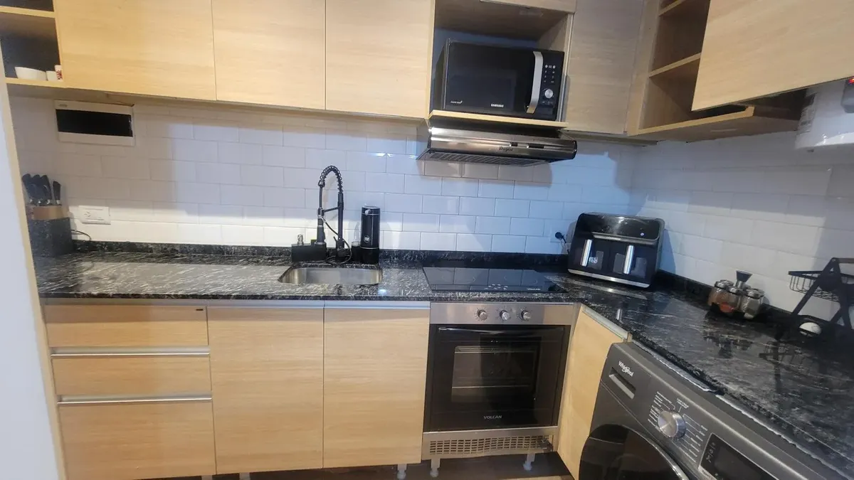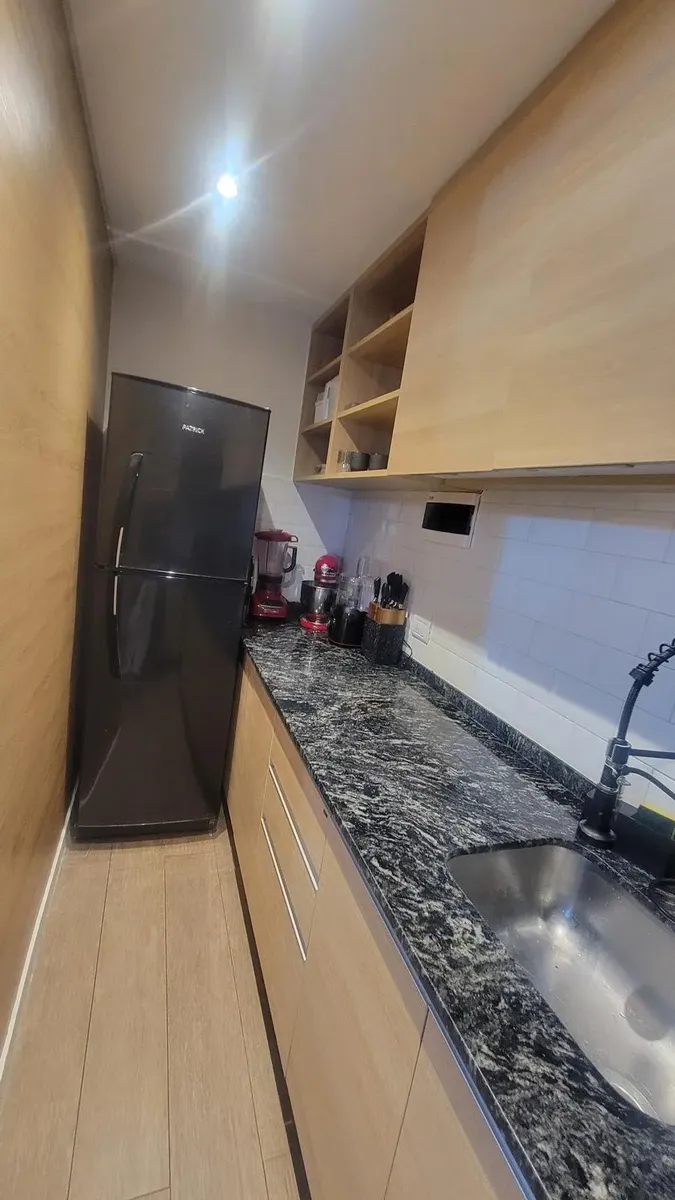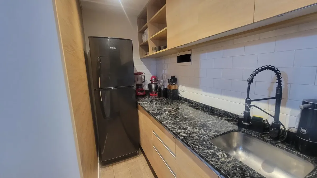 Apartamento de 2,5 ambientes sem mobília em Palermo, com 1 quarto e balcão fechado de 2 x 3 m. Living de 3,50 x 2,70 m com saída para varanda francesa voltada para os fundos; sala de jantar integrada de 3,50 x 2,15 m. Escritório/ambiente de 2,30 x 3,12 m; cozinha integrada de 3,80 x 1,21 m com espaço para geladeira e lavadora; banheiro completo de 2,20 x 1,60 m com box de blindex e banheiro com ducha no balcão fechado. Instalação totalmente elétrica; condomínio de 150.000. Localização próxima à