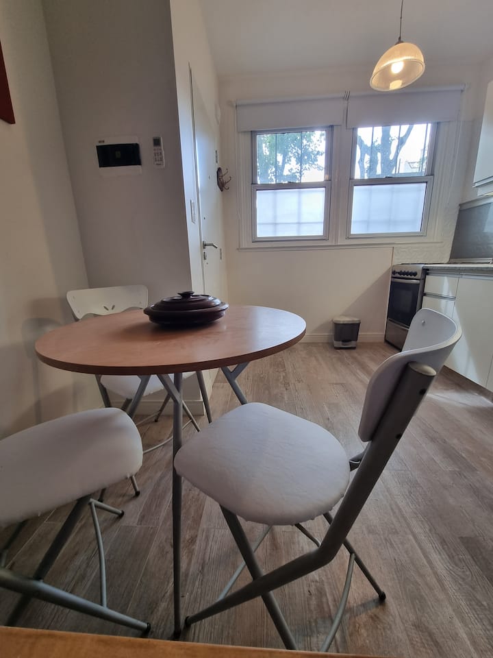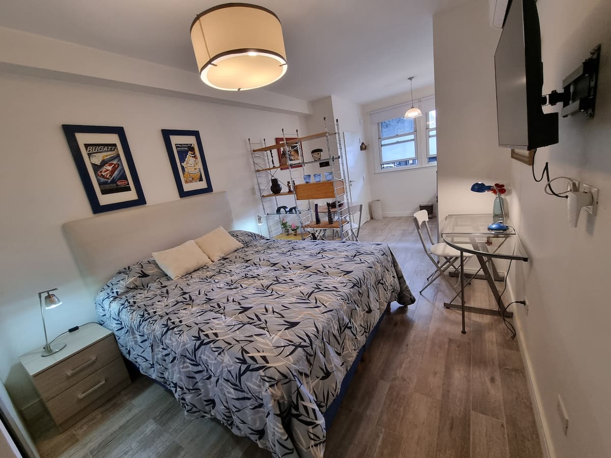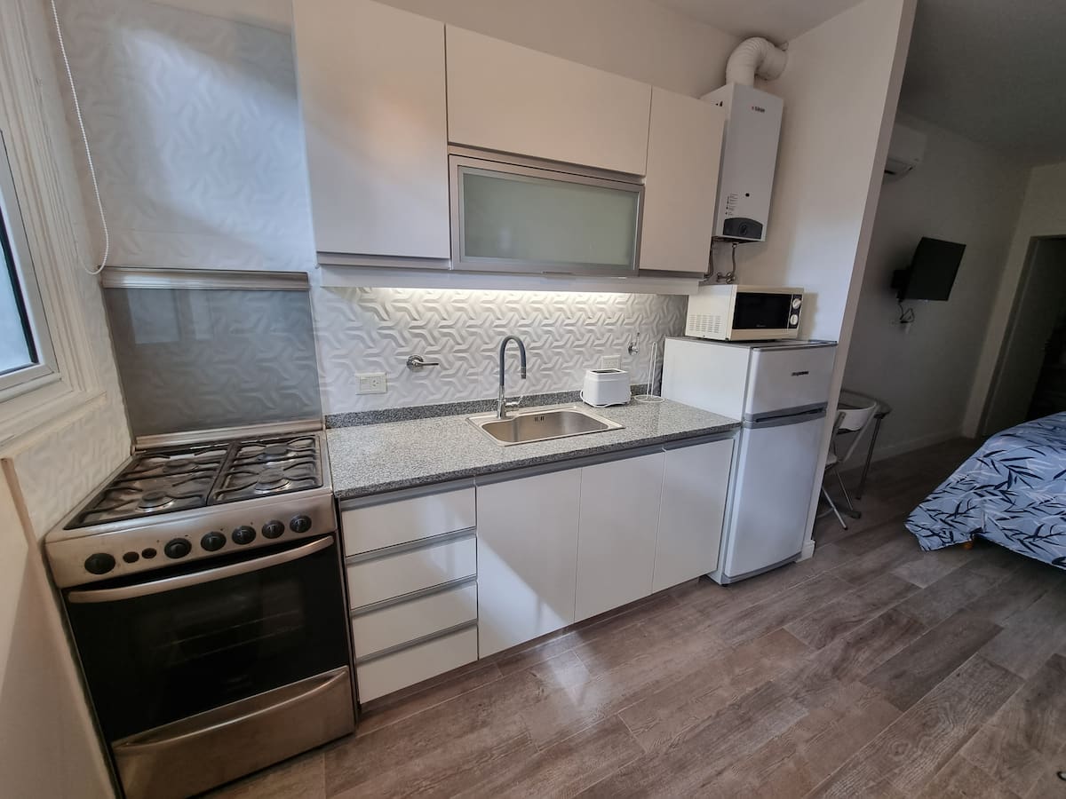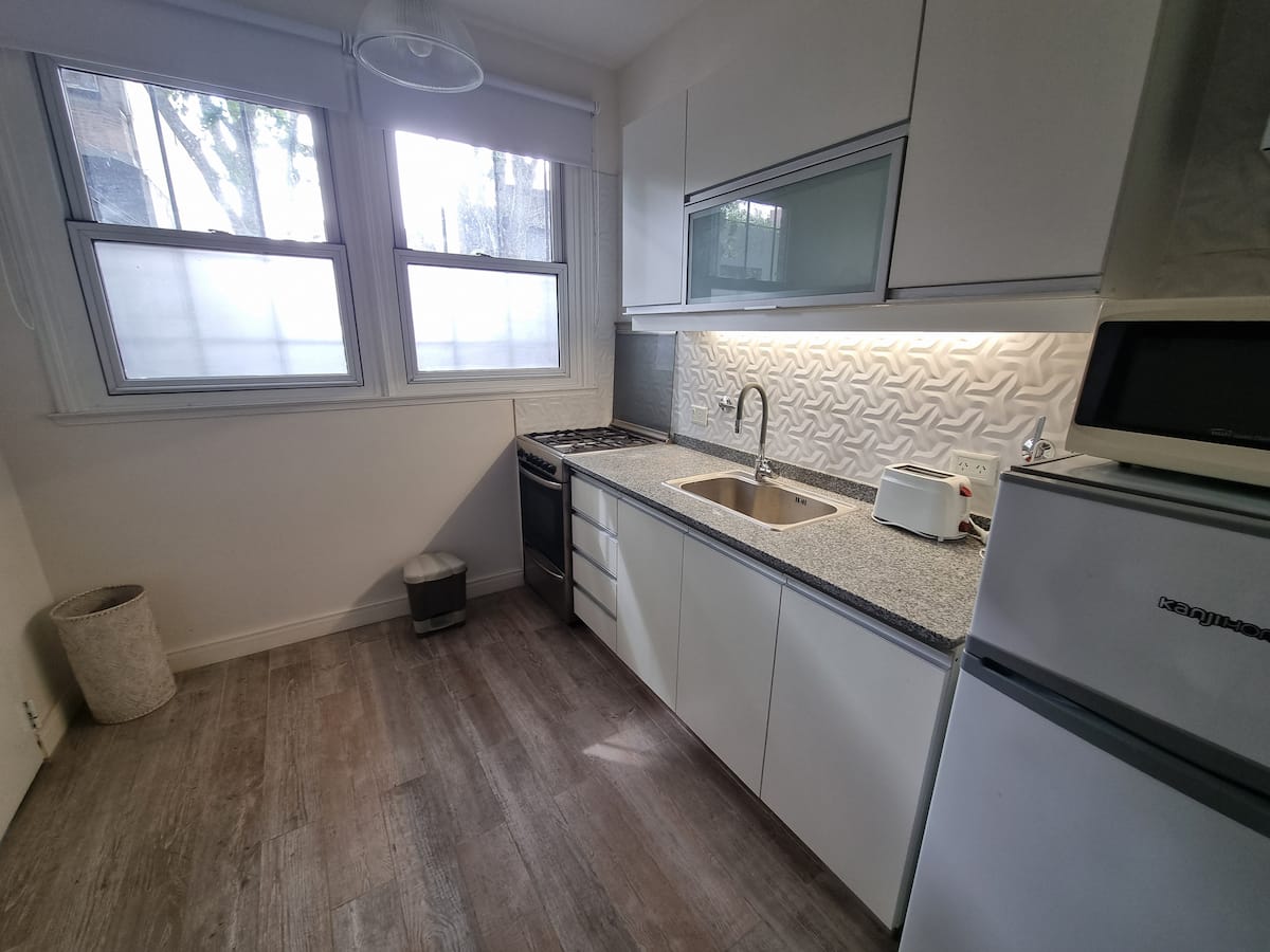 Apartamento tipo kitnet em Palermo Soho, com entrada independente e depósito para bagagens. Cozinha equipada com geladeira com freezer, fogão com forno, micro-ondas, cafeteira, chaleira elétrica, espremedor, torradeira e TV com acesso ao FLOW, além de internet de 300 MB. O imóvel foi reformado recentemente e inclui colchões novas e box springs com gavetas de armazenamento, com roupas de cama e itens de apoio. Há opção de deixar a bagagem antes do check-in e após o check-out.