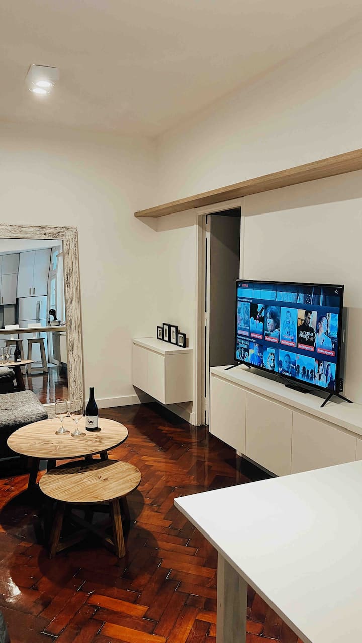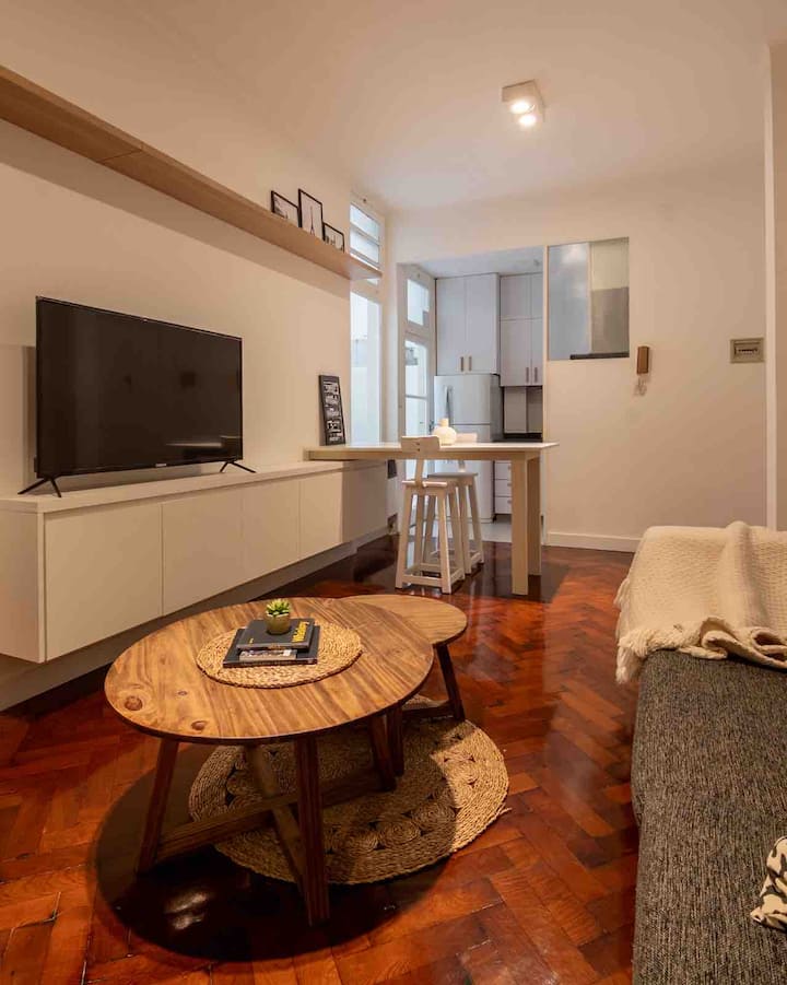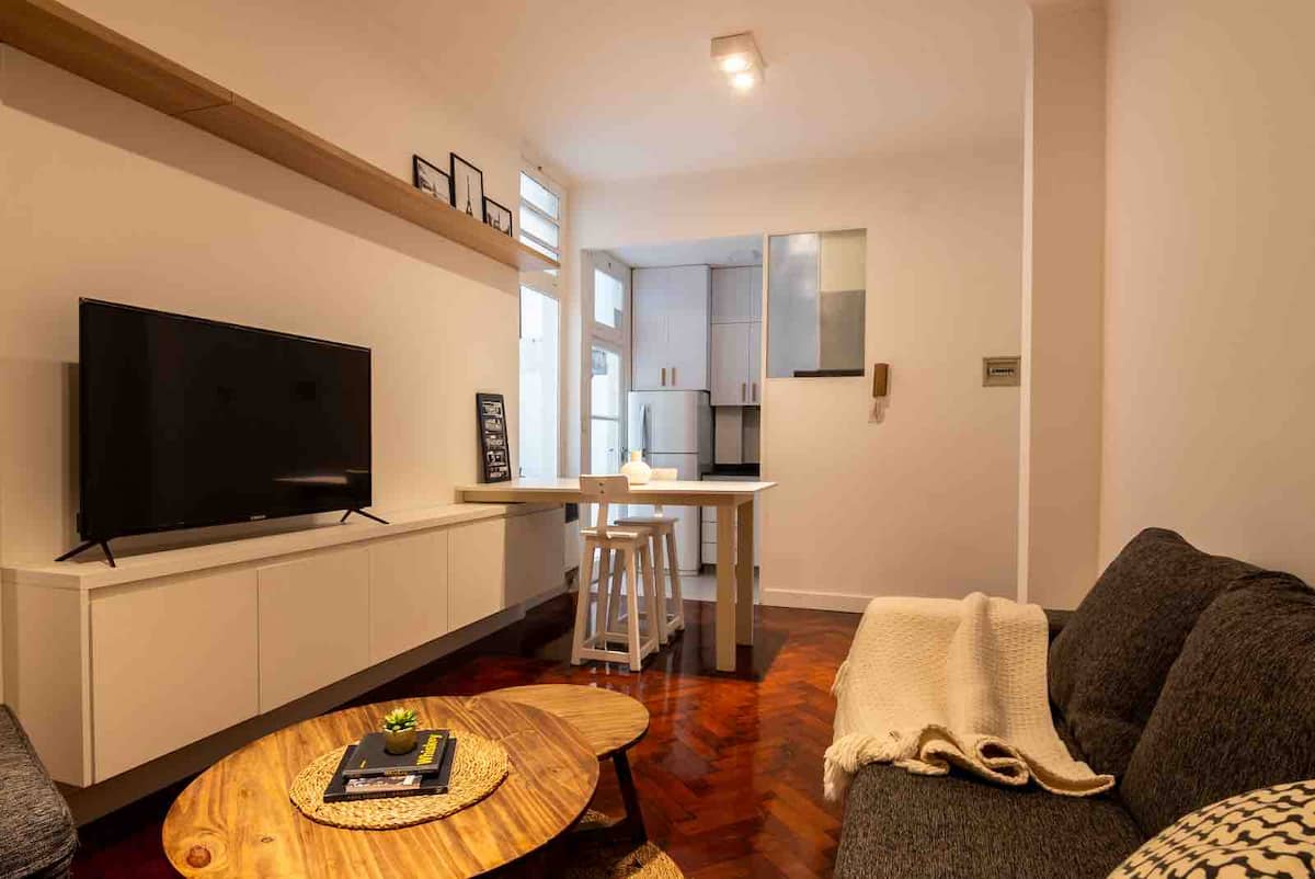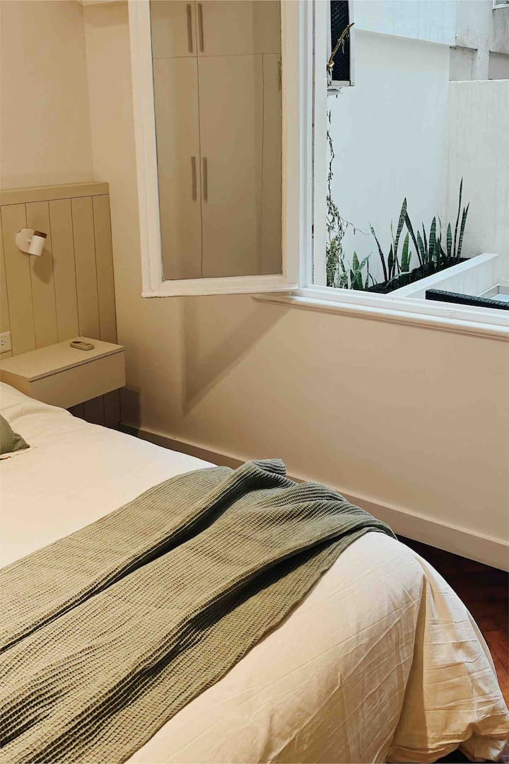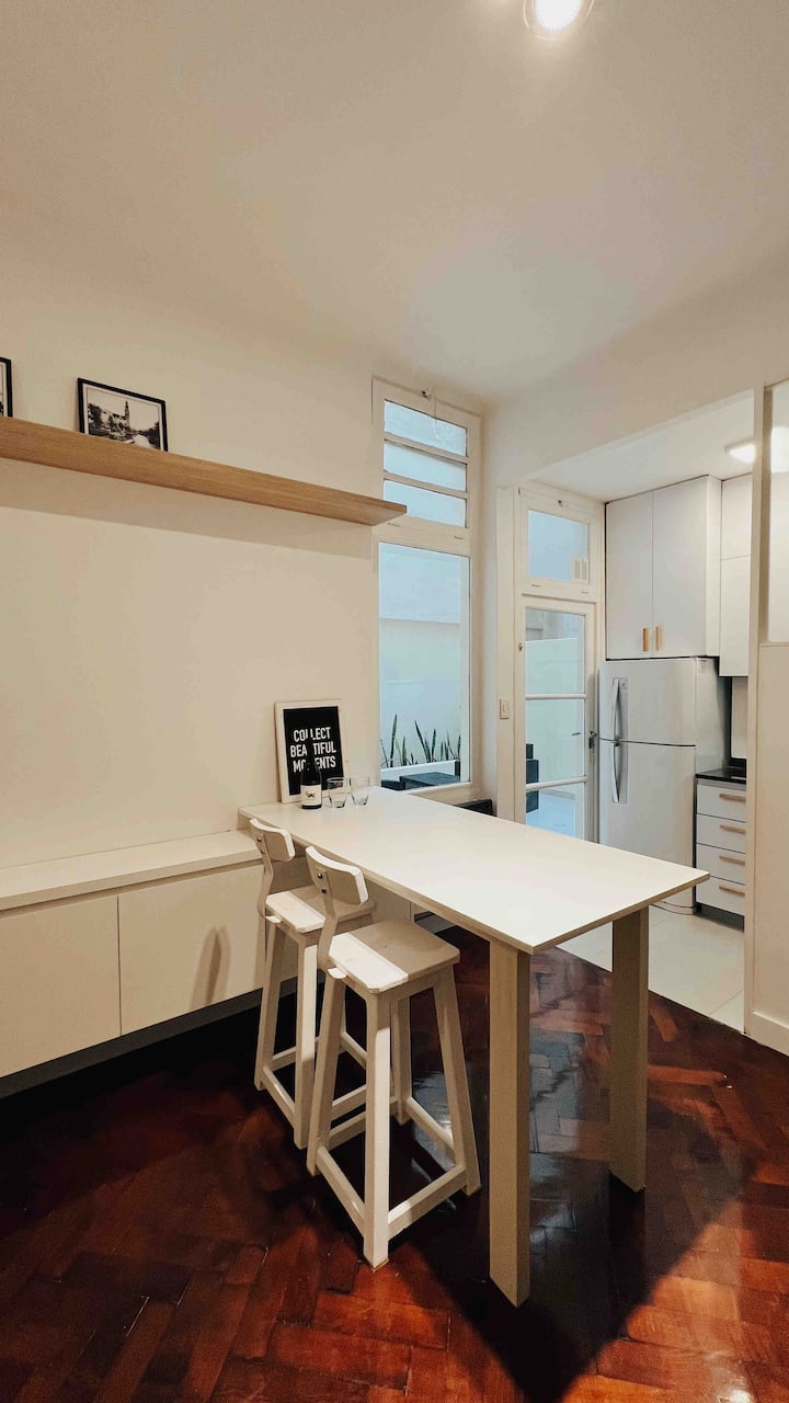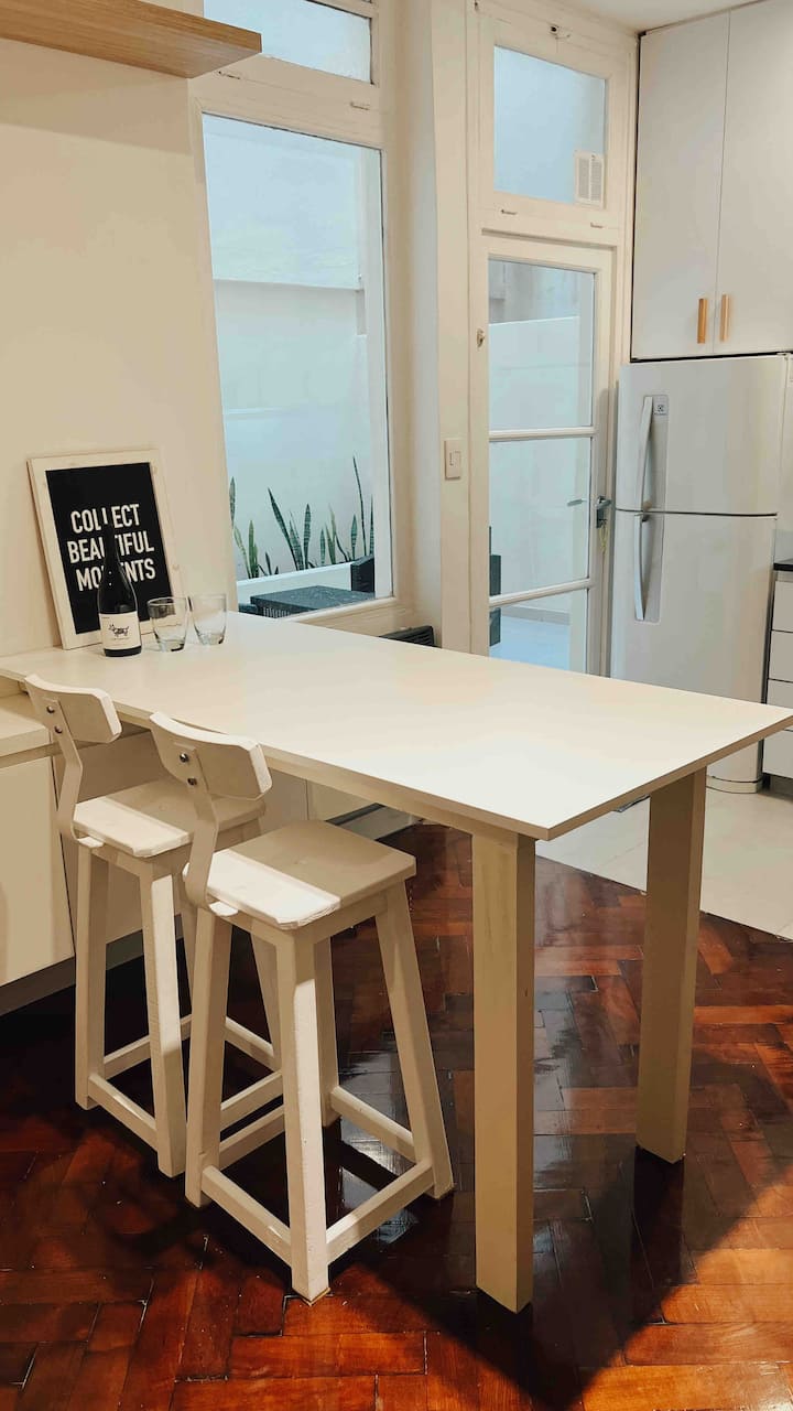 Apartamento de 50 m² no térreo, reformado, com cozinha equipada, banheiro completo e 1 dormitório com ar-condicionado (quente/frio). Há um escritório no dormitório e um sofá que pode ser usado por uma terceira pessoa sem custo adicional. Conta com pátio e área externa. Fica a meio quarteirão da Av. Cabildo, a 50 m da parada de ônibus e a 2 quadras da estação de metrô; há mercado e lavanderia em frente ao imóvel.