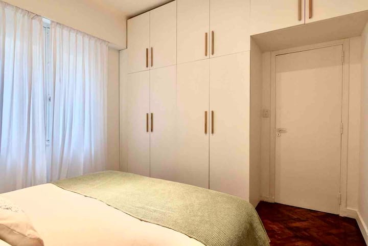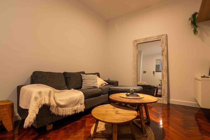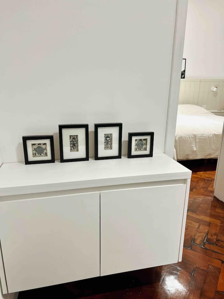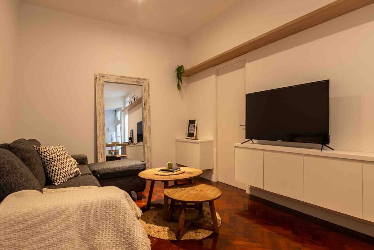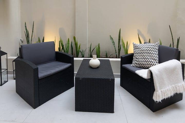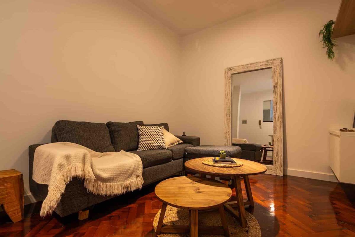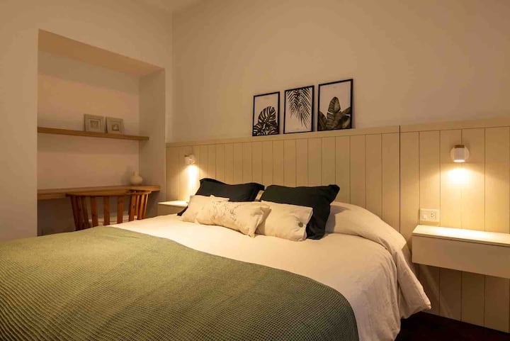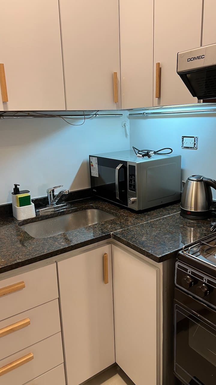 Apartamento de 50 m² no térreo, reformado, com cozinha equipada, banheiro completo e 1 dormitório com ar-condicionado (quente/frio). Há um escritório no dormitório e um sofá que pode ser usado por uma terceira pessoa sem custo adicional. Conta com pátio e área externa. Fica a meio quarteirão da Av. Cabildo, a 50 m da parada de ônibus e a 2 quadras da estação de metrô; há mercado e lavanderia em frente ao imóvel.