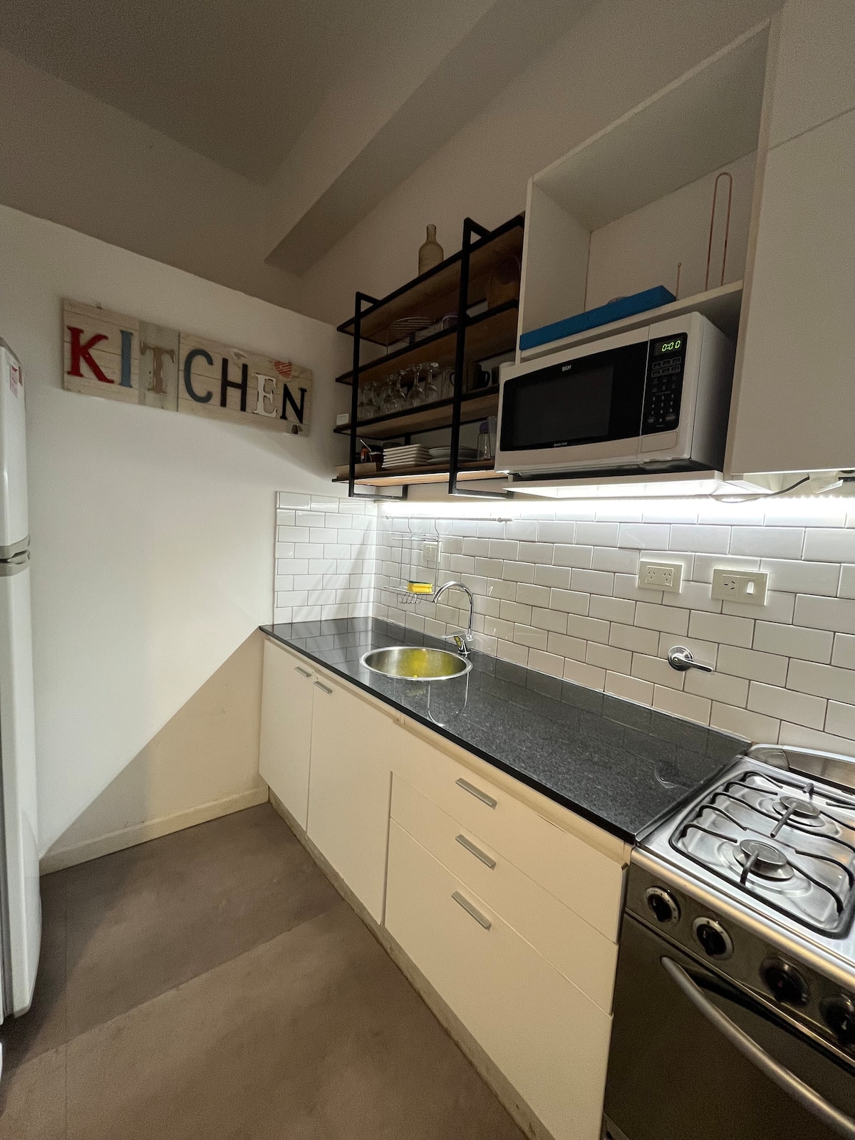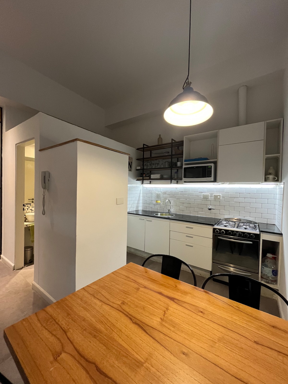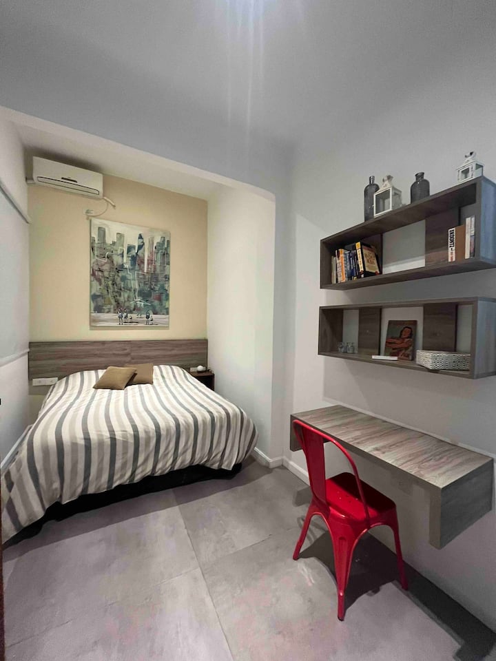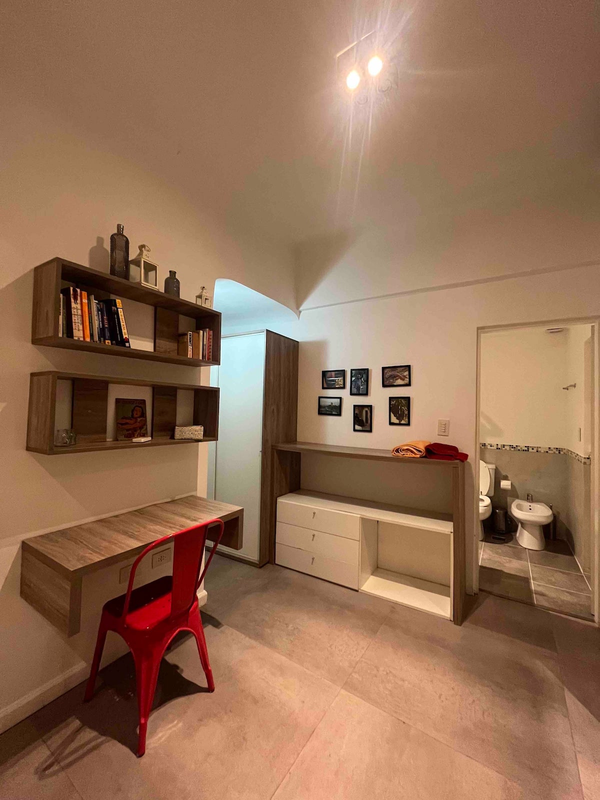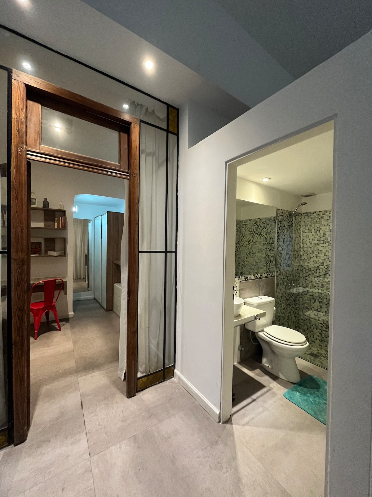 Apartamento em PH em Palermo, com 1 quarto e 2 banheiros completos. A unidade tem um grande ambiente com área de trabalho e banheiro privativo. A sala inclui sofá-cama e banheiro. Cozinha completa com geladeira e micro-ondas.