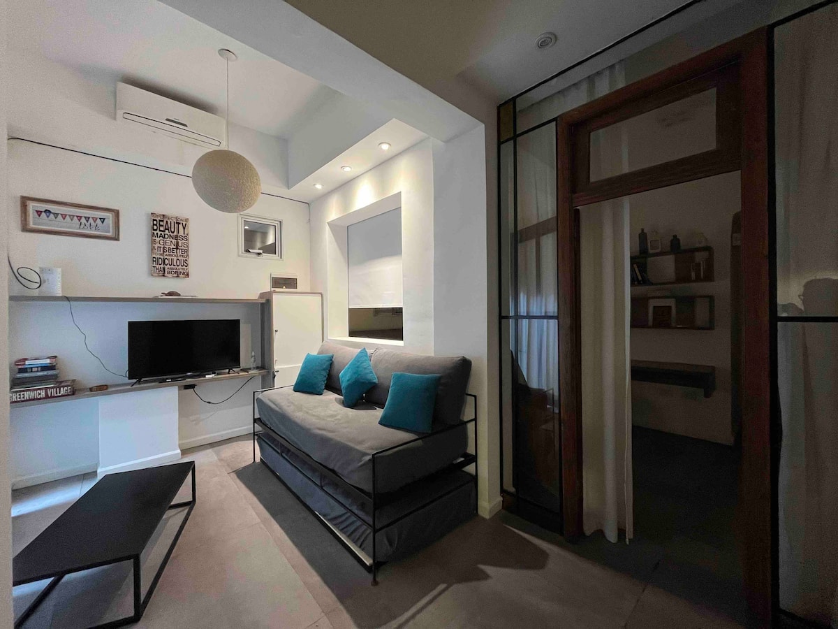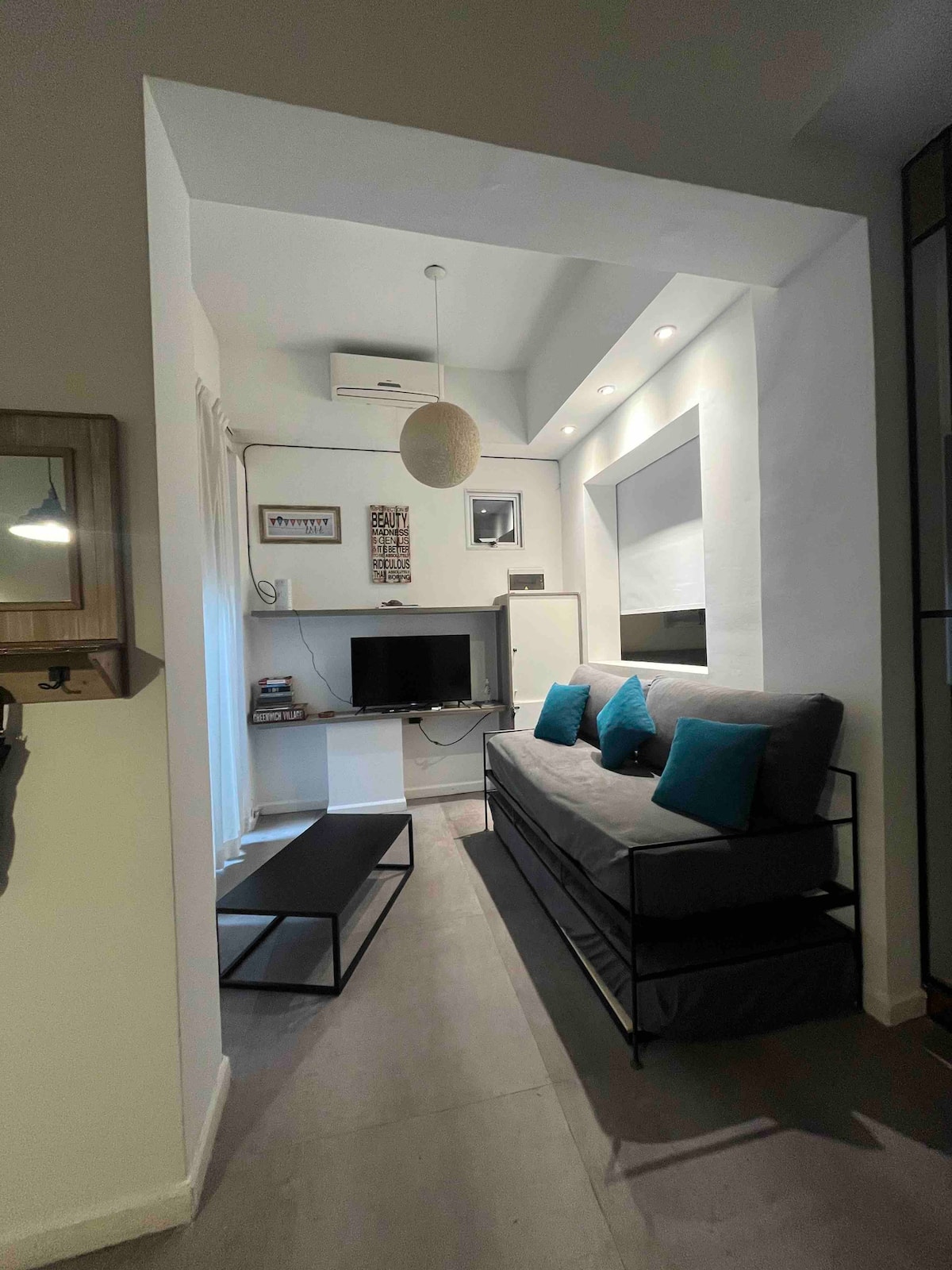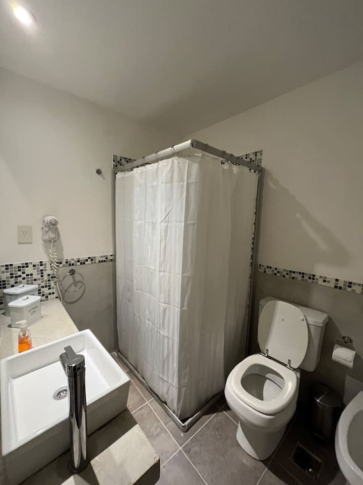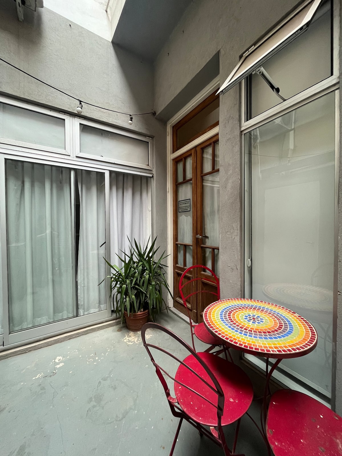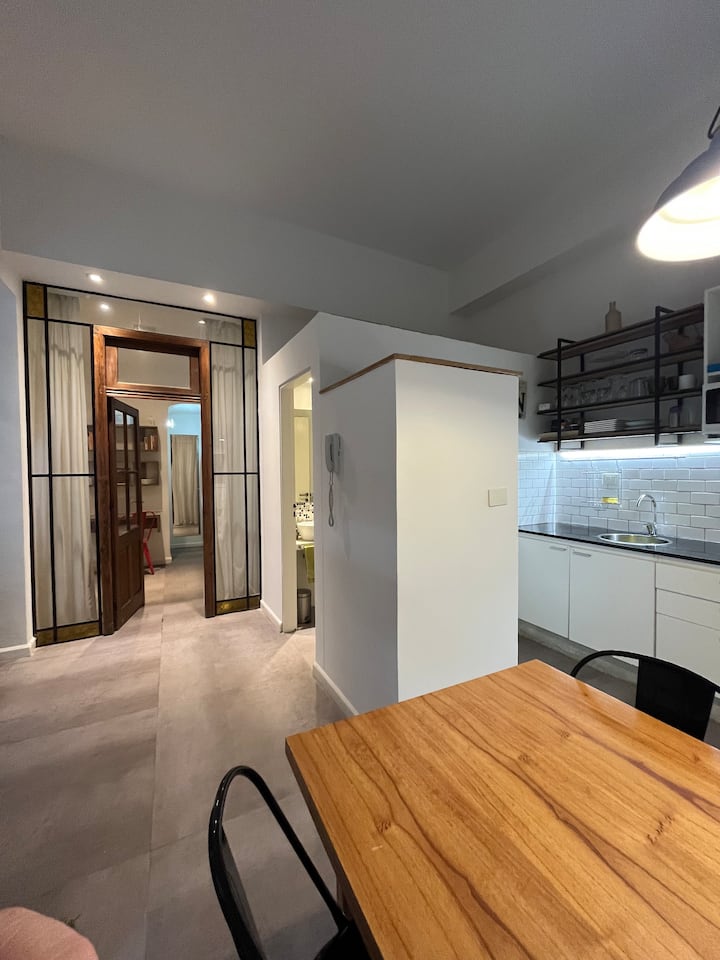 Apartamento em PH em Palermo, com 1 quarto e 2 banheiros completos. A unidade tem um grande ambiente com área de trabalho e banheiro privativo. A sala inclui sofá-cama e banheiro. Cozinha completa com geladeira e micro-ondas.