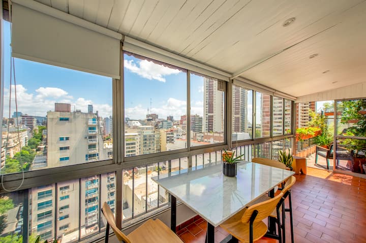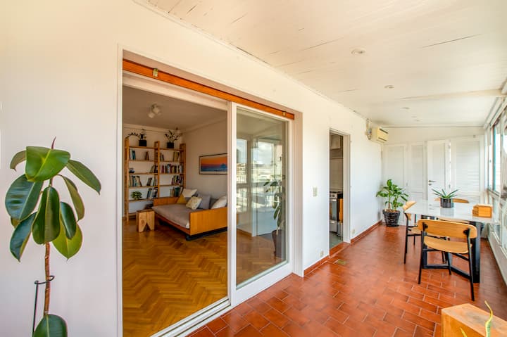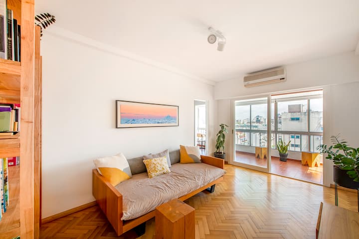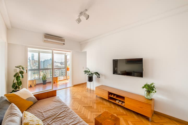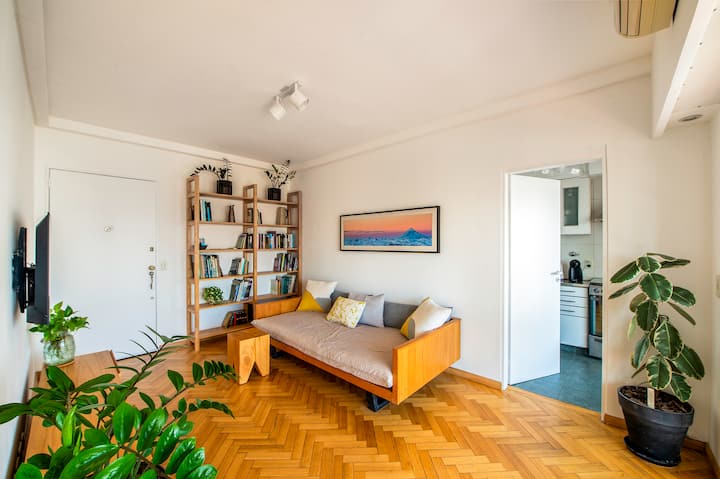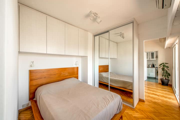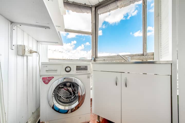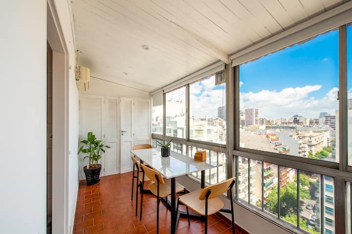 Apartamento de dois ambientes com 1 quarto, em andar alto, com vista. Inclui varanda com toldo deslizante e ar-condicionado. Tem máquina de lavar dentro do apartamento, mobiliado e equipado, além de cortinas blackout na sala e no quarto para escurecer os ambientes.