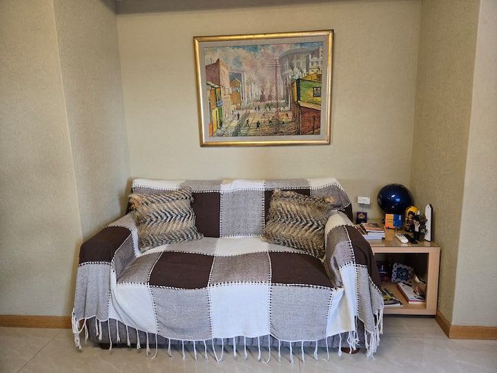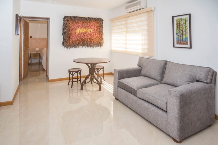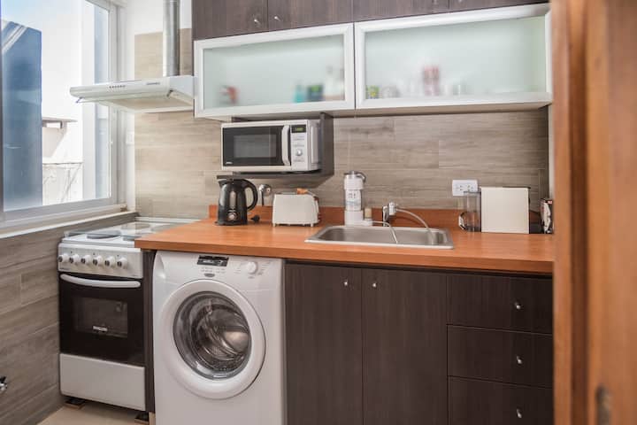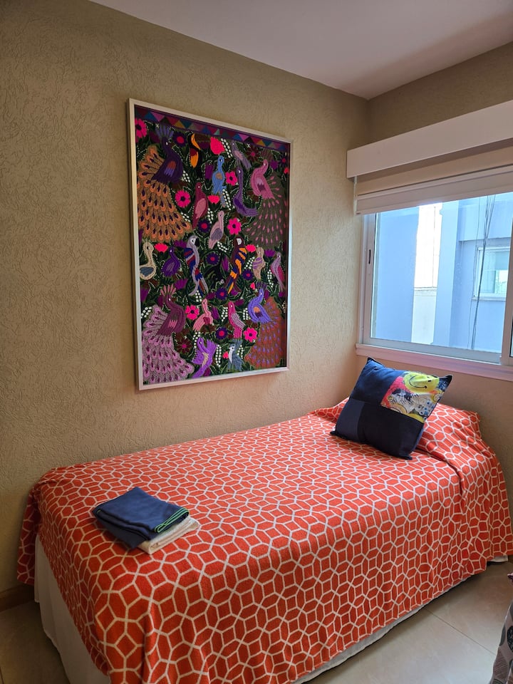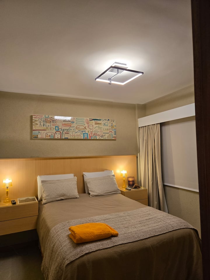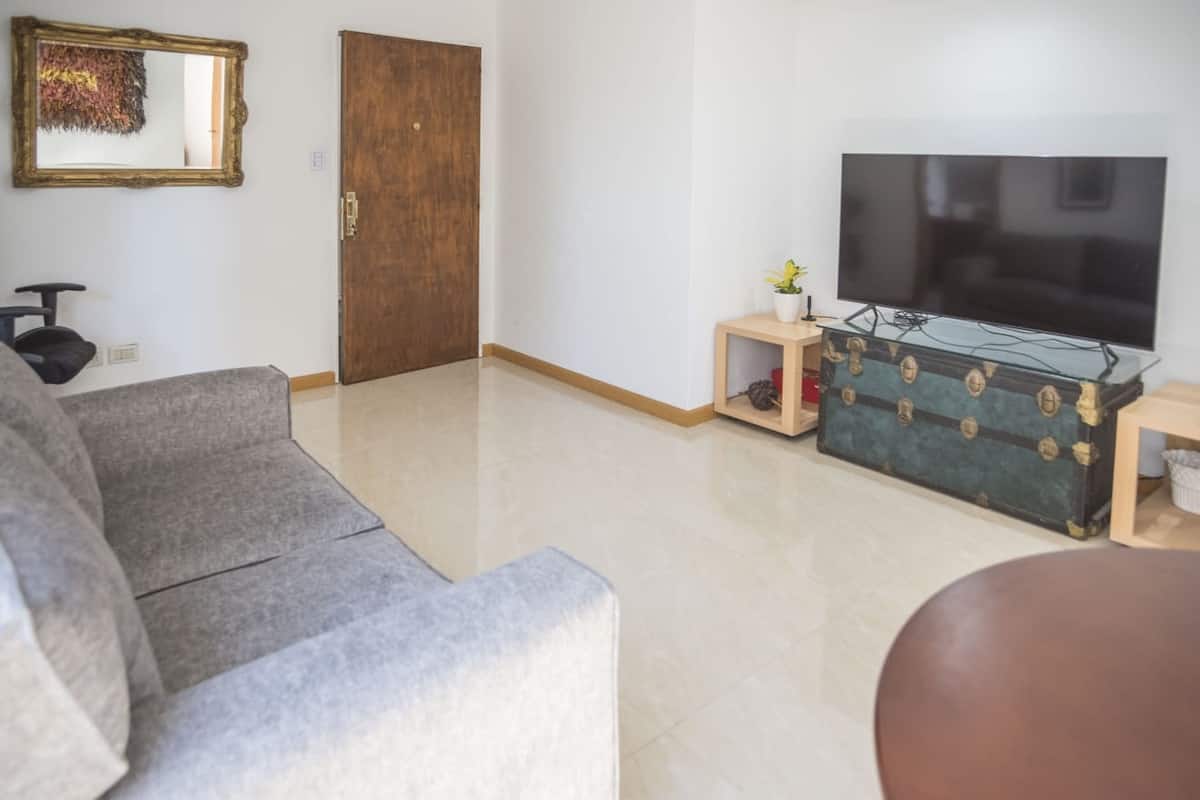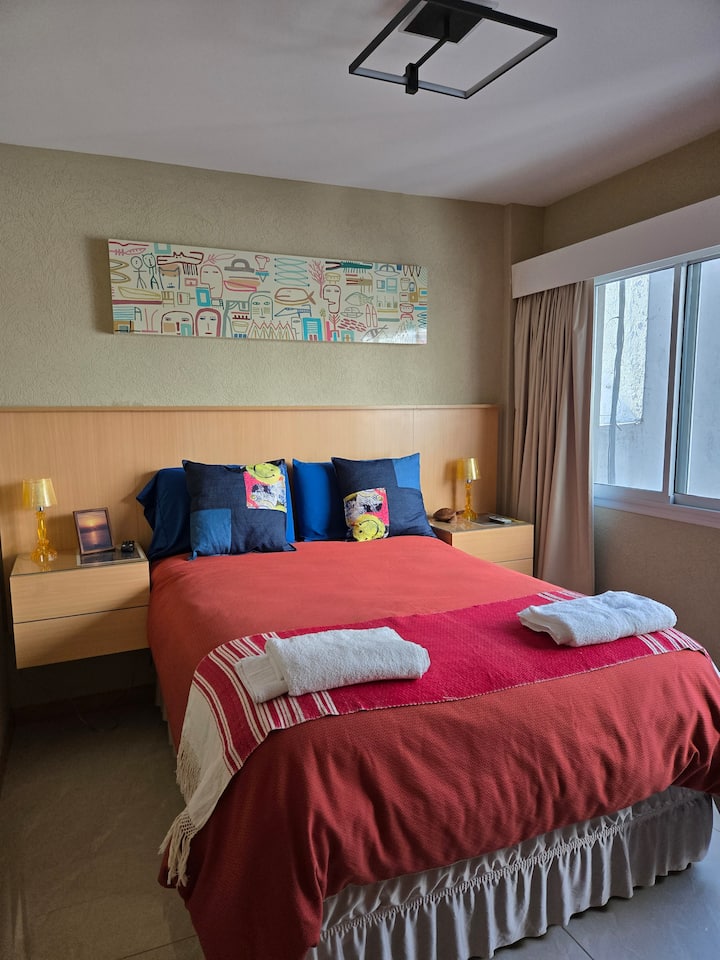 Apartamento em Palermo com 1 quarto. A unidade tem obra de arte personalizada assinada por Milo Locket. O anúncio indica que a propriedade é eco friendly e sustentável. Há fornecimento de roupa de cama extra após 7 noites.