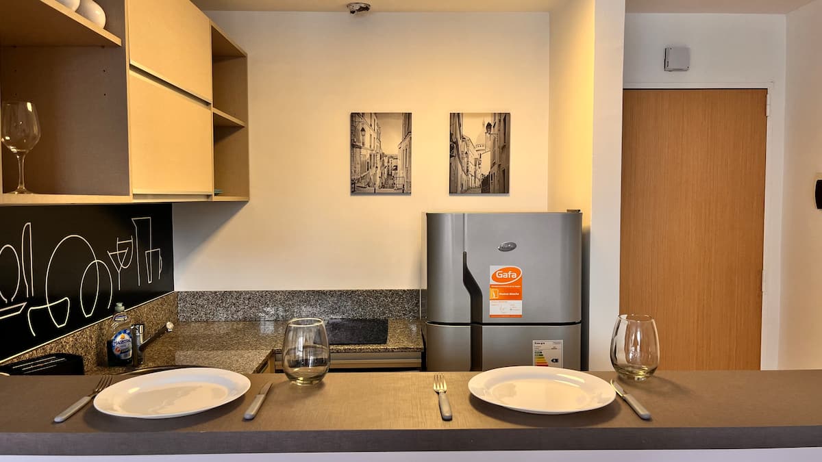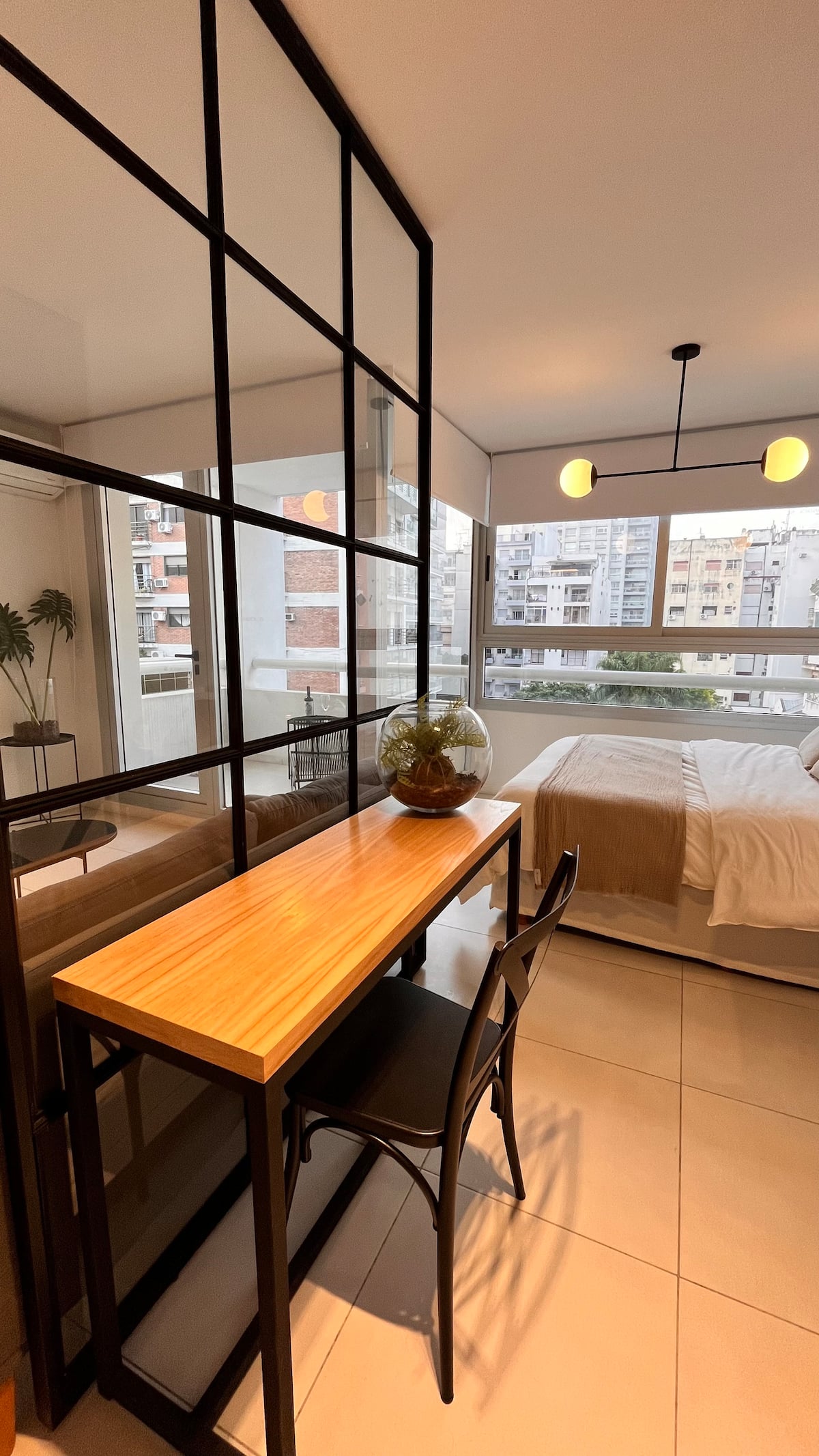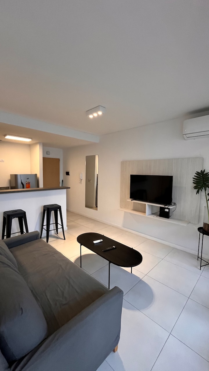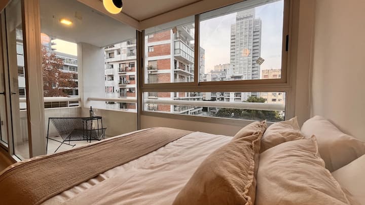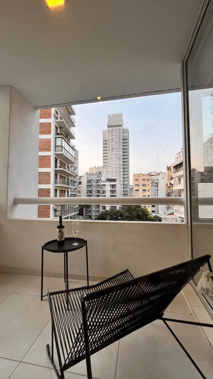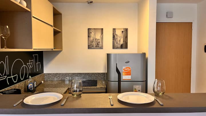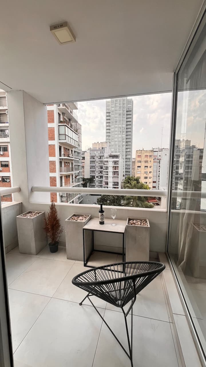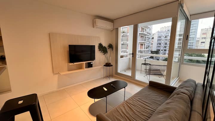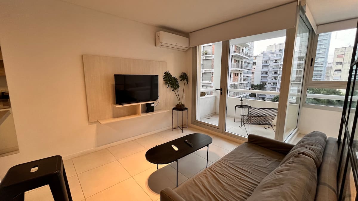 Apartamento novo em Palermo Soho, com cozinha completa e varanda. A unidade tem 1 quarto com cama queen, sala com TV de 43 polegadas e área de trabalho com mesa. A cozinha é equipada para preparo de refeições.