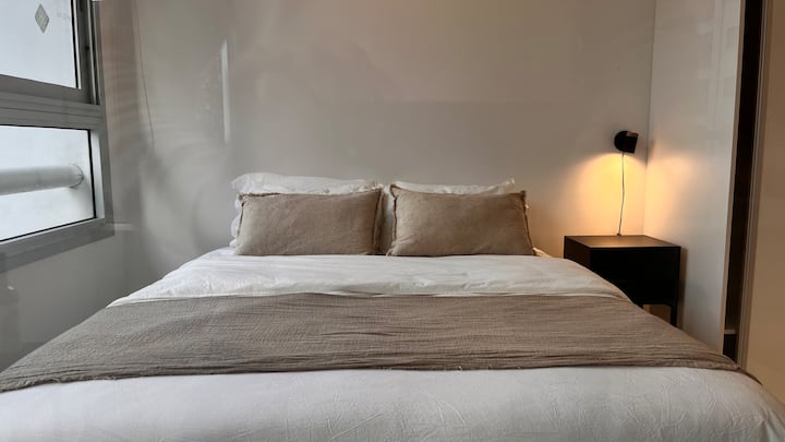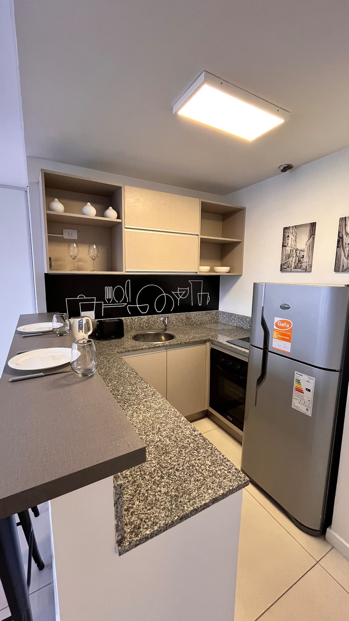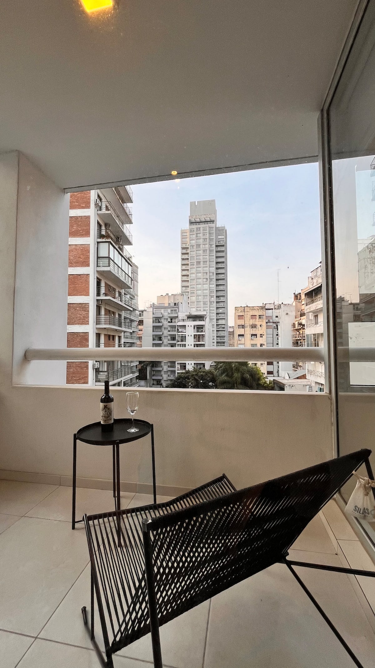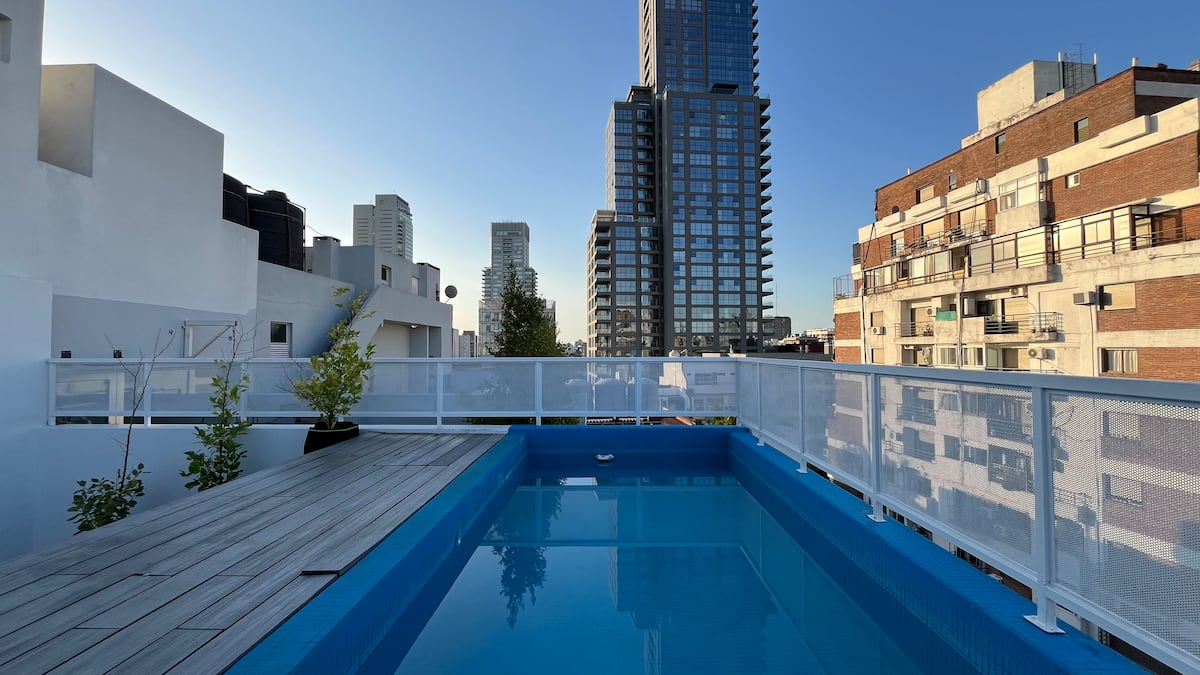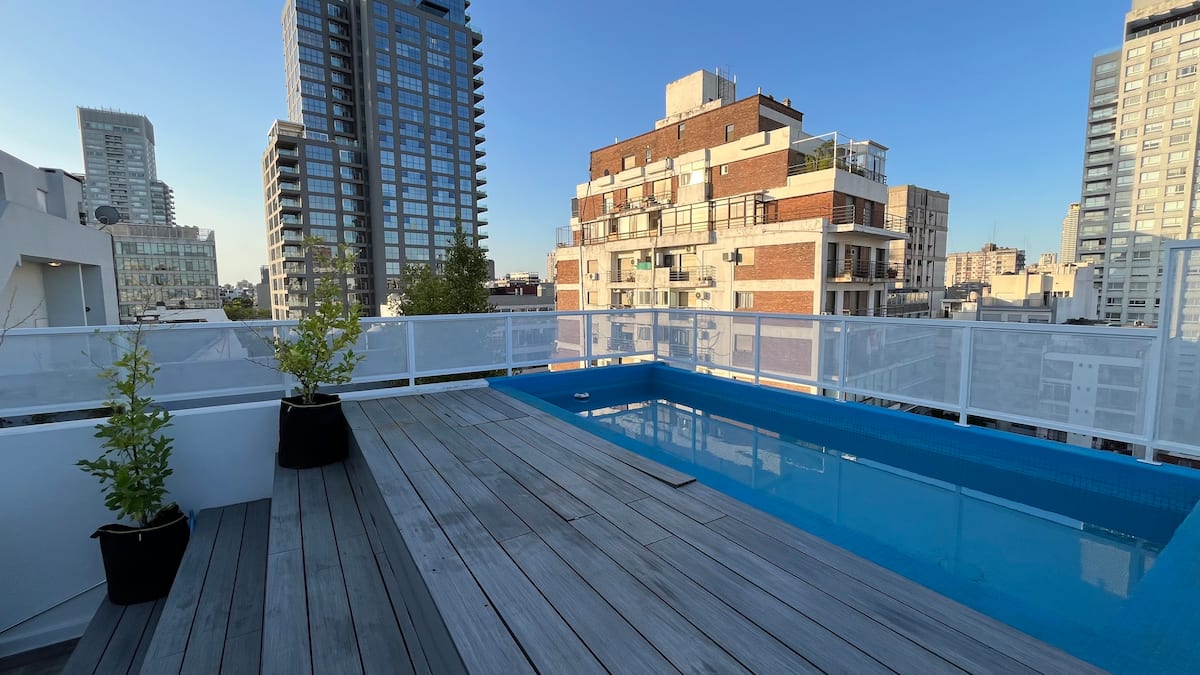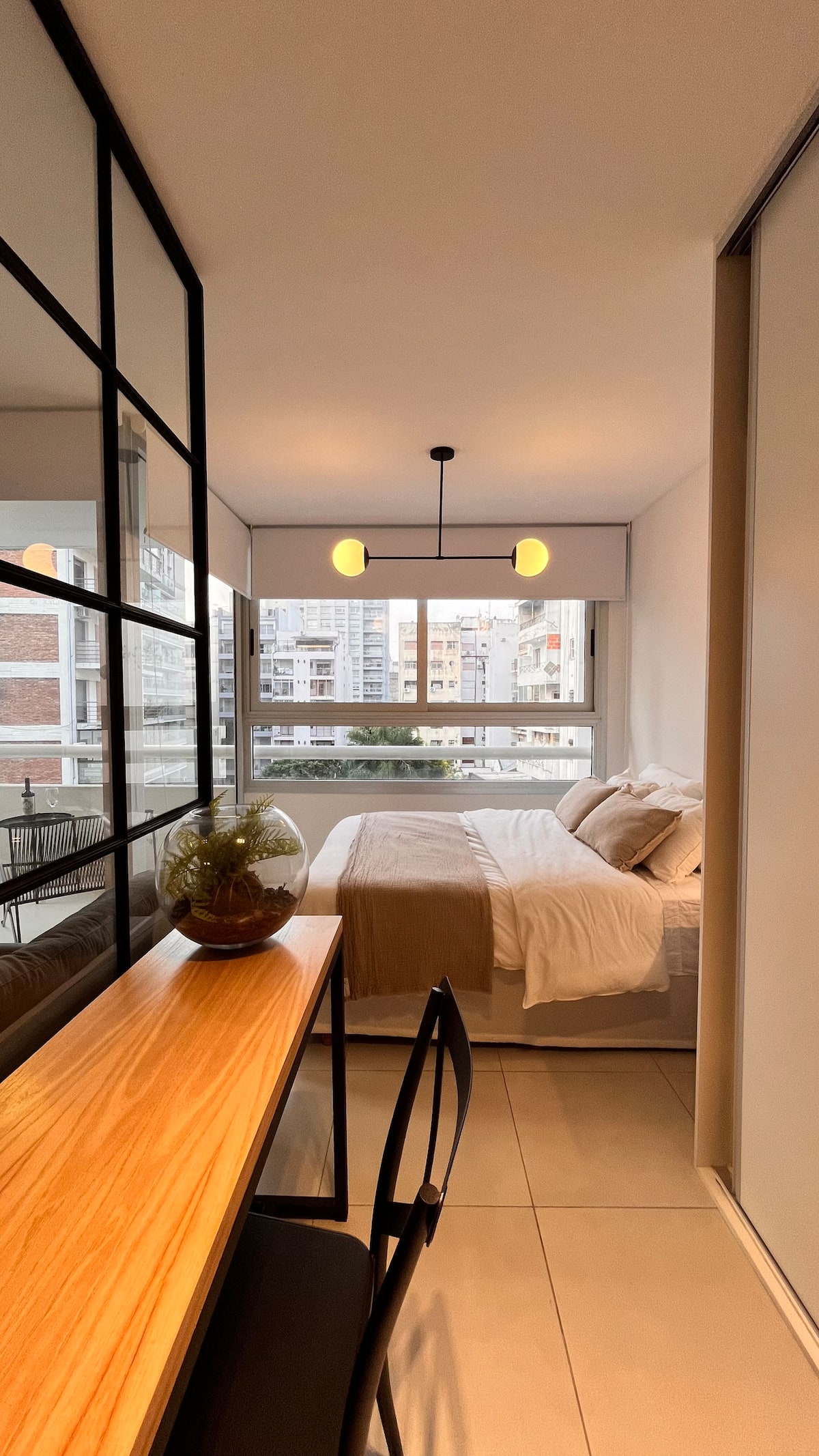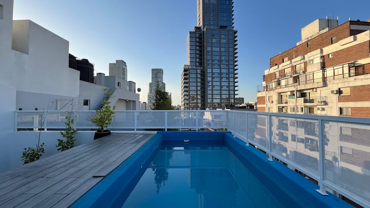 Apartamento novo em Palermo Soho, com cozinha completa e varanda. A unidade tem 1 quarto com cama queen, sala com TV de 43 polegadas e área de trabalho com mesa. A cozinha é equipada para preparo de refeições.