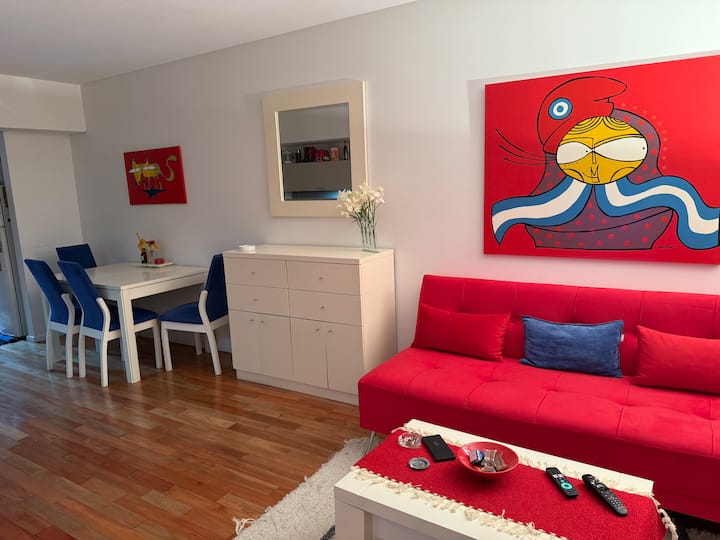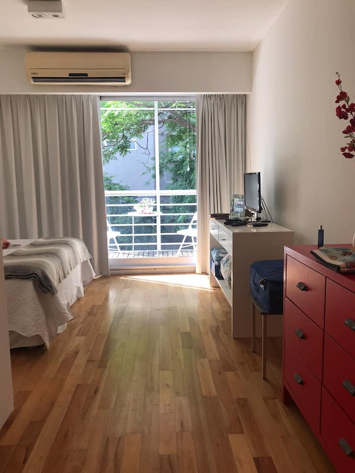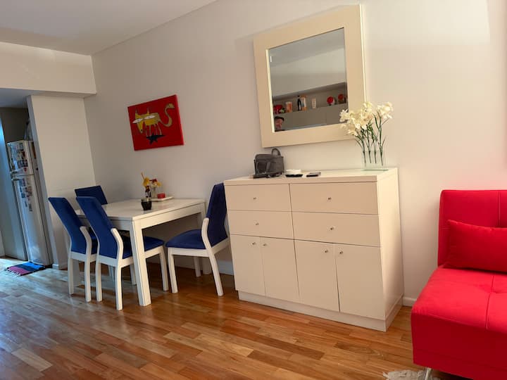 Kitnet em Palermo, com 1 dormitório. O anúncio menciona acesso a piscina, sauna e academia no condomínio. O texto também indica que a região é friendly para pessoas LGBTQIA+.
