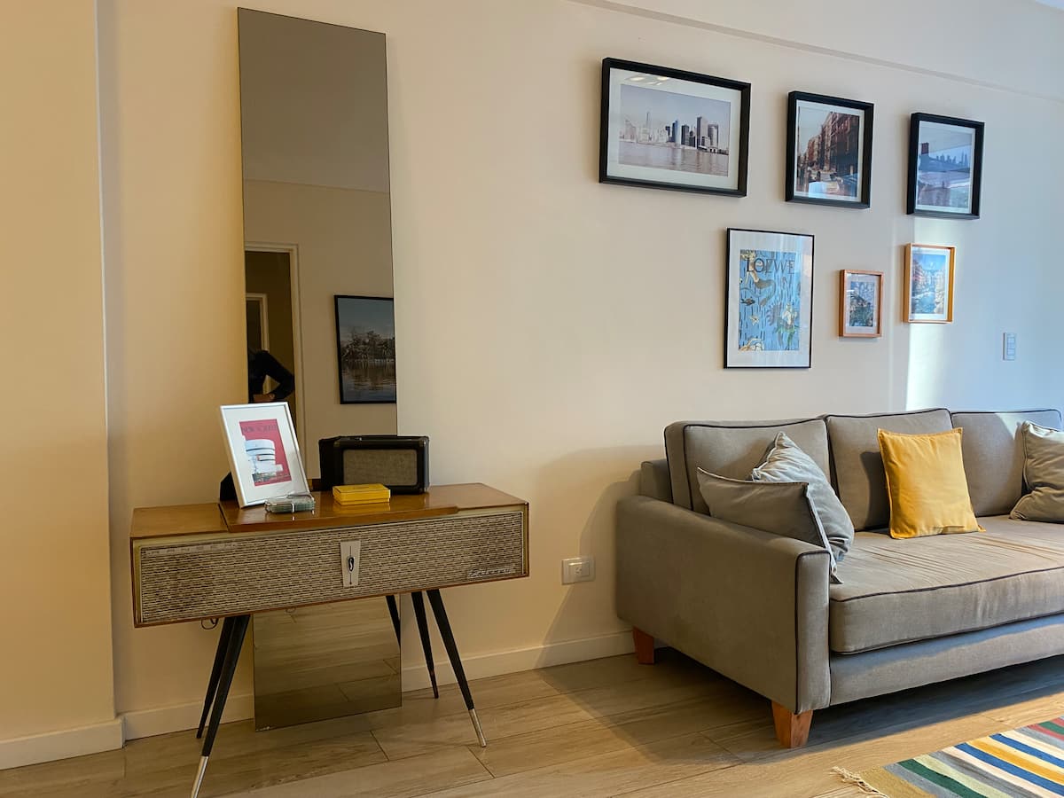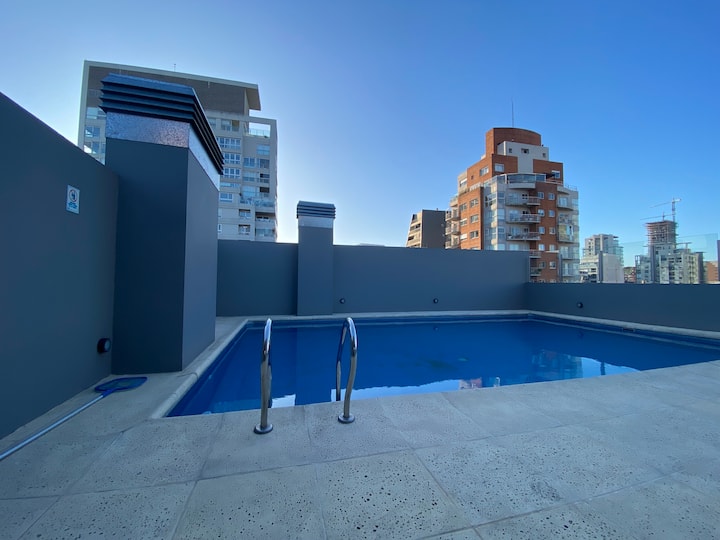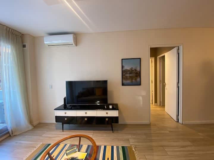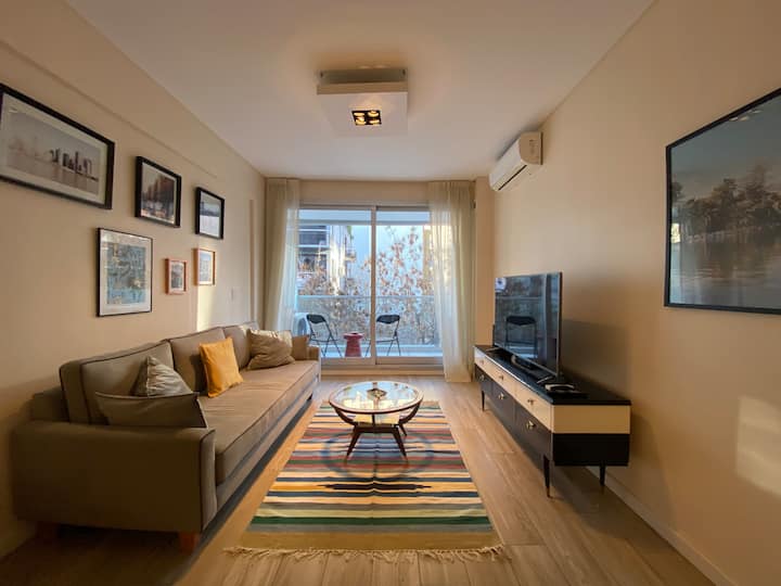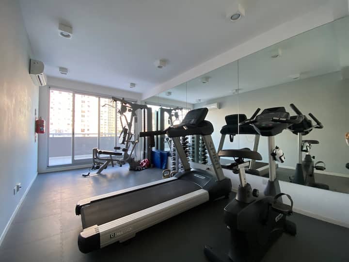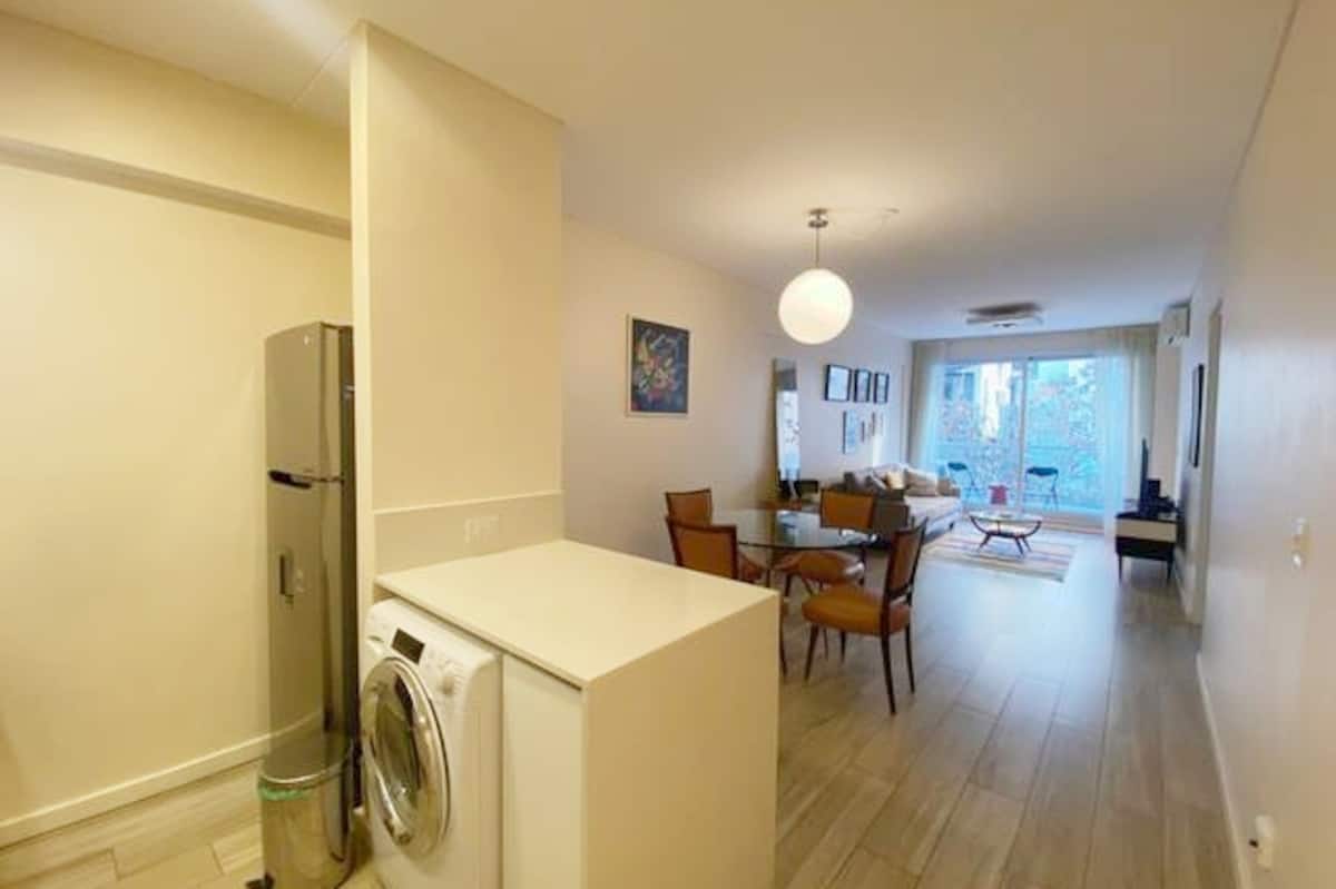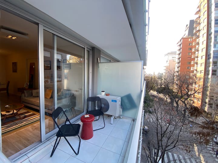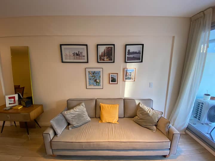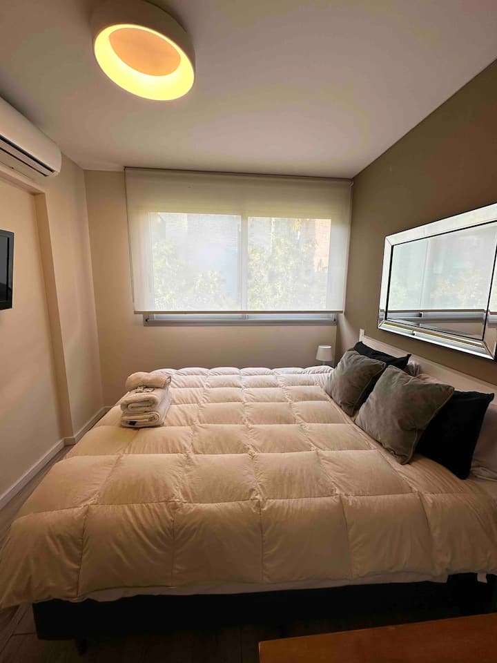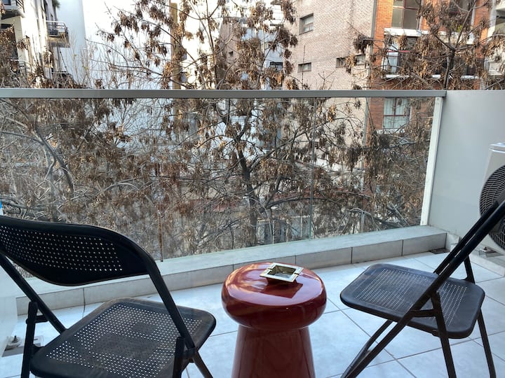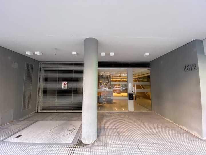 Apartamento novo em uma torre em Palermo, com 1 quarto, closet, 1 banheiro, 1 lavabo e varanda de frente para a rua. O prédio tem 2 anos, com academia, piscina e área de churrasco. A localização fica entre as Av. Santa Fe e Av. Libertador.