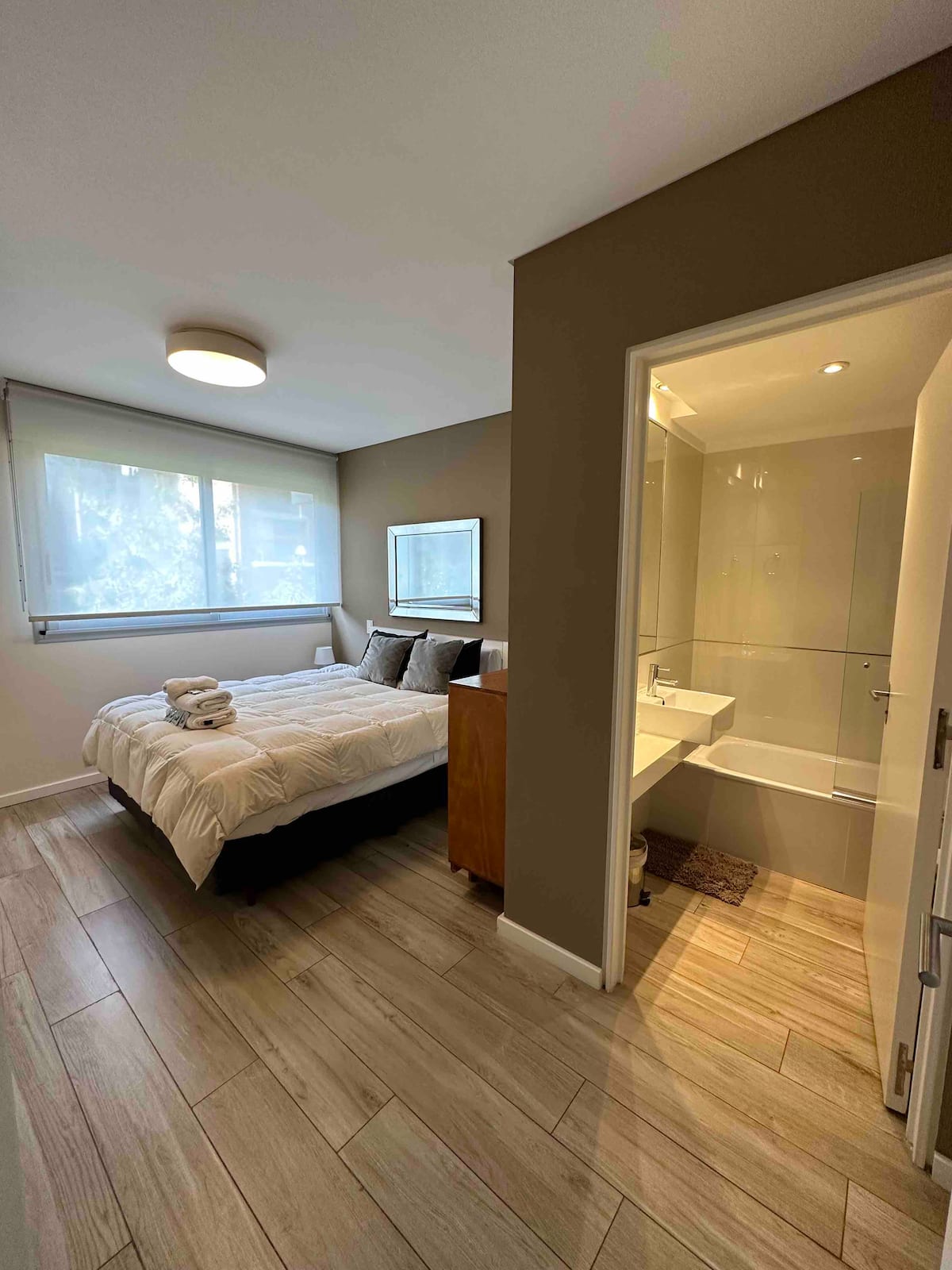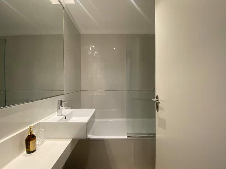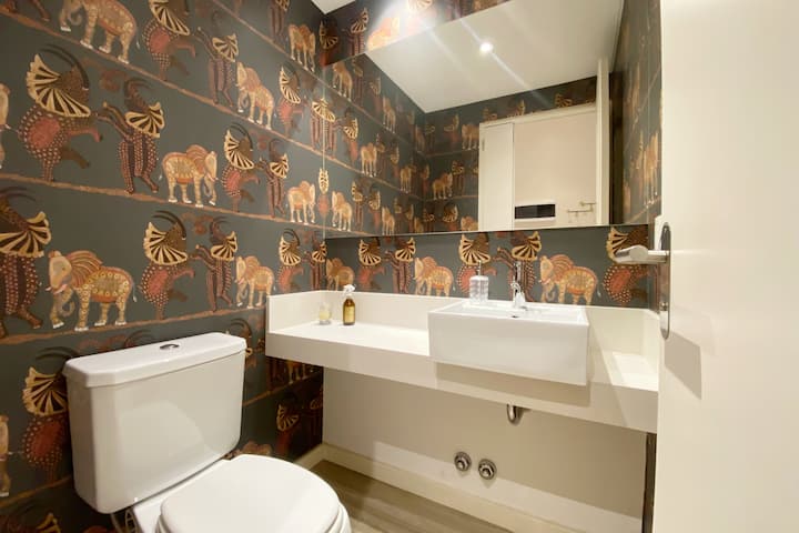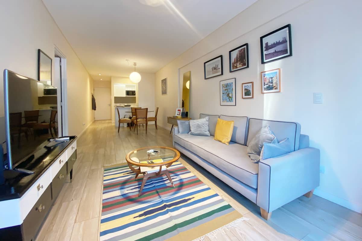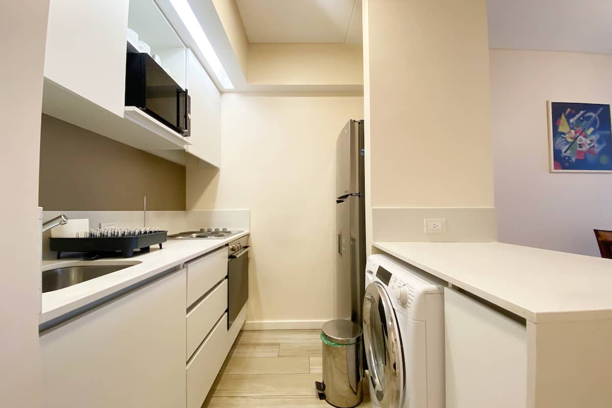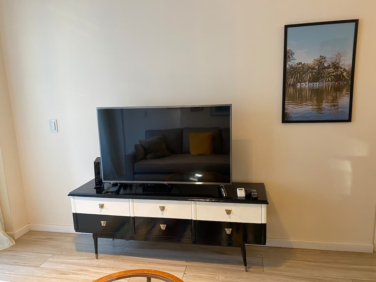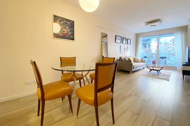 Apartamento novo em uma torre em Palermo, com 1 quarto, closet, 1 banheiro, 1 lavabo e varanda de frente para a rua. O prédio tem 2 anos, com academia, piscina e área de churrasco. A localização fica entre as Av. Santa Fe e Av. Libertador.